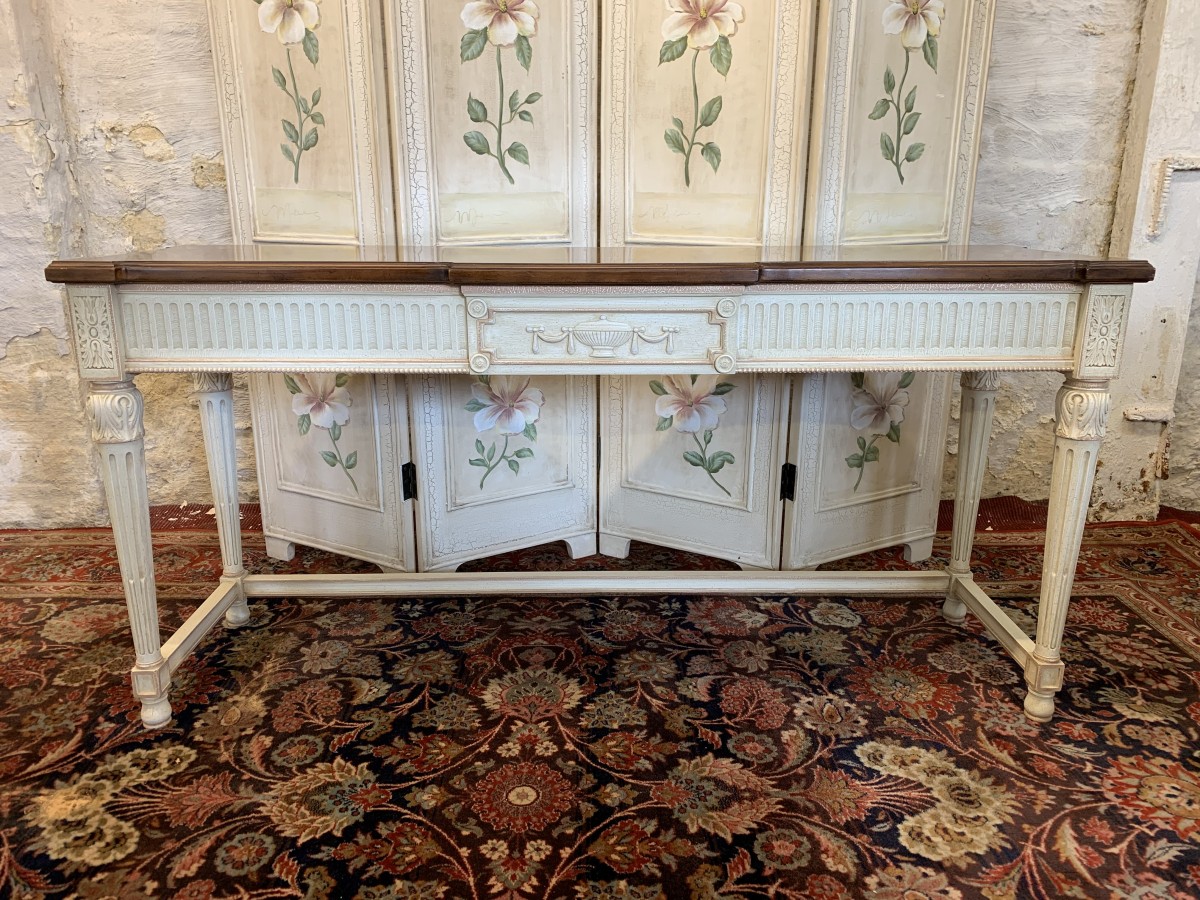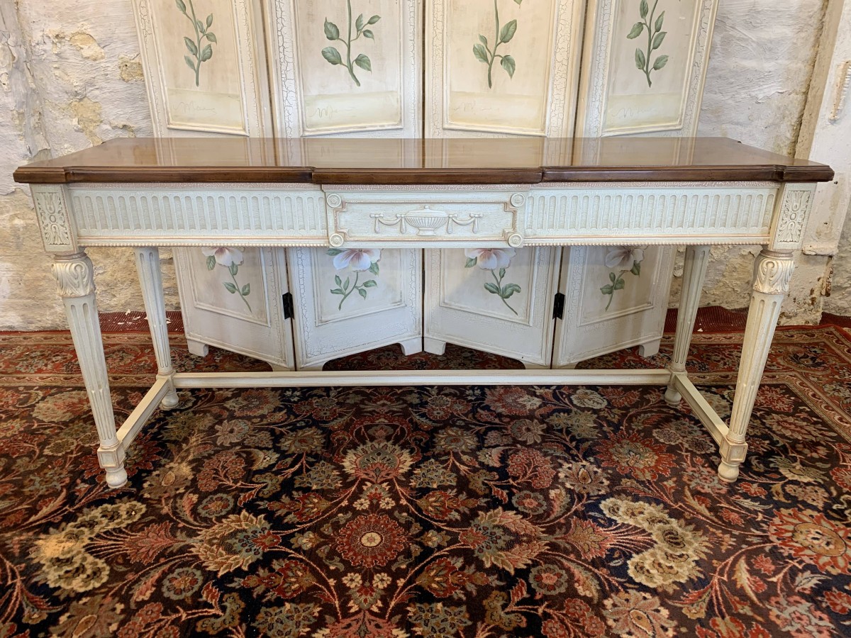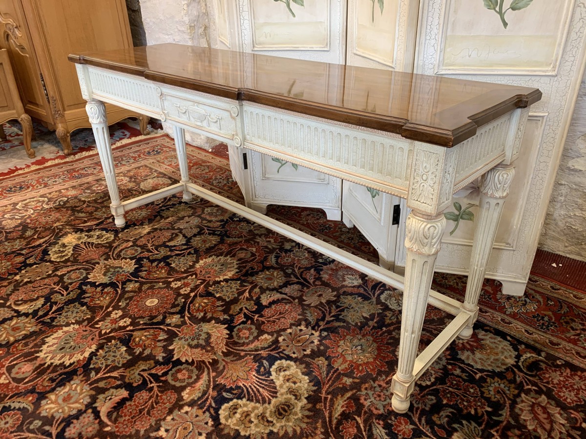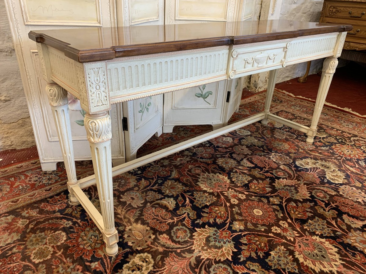This fantastic console table has a white base and a shaped walnut top. Carved “Adams” style decoration to the front and sides,four carved turned legs conected by side and back stretcher and standing on four turned feet.