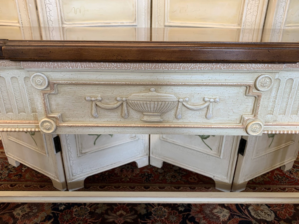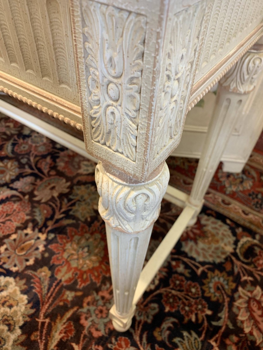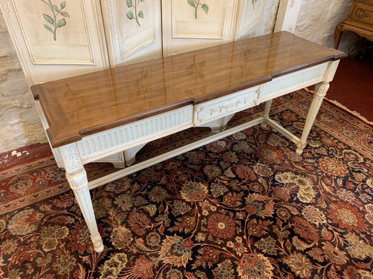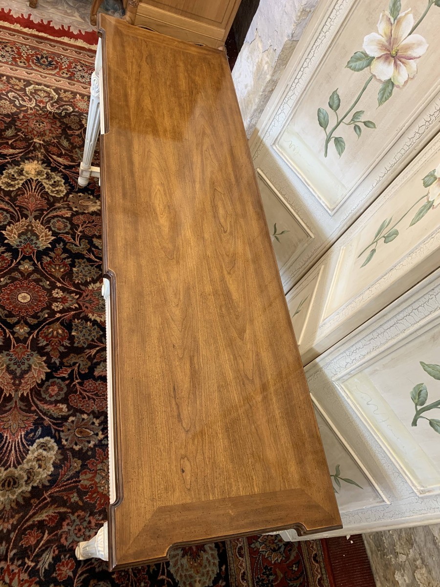 This fantastic console table has a white base and a shaped walnut top. Carved “Adams” style decoration to the front and sides,four carved turned legs conected by side and back stretcher and standing on four turned feet.