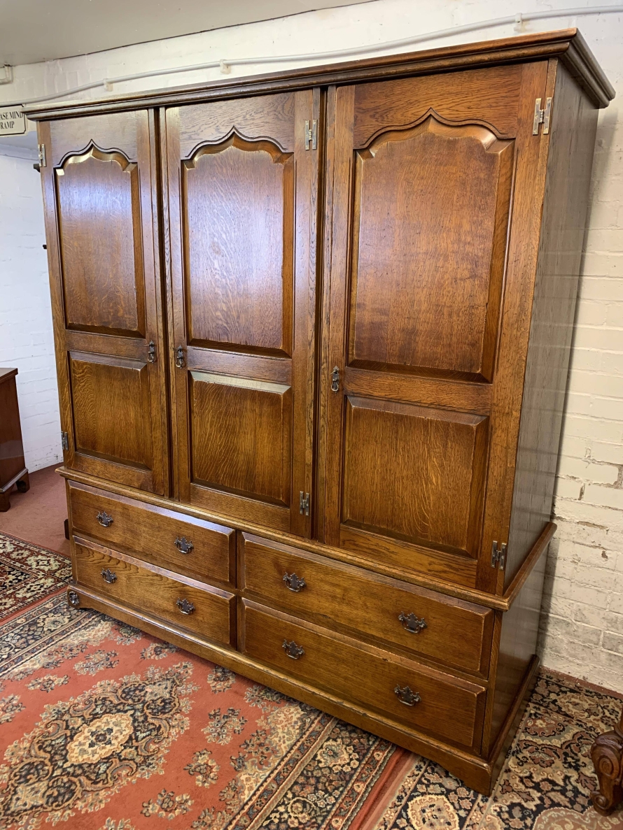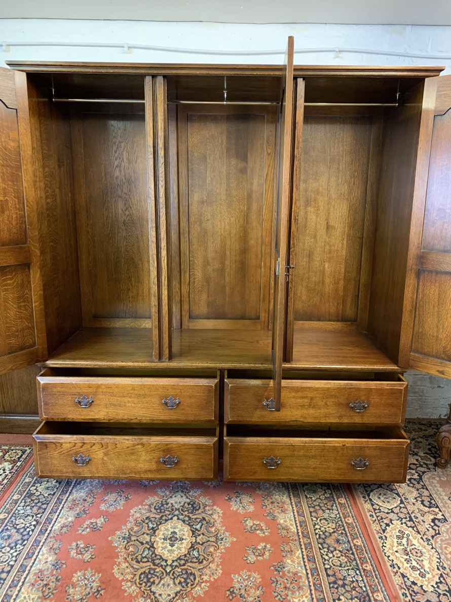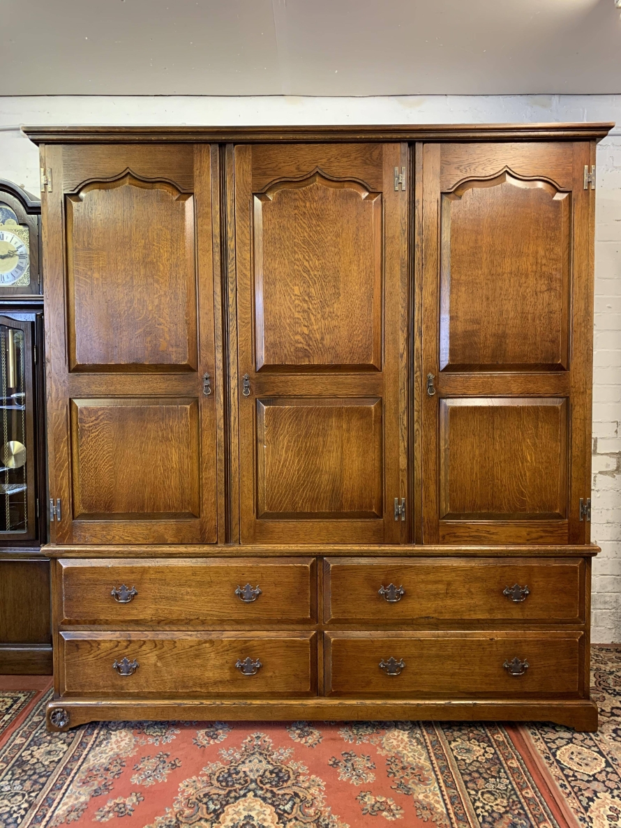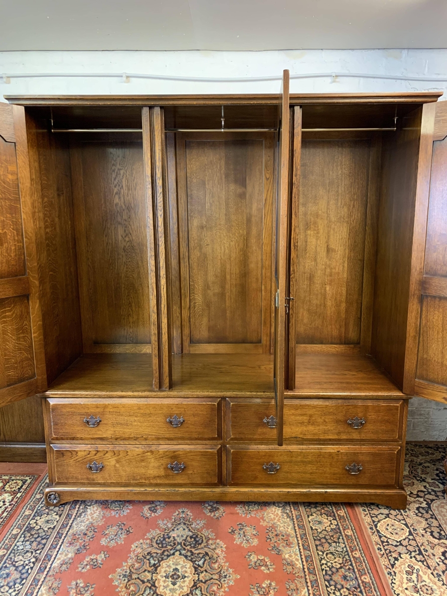 A great quality oak wardrobe made by the renowned “Royal oak” furniture company is part of the Balmoral range which is currently in production and made of the best quality oak. This traditionally crafted wardrobe is in excellent condition. The oversailing top sits above three shaped recessed panelled lockable doors, each door having traditional “H” hinges, drop-down handle and key. The doors open to reveal a full length brass hanging rail, offering ample storage. Below are four deep drawers, each drawer having a pair of brass handles. This super wardrobe sits on a platform base and has the English Rose carved in the base, a trademark of Royal Oak Furniture.