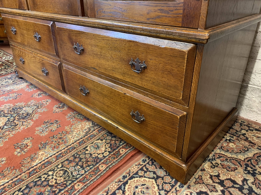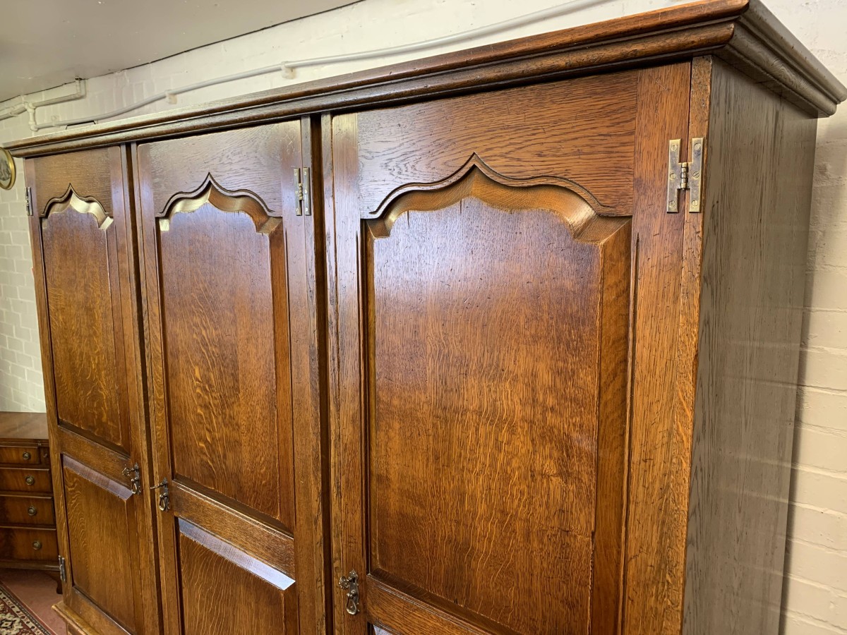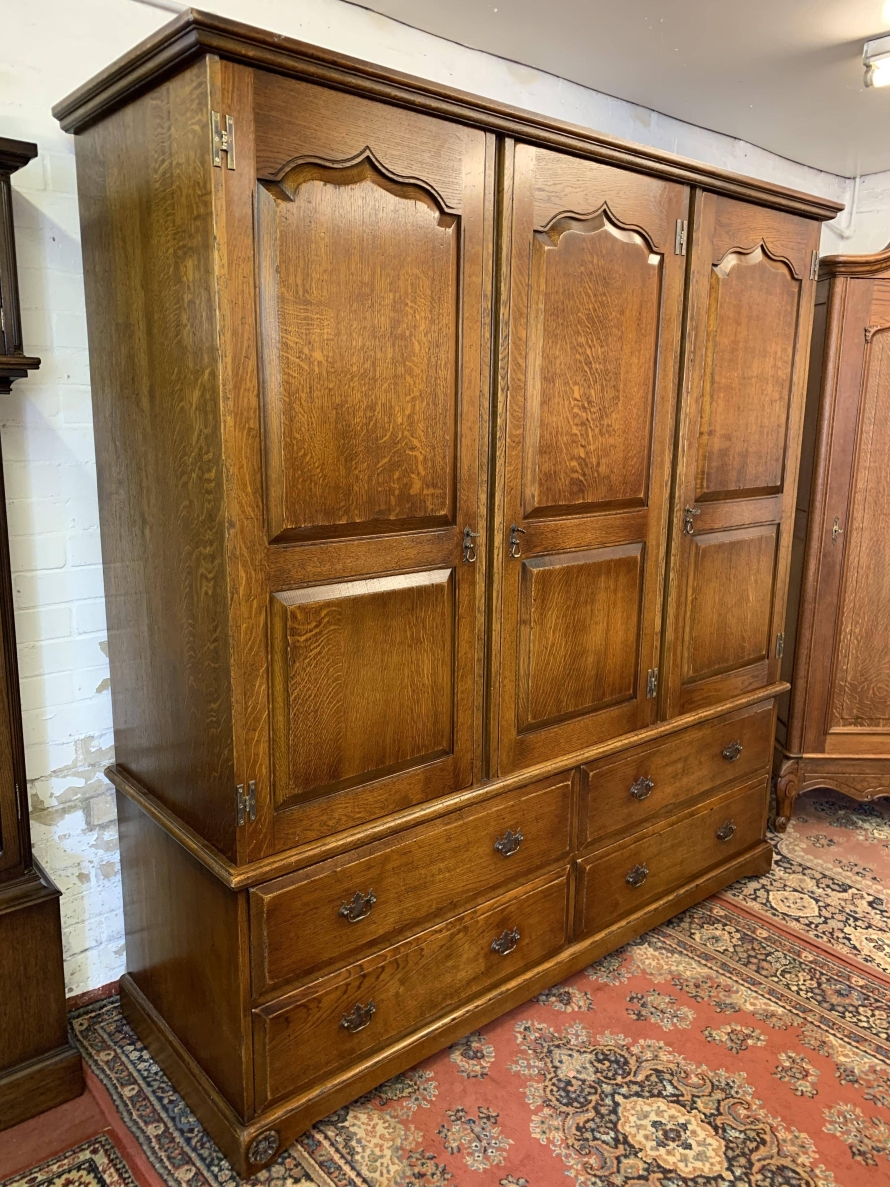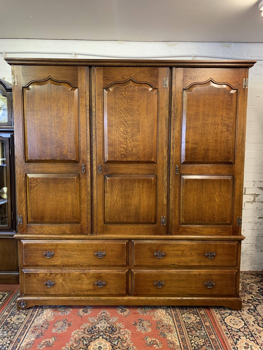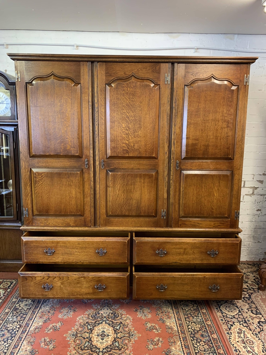 A great quality oak wardrobe made by the renowned “Royal oak” furniture company is part of the Balmoral range which is currently in production and made of the best quality oak. This traditionally crafted wardrobe is in excellent condition. The oversailing top sits above three shaped recessed panelled lockable doors, each door having traditional “H” hinges, drop-down handle and key. The doors open to reveal a full length brass hanging rail, offering ample storage. Below are four deep drawers, each drawer having a pair of brass handles. This super wardrobe sits on a platform base and has the English Rose carved in the base, a trademark of Royal Oak Furniture.