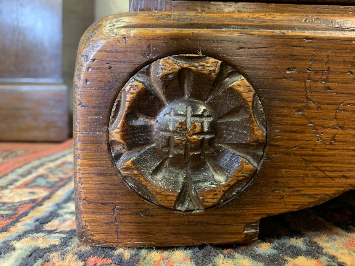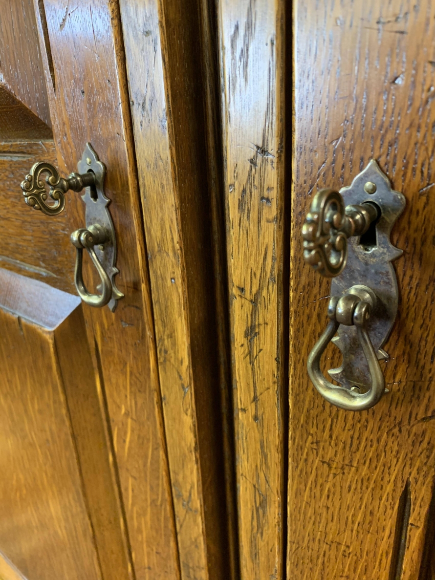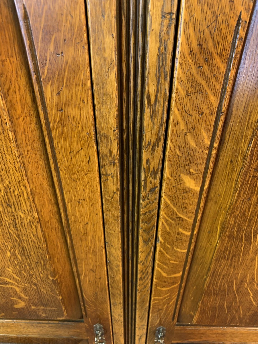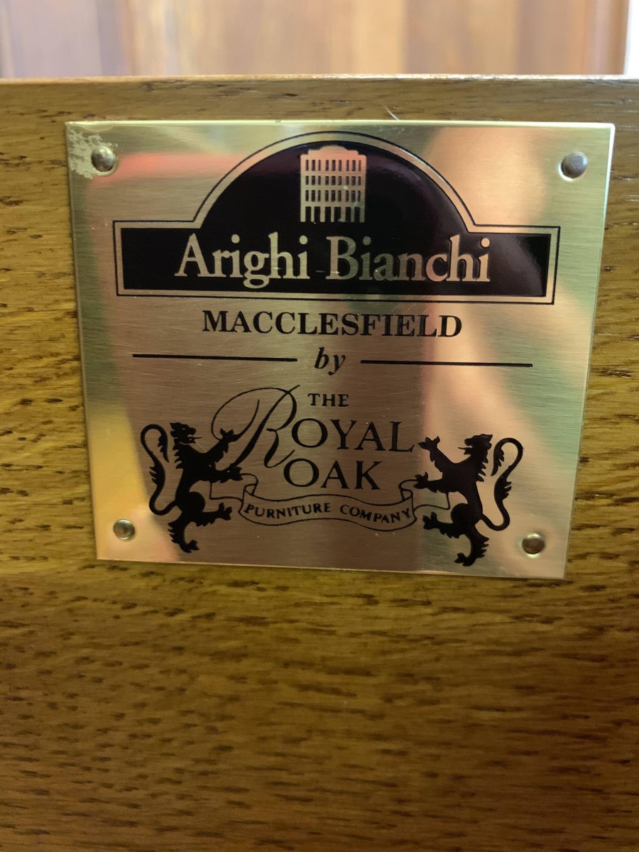A great quality oak wardrobe made by the renowned “Royal oak” furniture company is part of the Balmoral range which is currently in production and made of the best quality oak. This traditionally crafted wardrobe is in excellent condition. The oversailing top sits above three shaped recessed panelled lockable doors, each door having traditional “H” hinges, drop-down handle and key. The doors open to reveal a full length brass hanging rail, offering ample storage. Below are four deep drawers, each drawer having a pair of brass handles. This super wardrobe sits on a platform base and has the English Rose carved in the base, a trademark of Royal Oak Furniture.