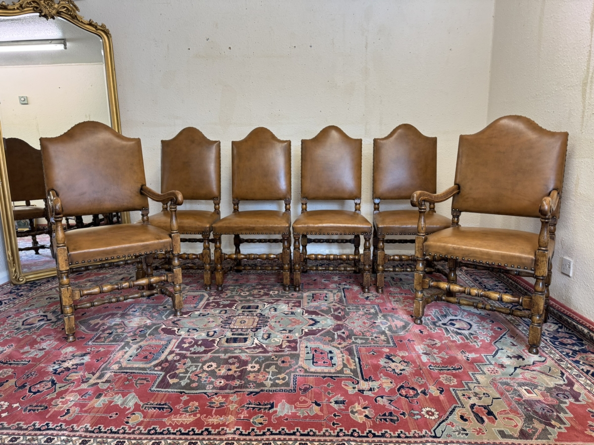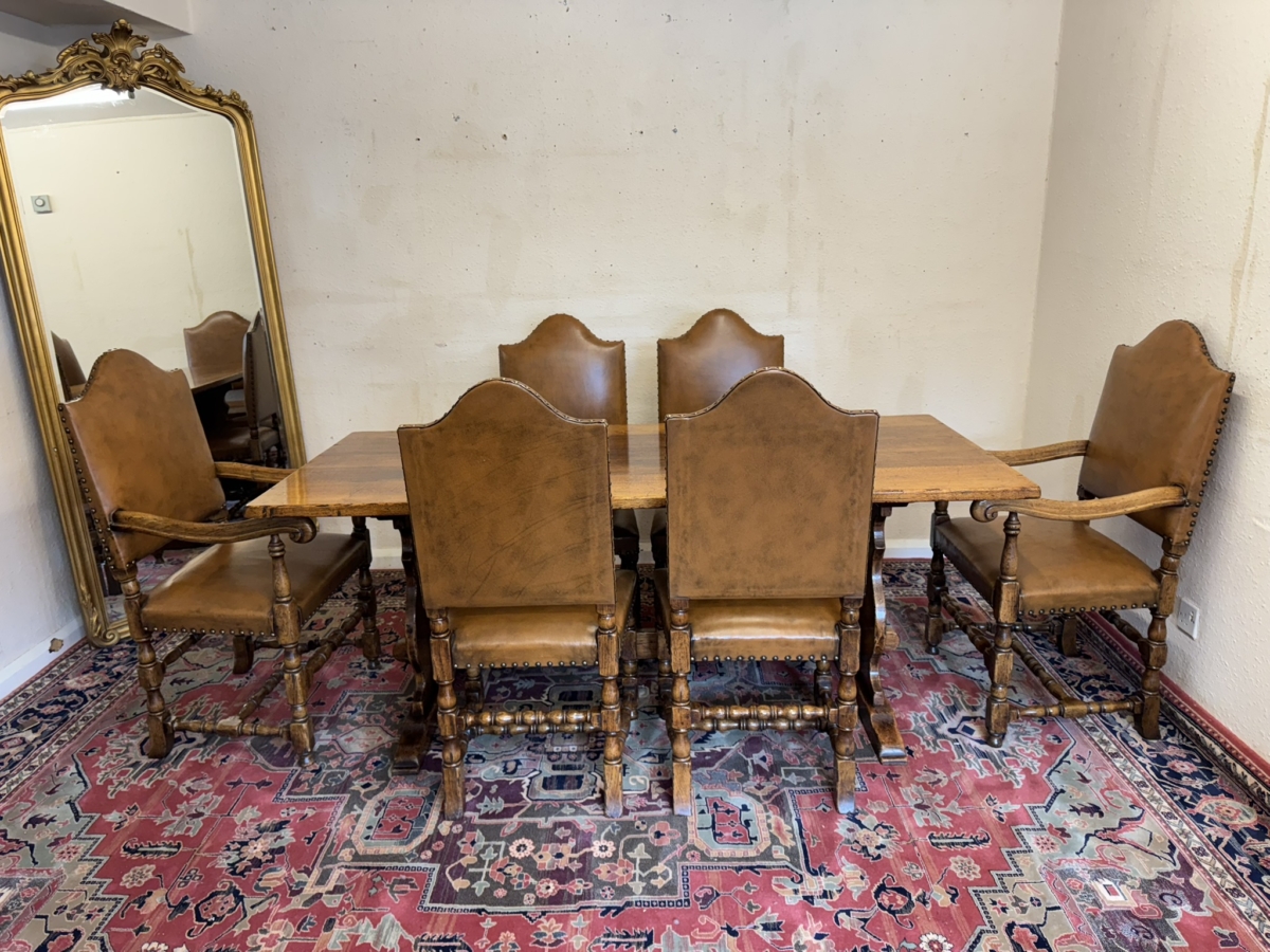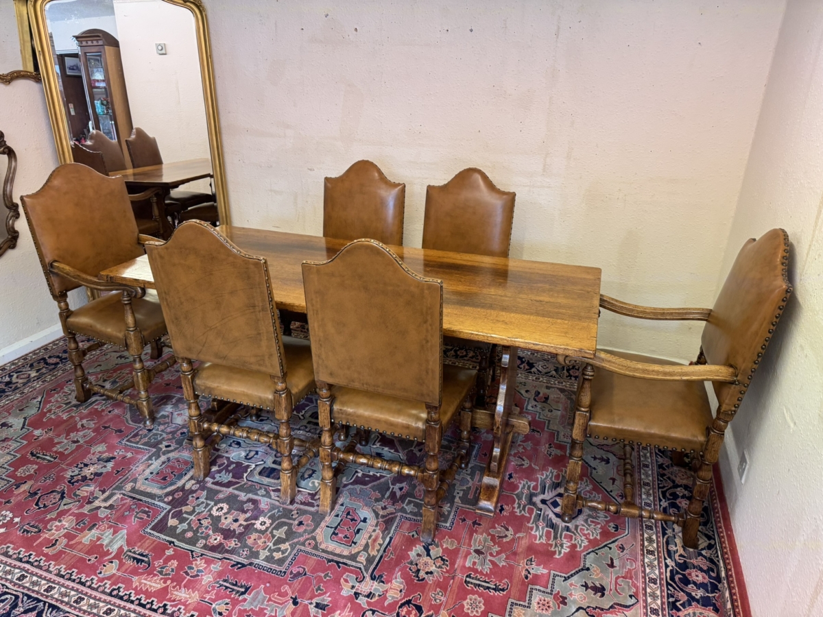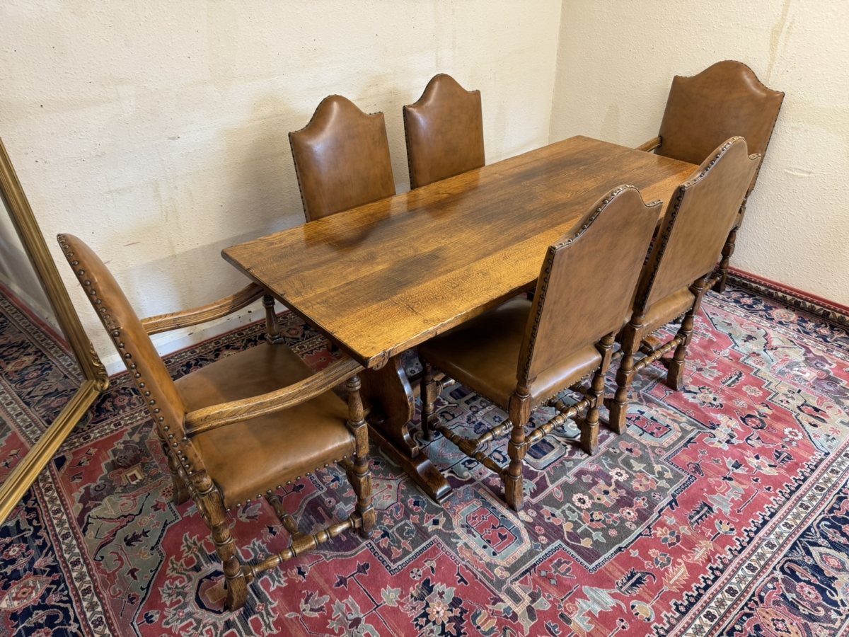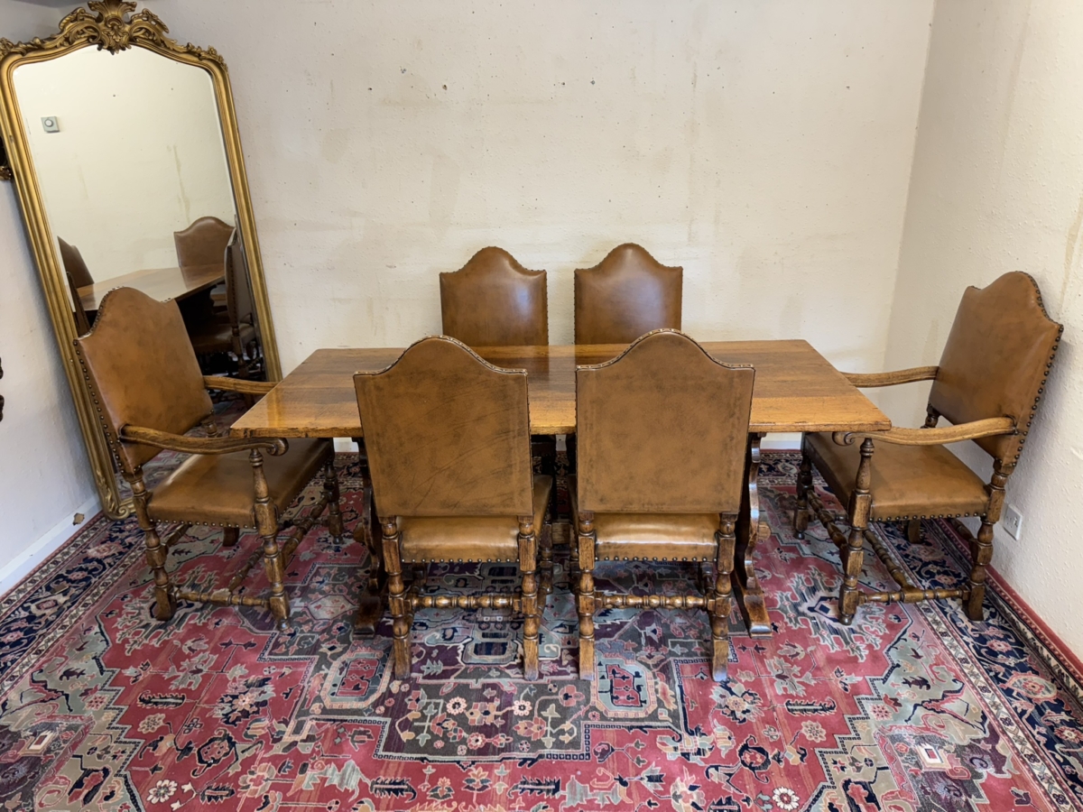 This super set is in excellent condition and made by the renowned Titchmarsh And Goodwin furniture makers. The grained oak top sits on a base of two slab ends with stretcher support. Two armchairs and four single chairs, each upholstered in a tan leather with brass studded decoration.