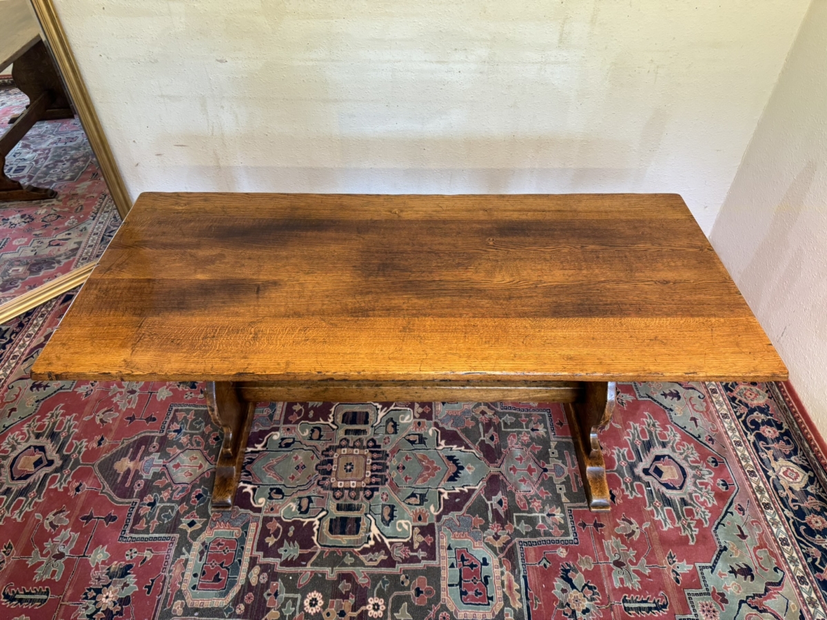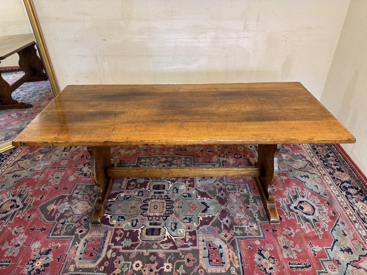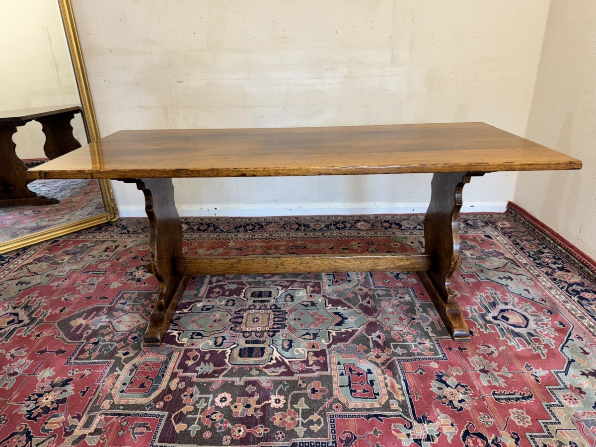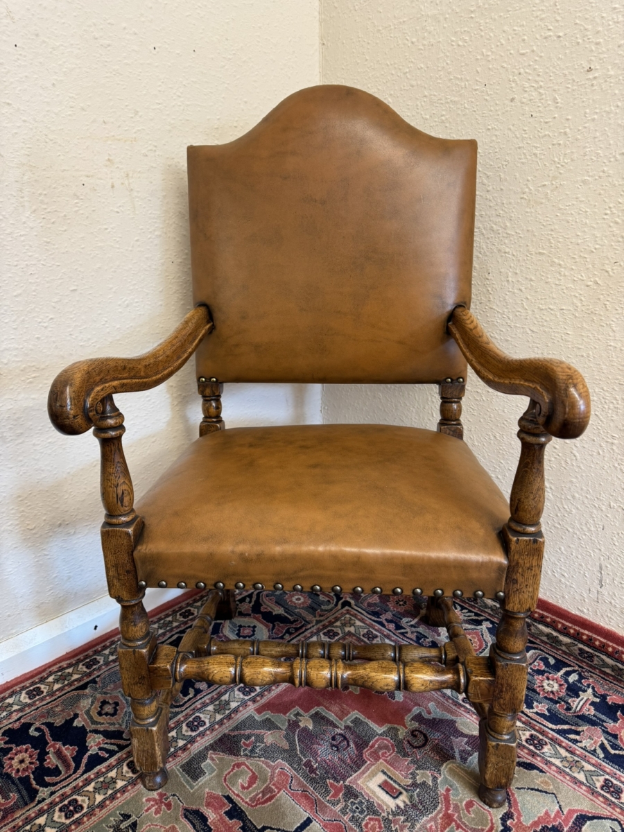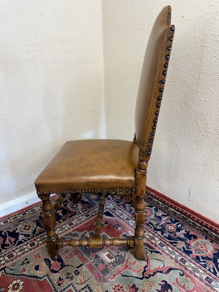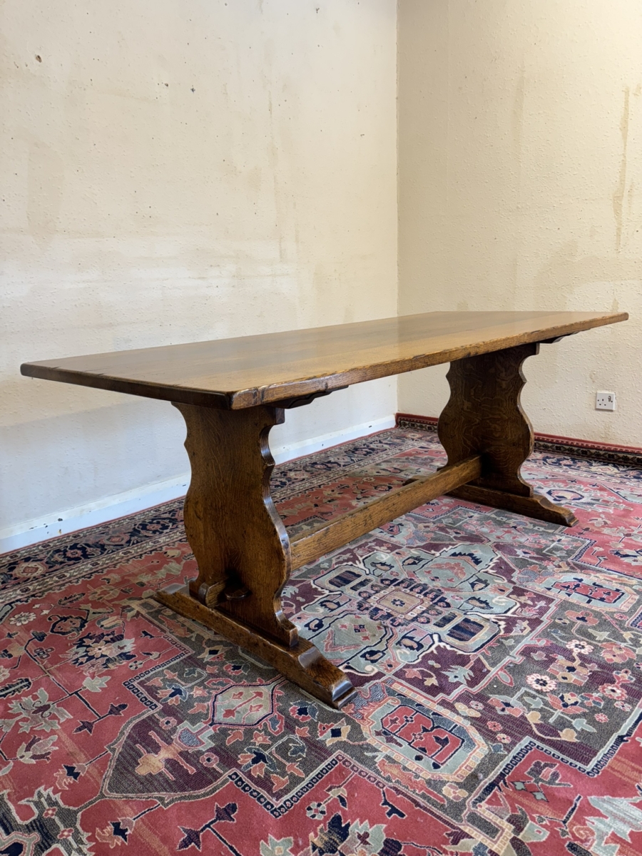 This super set is in excellent condition and made by the renowned Titchmarsh And Goodwin furniture makers. The grained oak top sits on a base of two slab ends with stretcher support. Two armchairs and four single chairs, each upholstered in a tan leather with brass studded decoration.