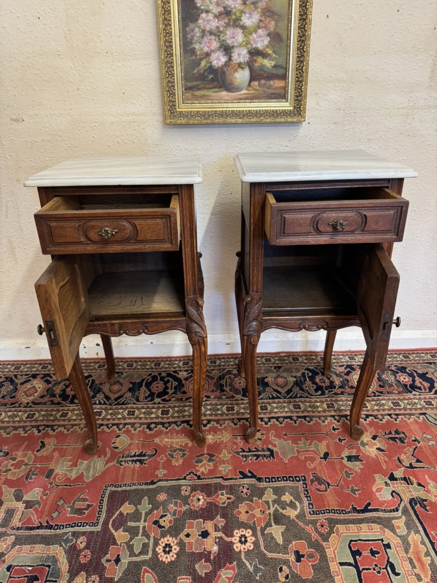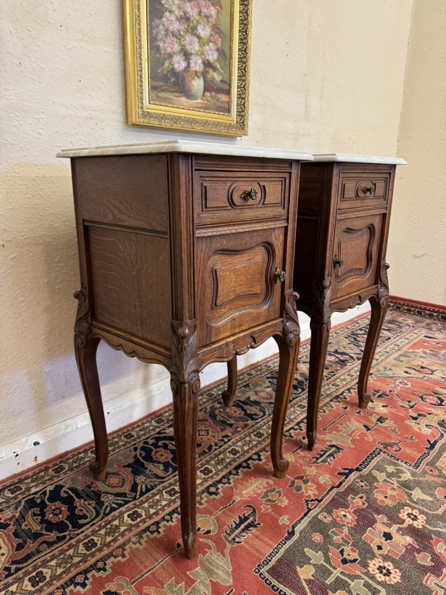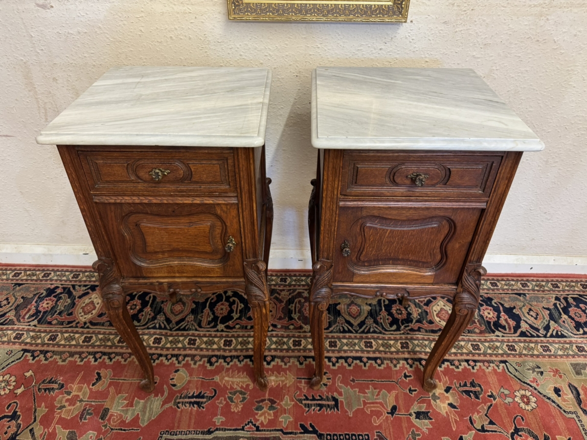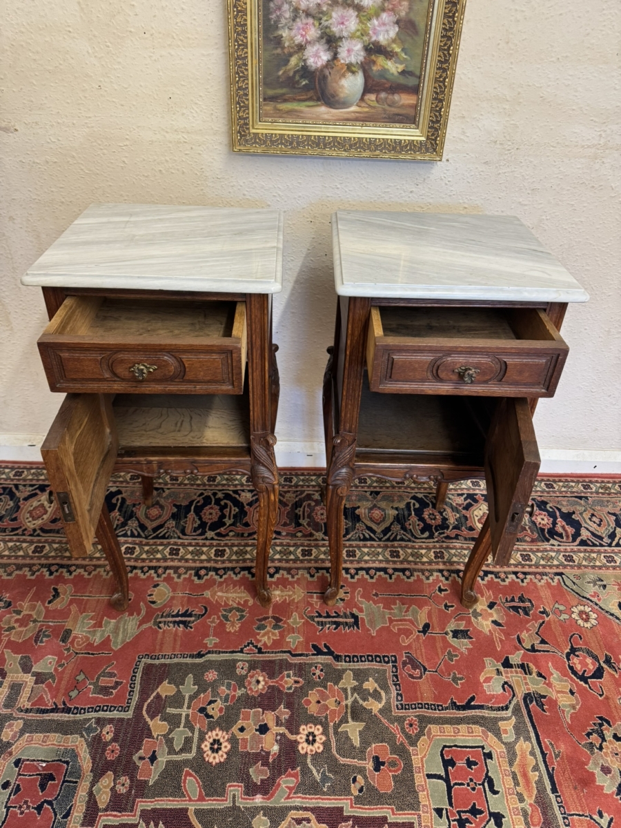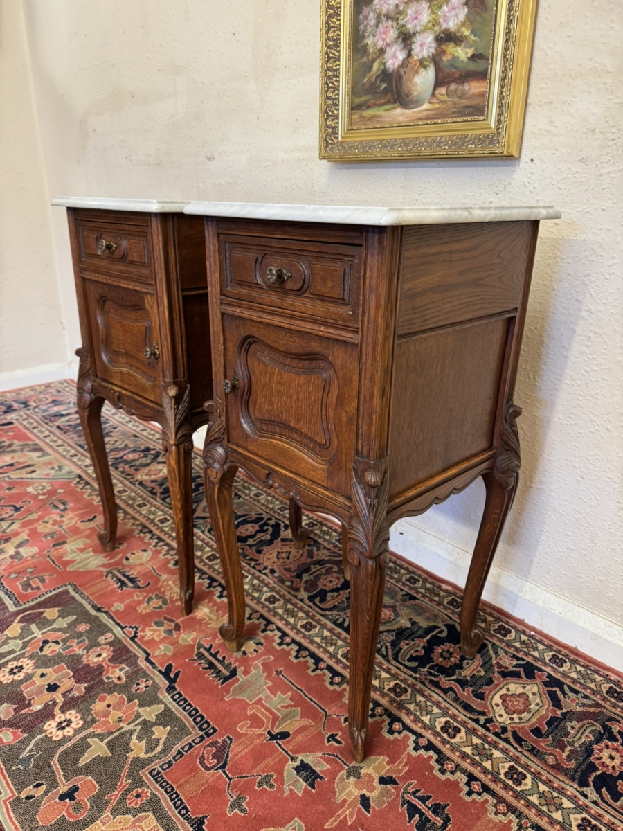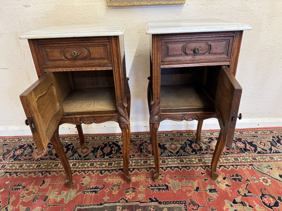 This fine pair of French antique marble top bedside cabinets dates circa 1890. Each cabinet has an over sailing marble top, below is a drawer, the drawer has an ornate brass pull handle. Below the drawer is a recessed panelled cupboard door, the door has an ornate brass pull handle. The door opens to reveal storage space. Recessed panelled sides, shaped carved skirt and standing on four elegant carved cabriole shaped legs.