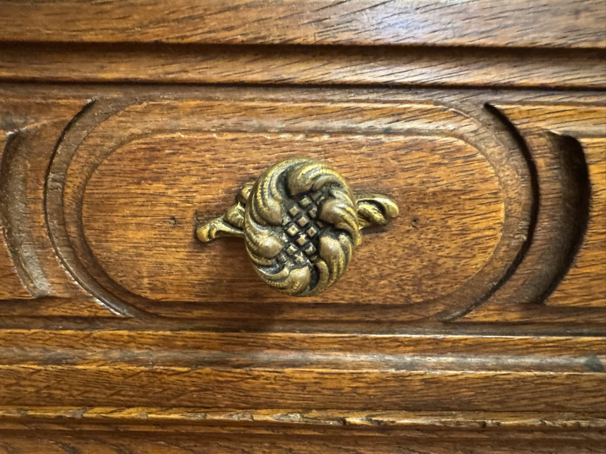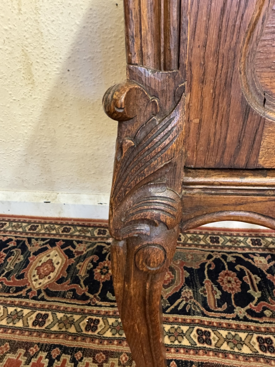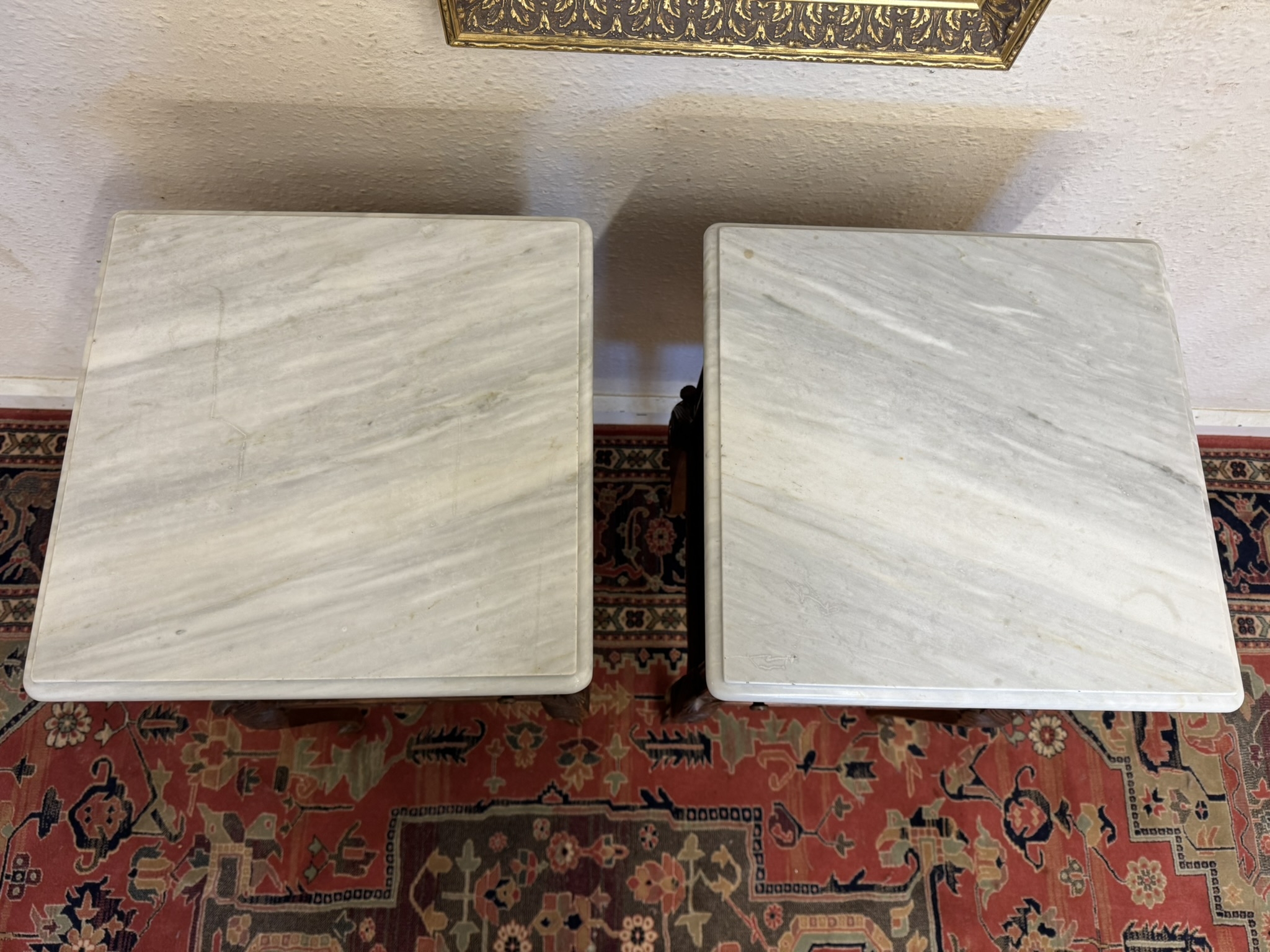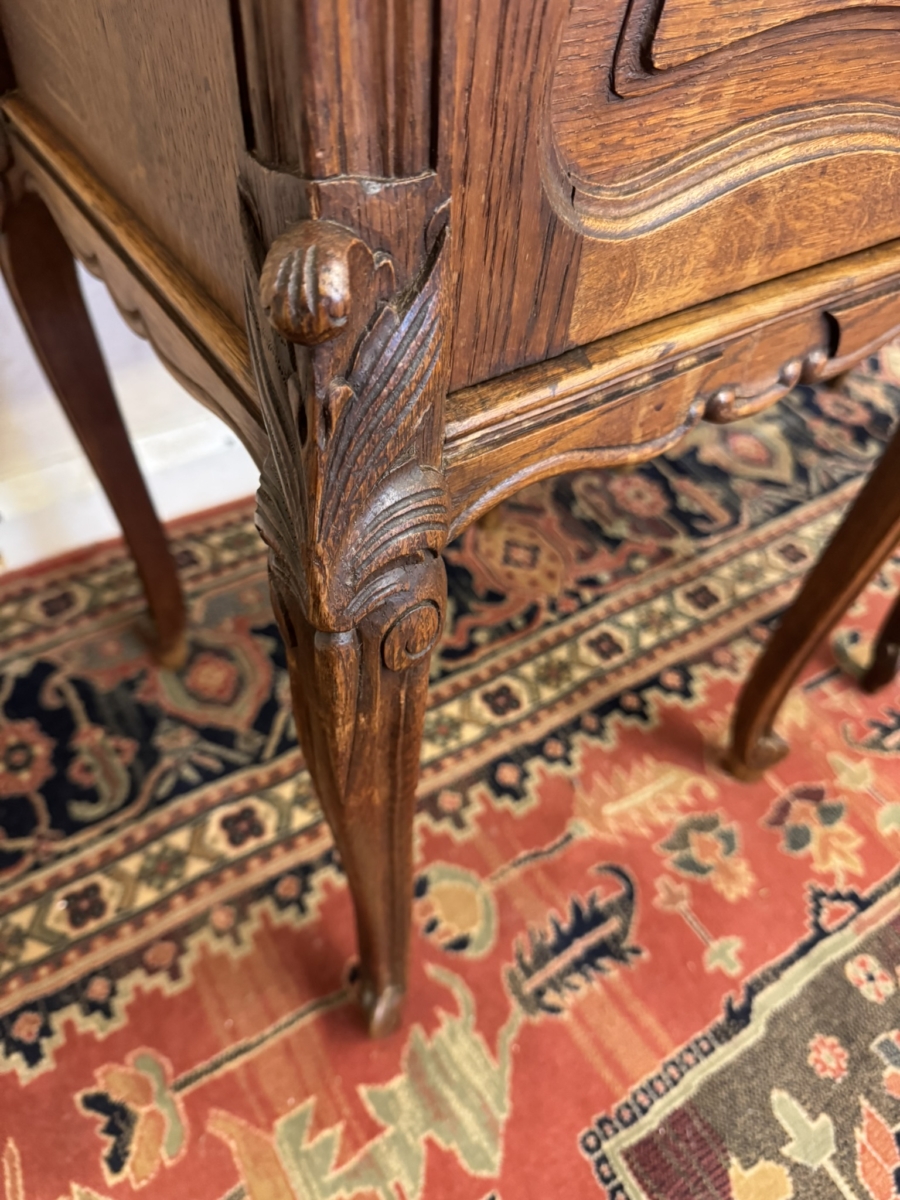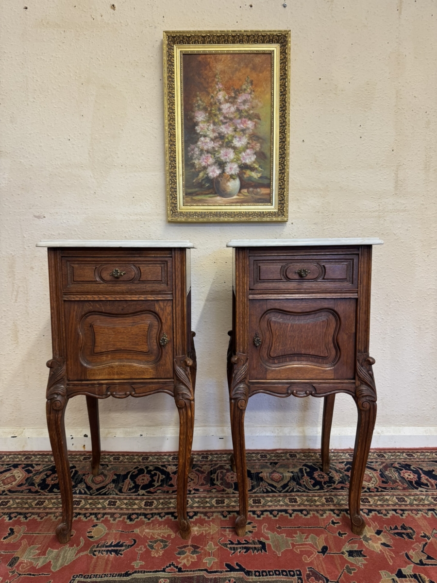 This fine pair of French antique marble top bedside cabinets dates circa 1890. Each cabinet has an over sailing marble top, below is a drawer, the drawer has an ornate brass pull handle. Below the drawer is a recessed panelled cupboard door, the door has an ornate brass pull handle. The door opens to reveal storage space. Recessed panelled sides, shaped carved skirt and standing on four elegant carved cabriole shaped legs.