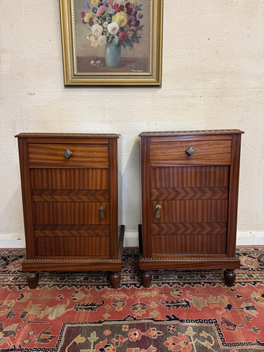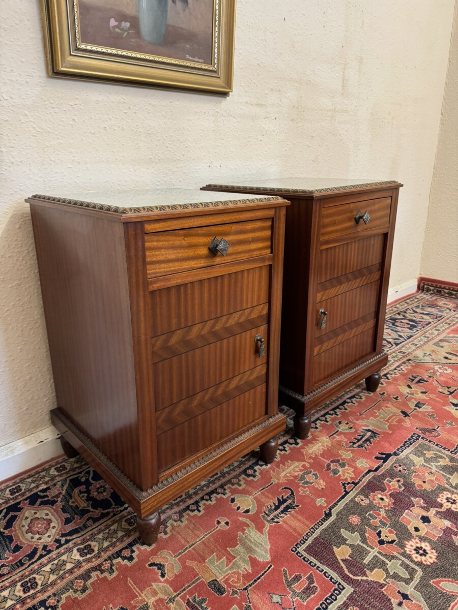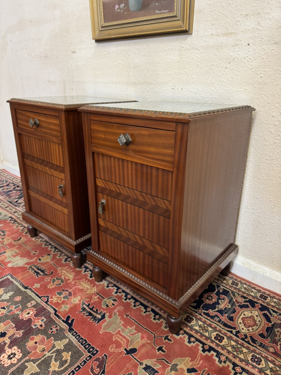 This striking pair of art deco bedside cabinets date circa 1920. The fabulous quarter veneered top has a glass protector and a carved edge, below is a drawer which has an ornate metal handle. Below is a cupboard door; the door has a carved metal handle and opens to reveal a fixed shelf. Carving below the door and standing on four elegant turned feet.