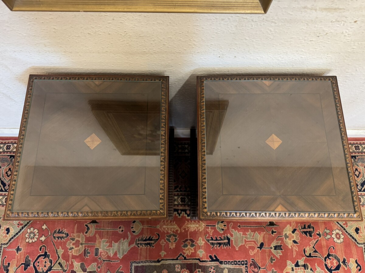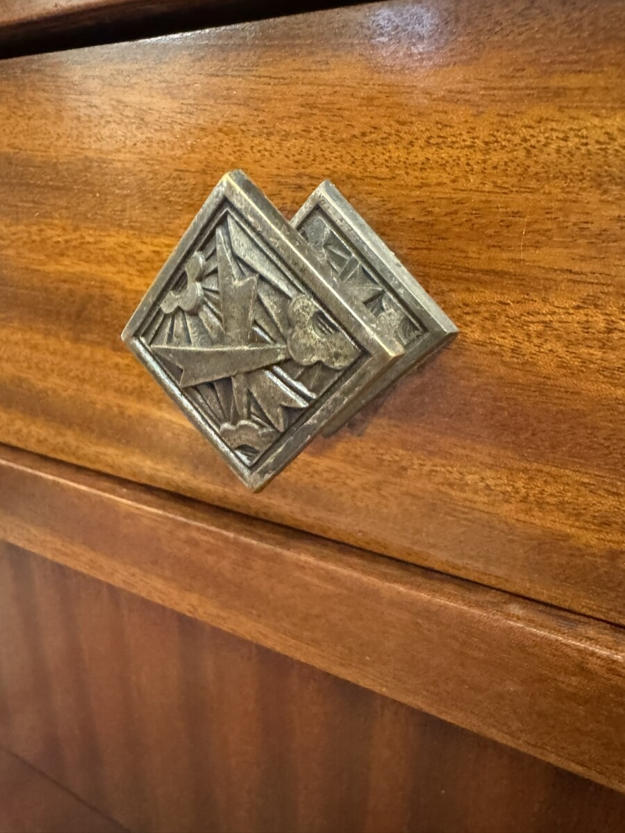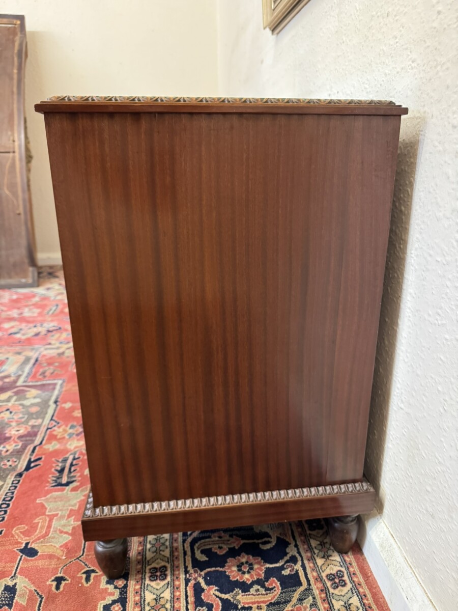 This striking pair of art deco bedside cabinets date circa 1920. The fabulous quarter veneered top has a glass protector and a carved edge, below is a drawer which has an ornate metal handle. Below is a cupboard door; the door has a carved metal handle and opens to reveal a fixed shelf. Carving below the door and standing on four elegant turned feet.