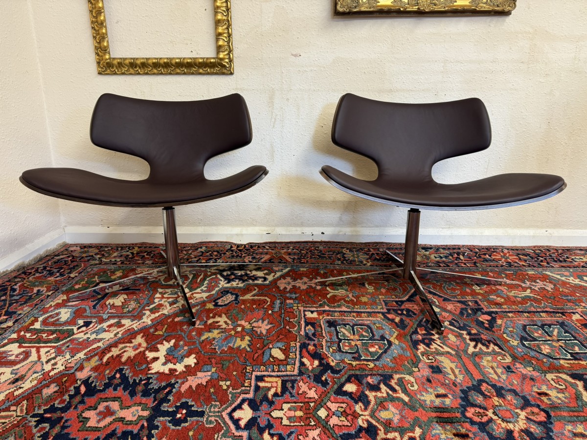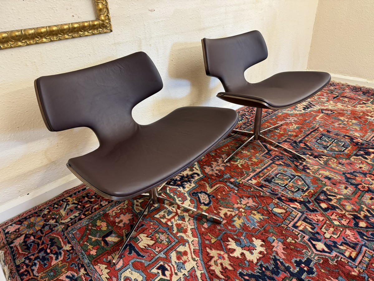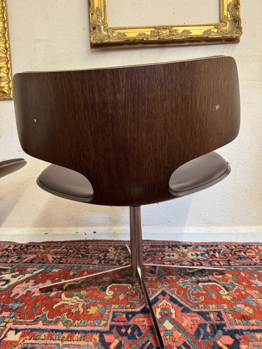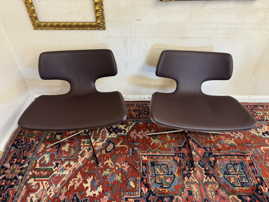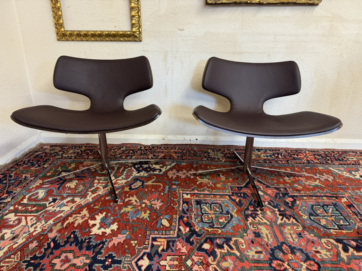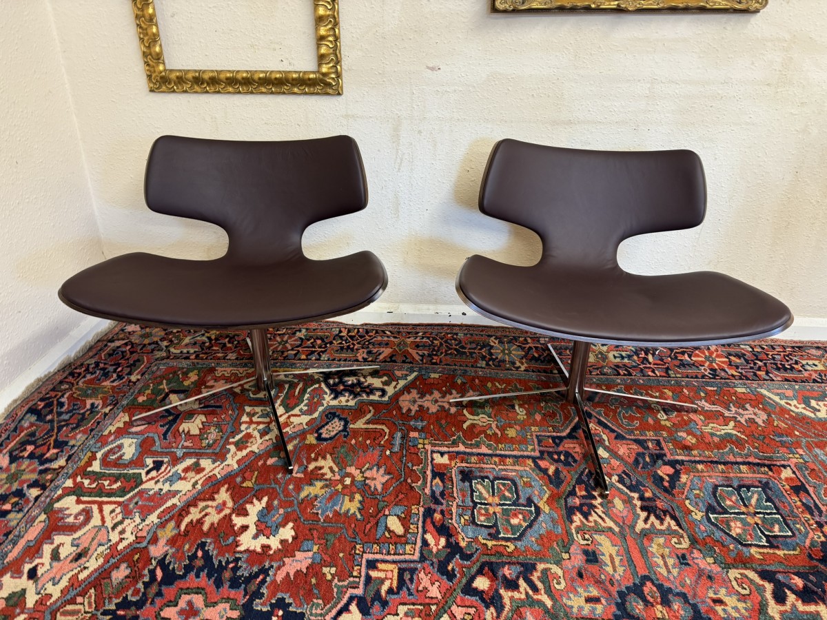 Each chair is upholstered in brown leather on a shaped wooden frame which sits on a stylish chrome base.