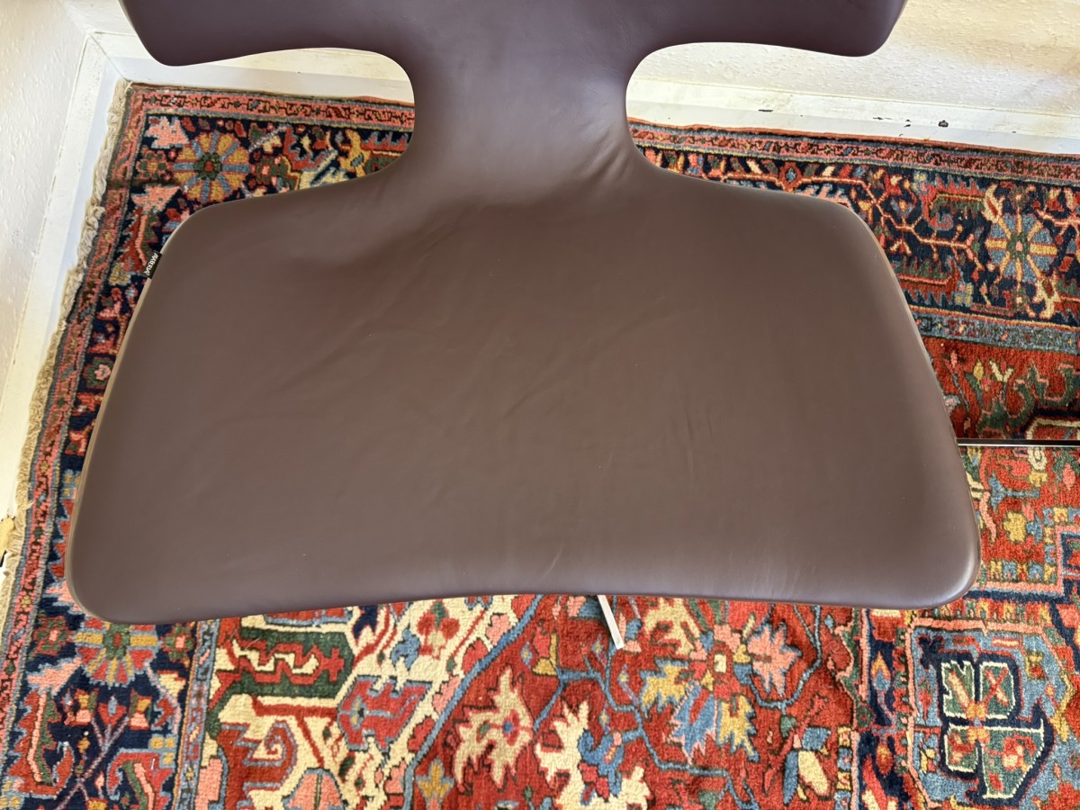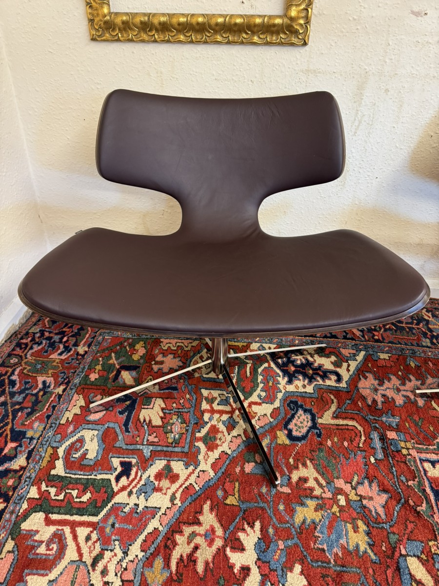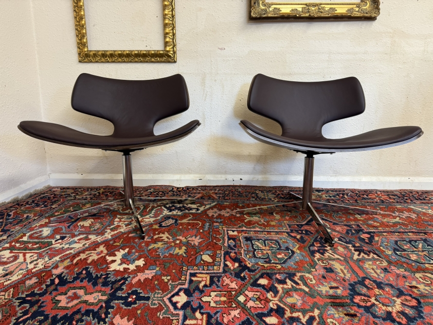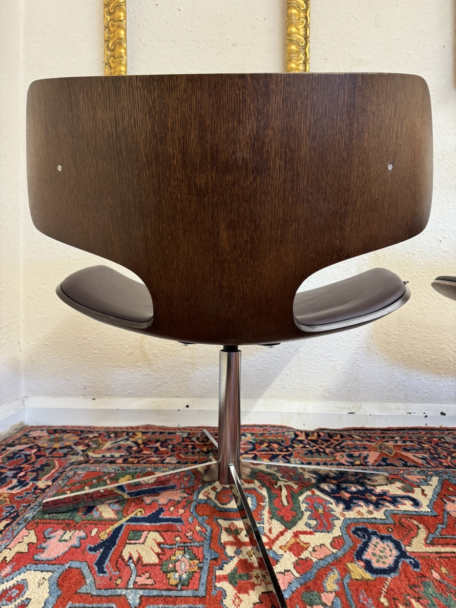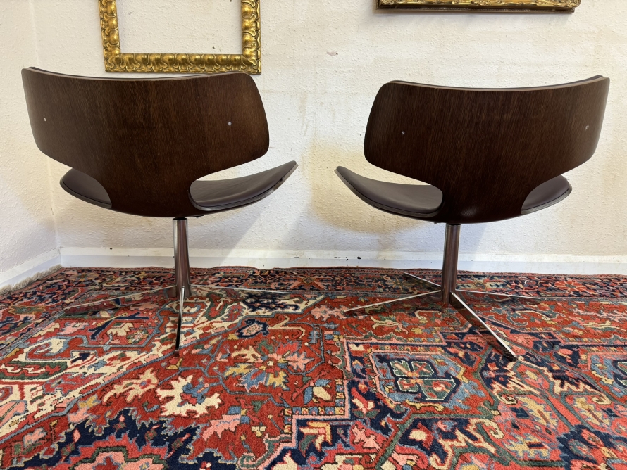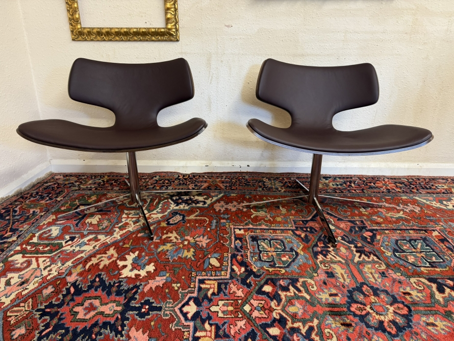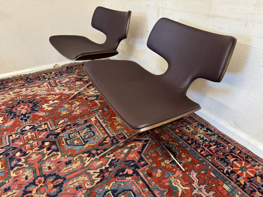 Each chair is upholstered in brown leather on a shaped wooden frame which sits on a stylish chrome base.