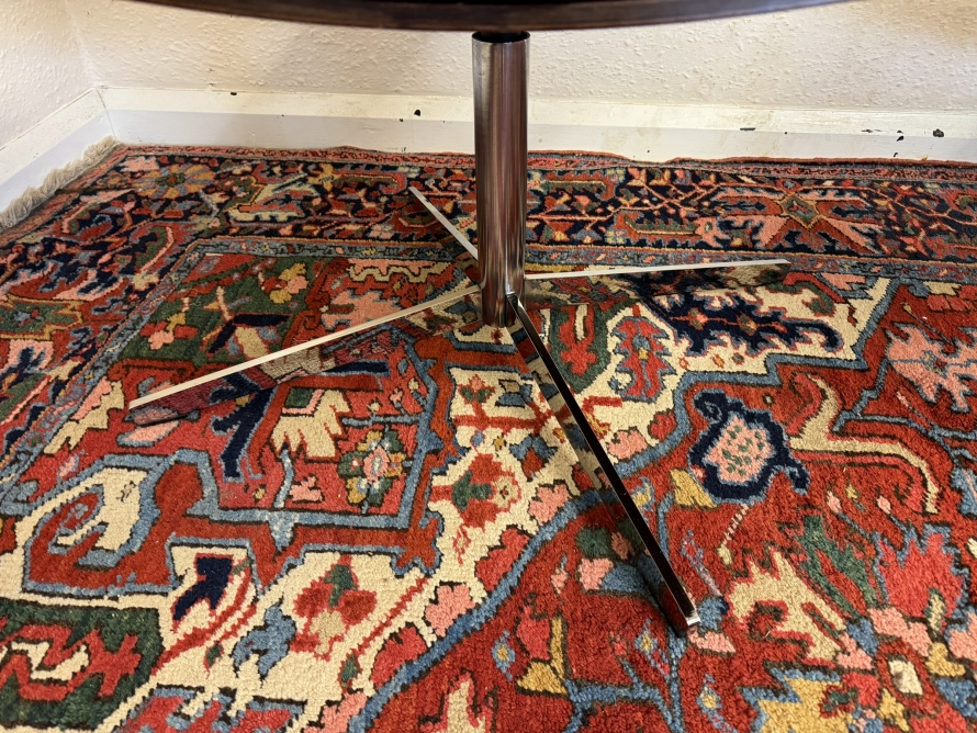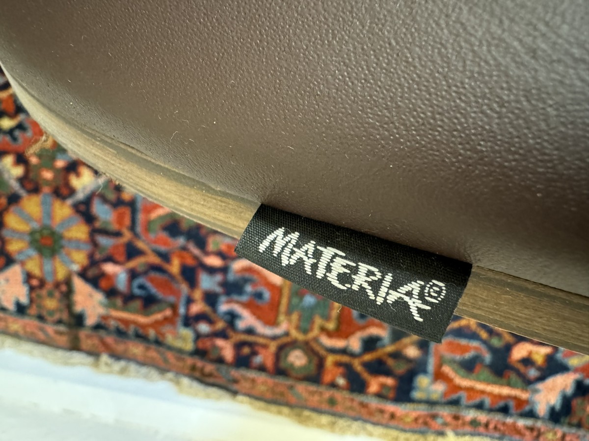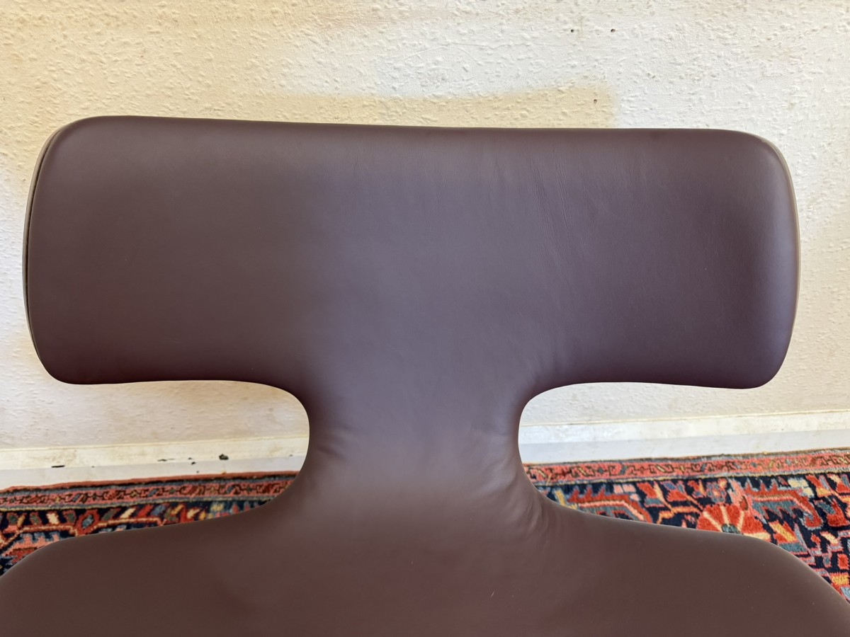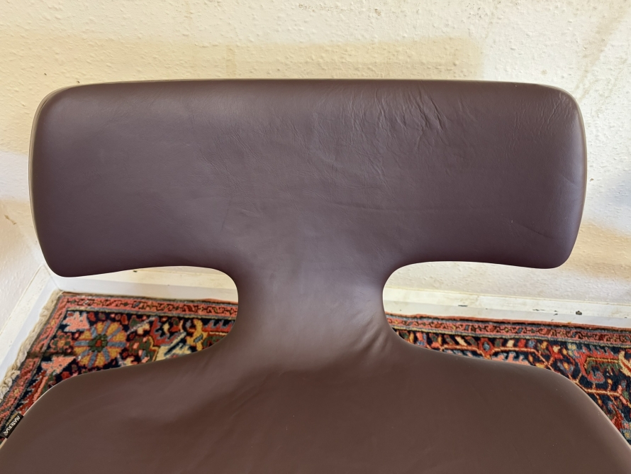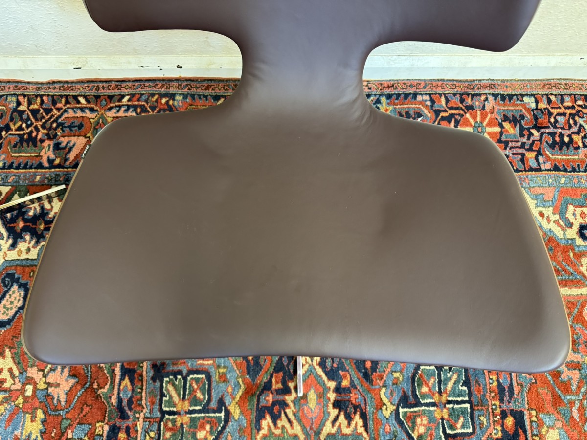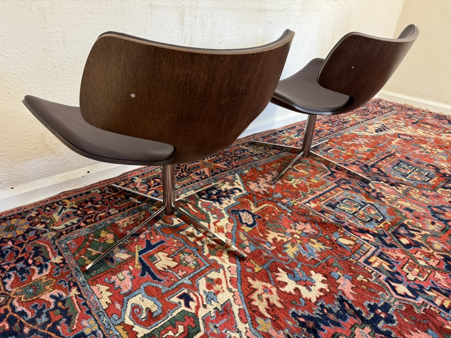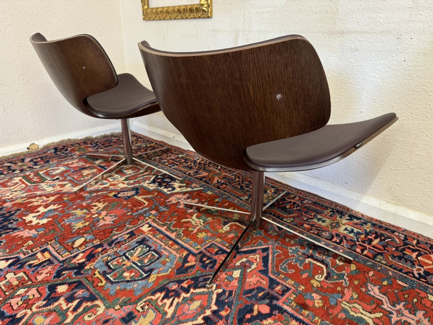 Each chair is upholstered in brown leather on a shaped wooden frame which sits on a stylish chrome base.