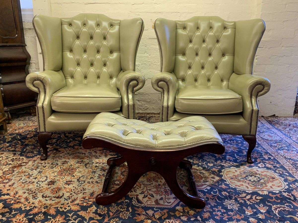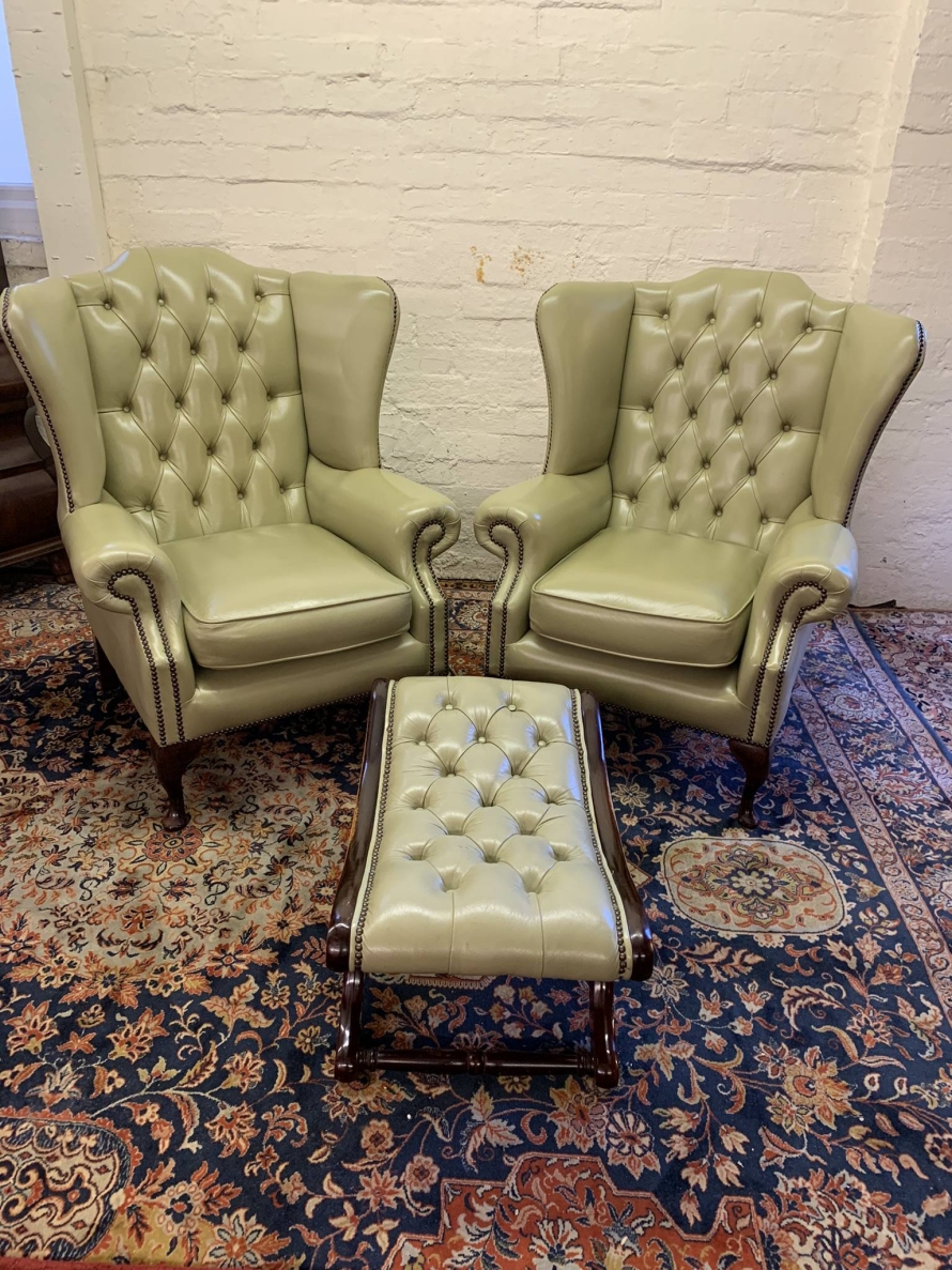 - Pair Of Quality Leather Chesterfield Wingback Armchairs With Footstool – Now Sold