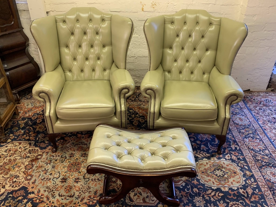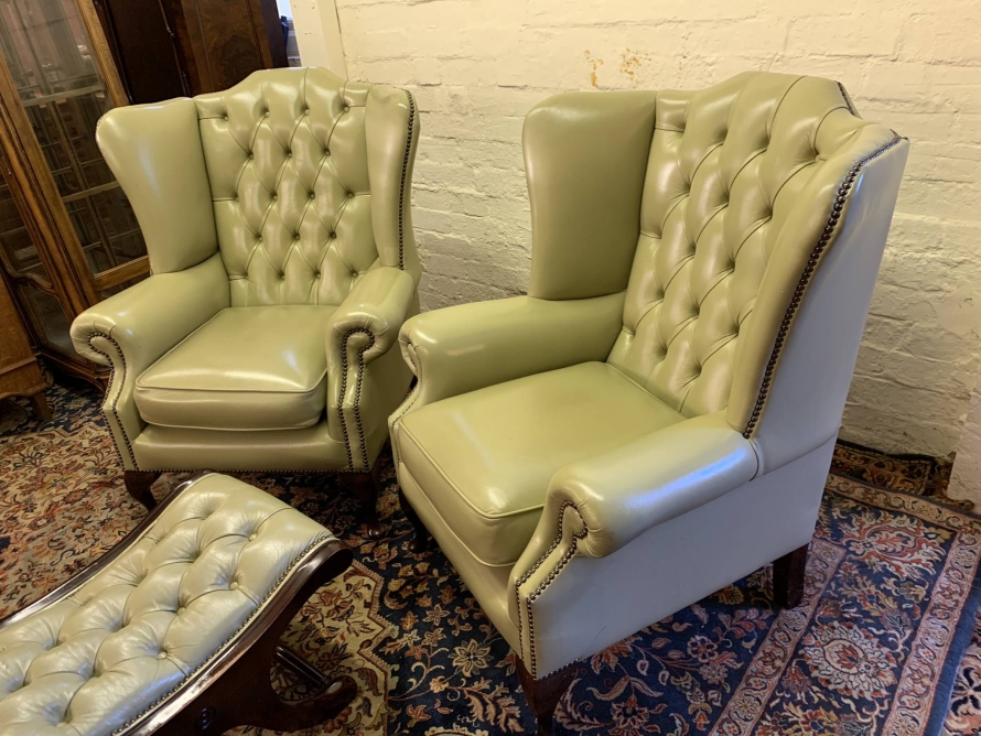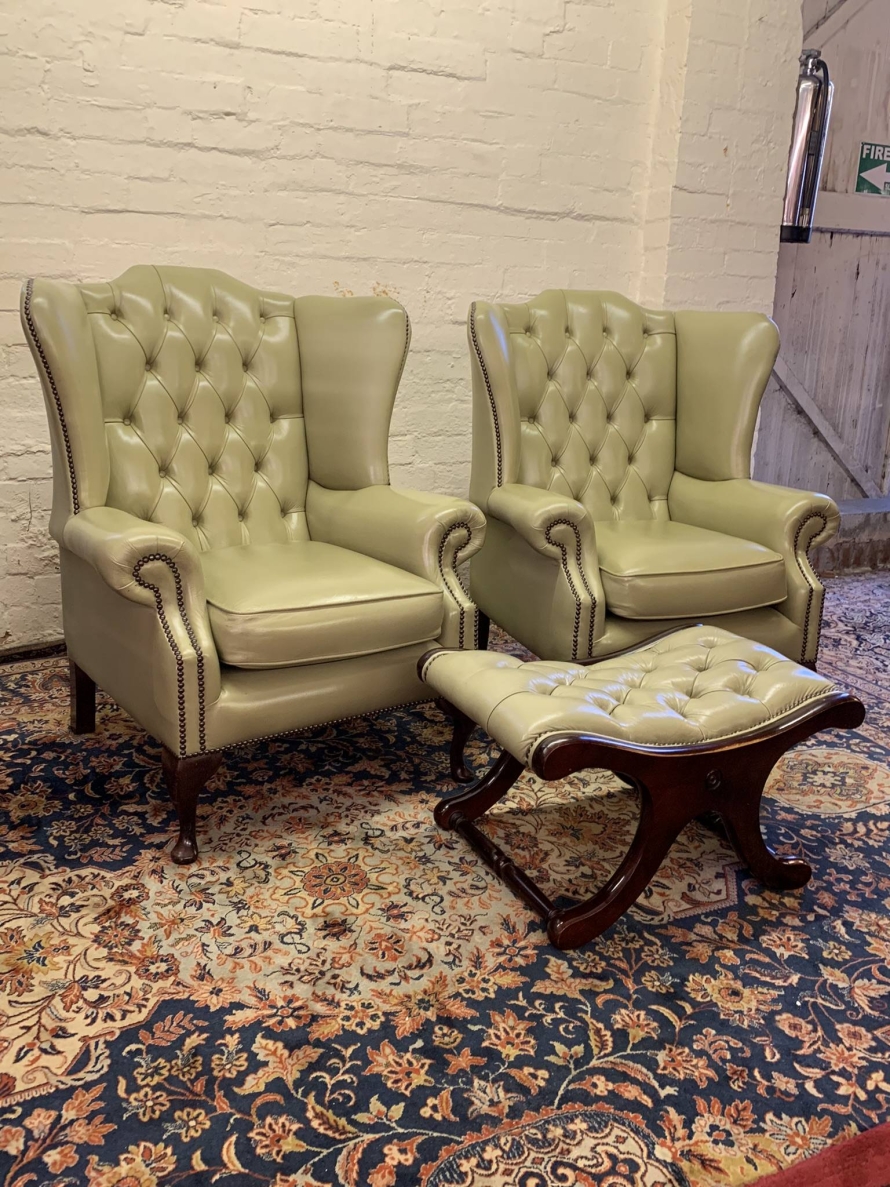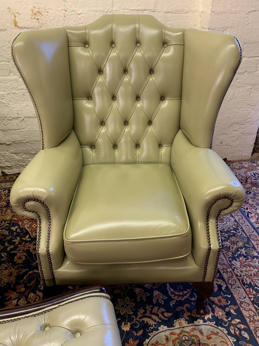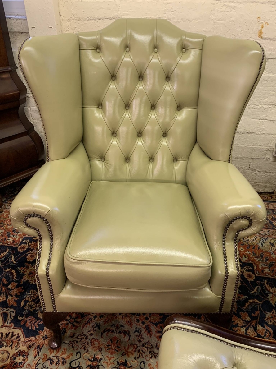 The chairs are upholstered in a sage green soft leather. Each chair having a deep buttoned back, wing arms, removable seat cushion with brass studded decoration throughout. Each chair sits on cabriole shaped legs to the front. Matching buttoned footstool.