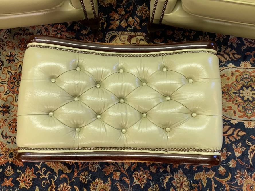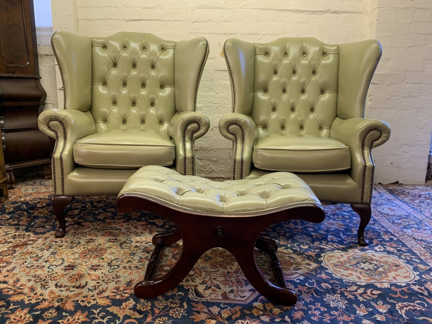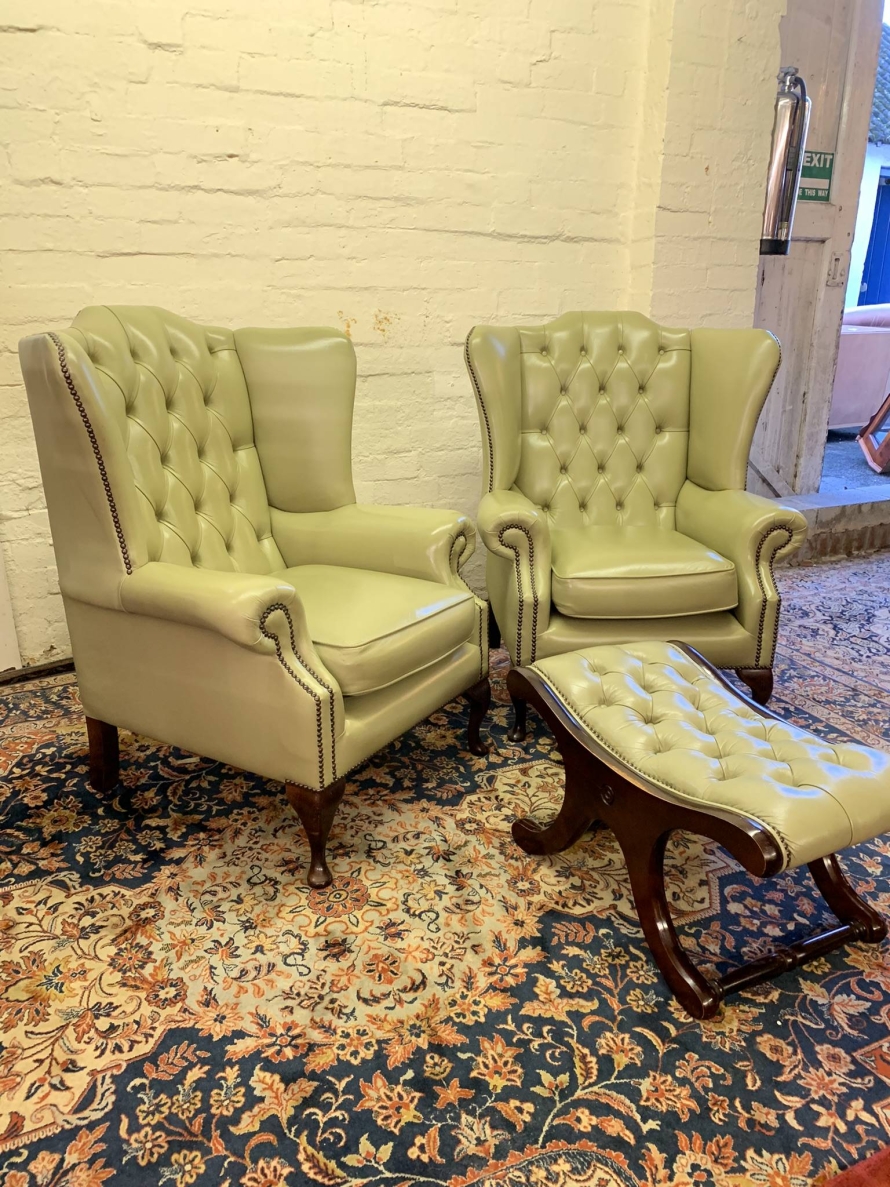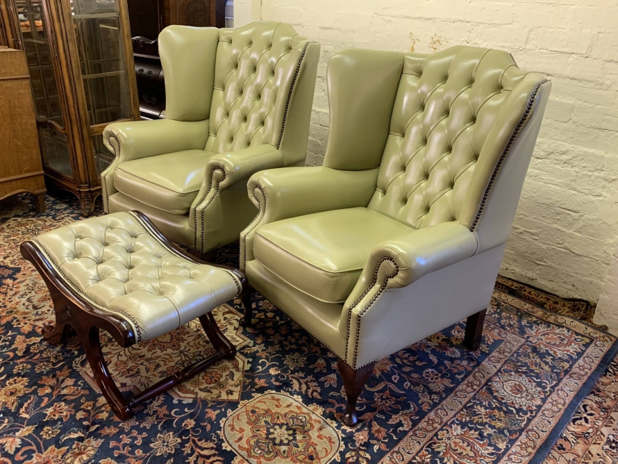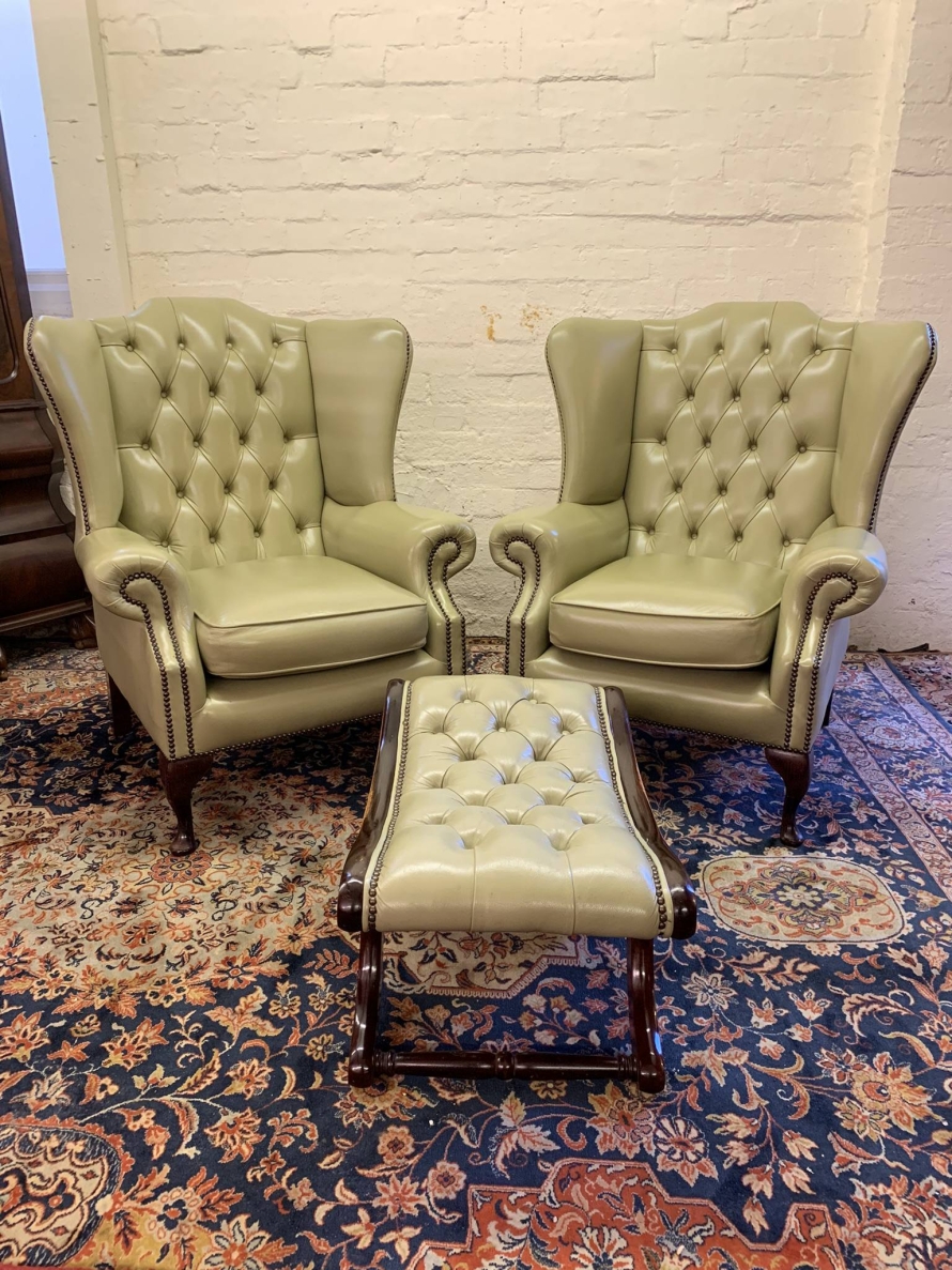 The chairs are upholstered in a sage green soft leather. Each chair having a deep buttoned back, wing arms, removable seat cushion with brass studded decoration throughout. Each chair sits on cabriole shaped legs to the front. Matching buttoned footstool.
