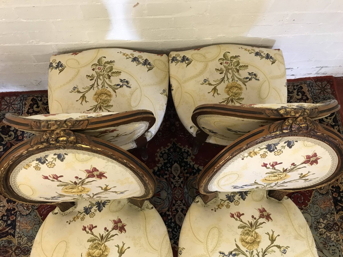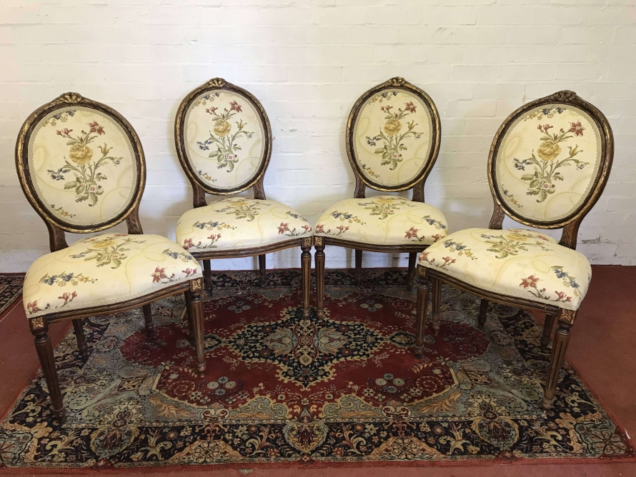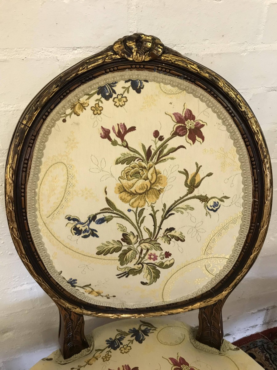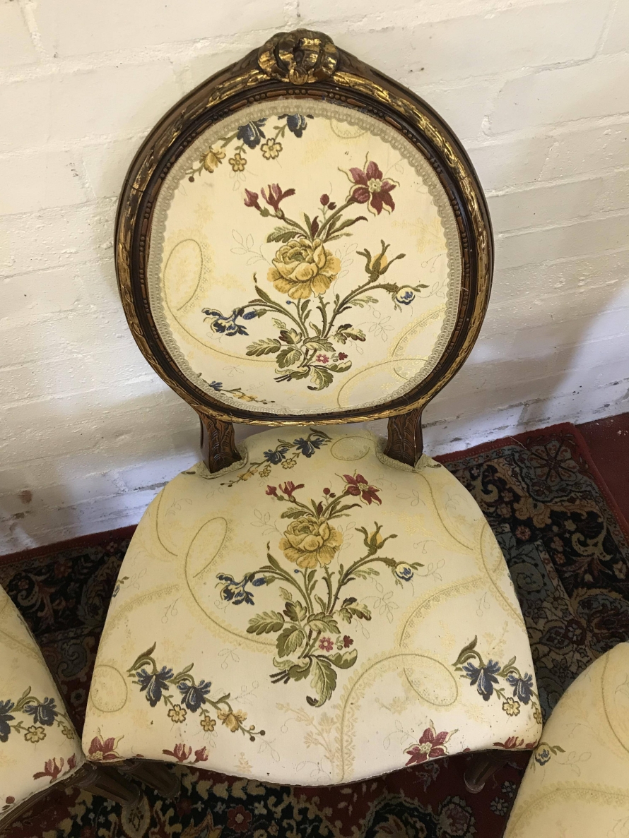 Each chair has an upholstered cameo back rest in a wooden and gilt frame which rises to a central ornate carving. Cushioned upholstered seat. The chairs sit on four fluted legs. Please note that each chair is sturdy.