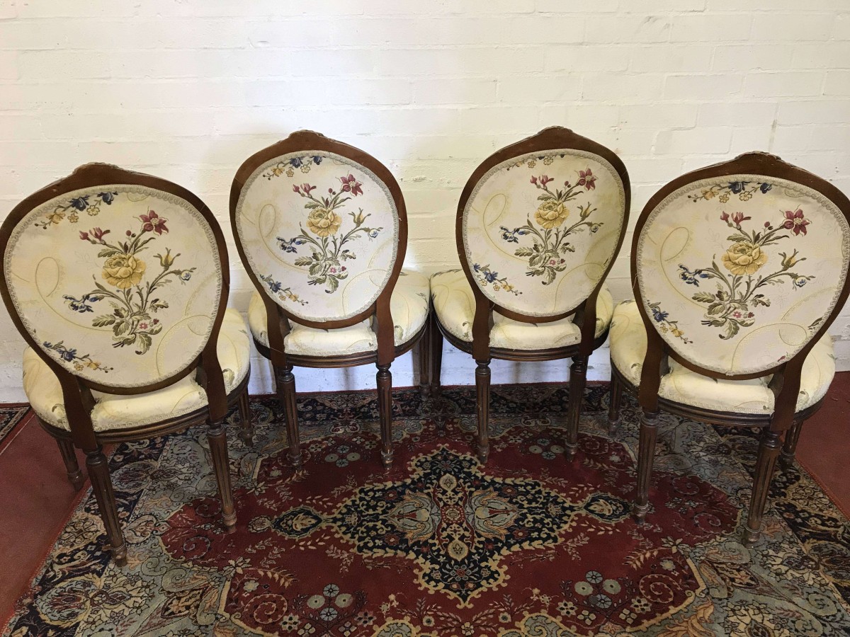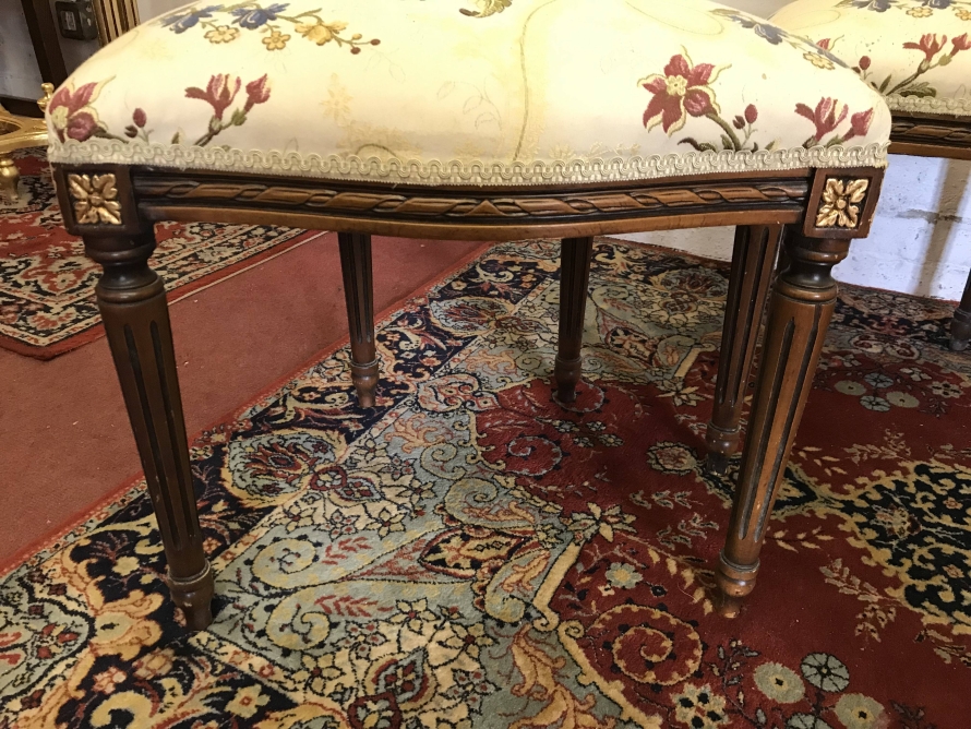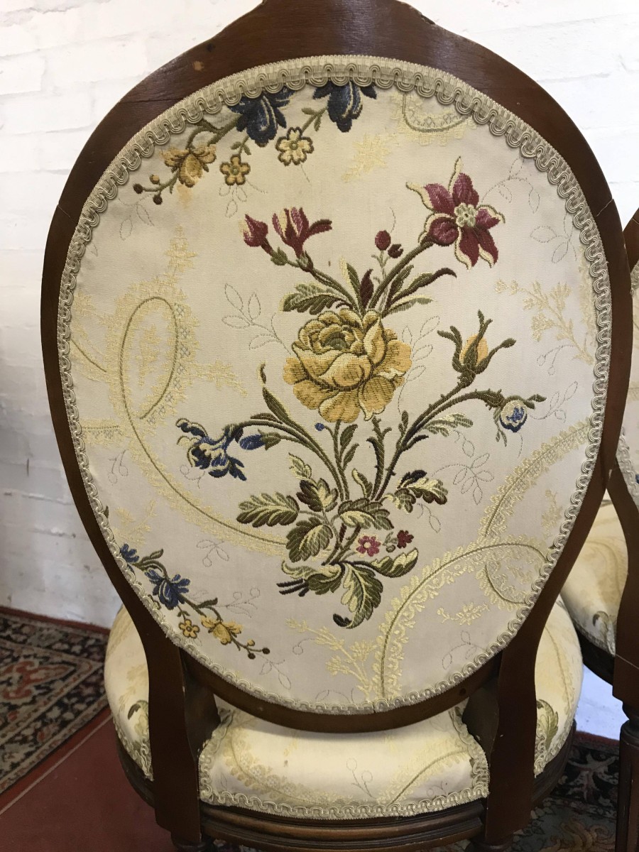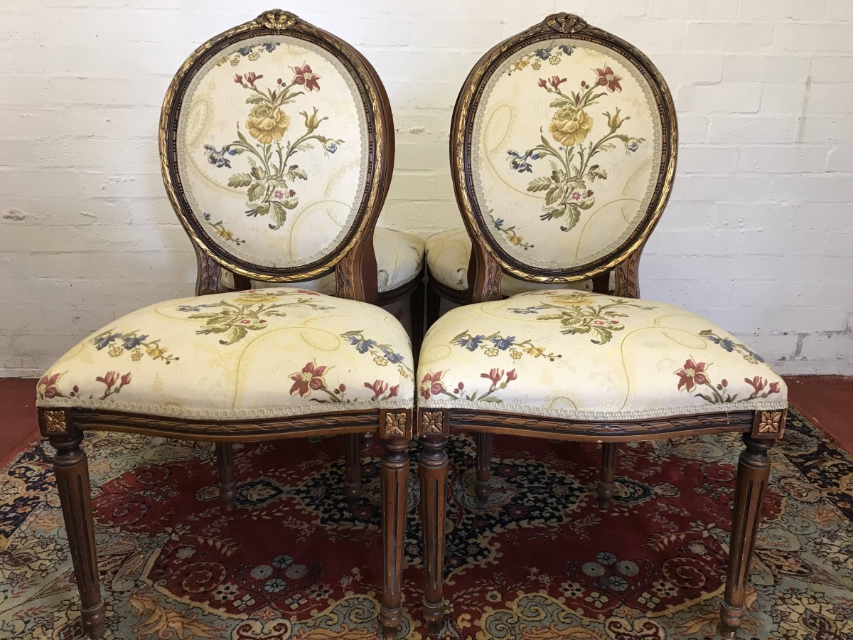 Each chair has an upholstered cameo back rest in a wooden and gilt frame which rises to a central ornate carving. Cushioned upholstered seat. The chairs sit on four fluted legs. Please note that each chair is sturdy.