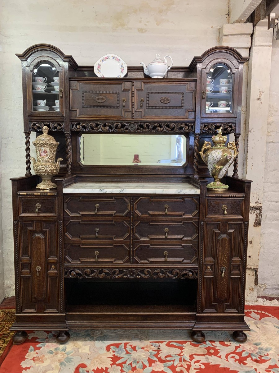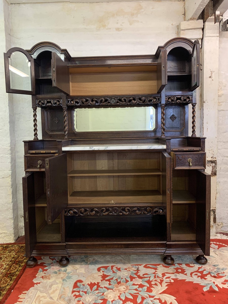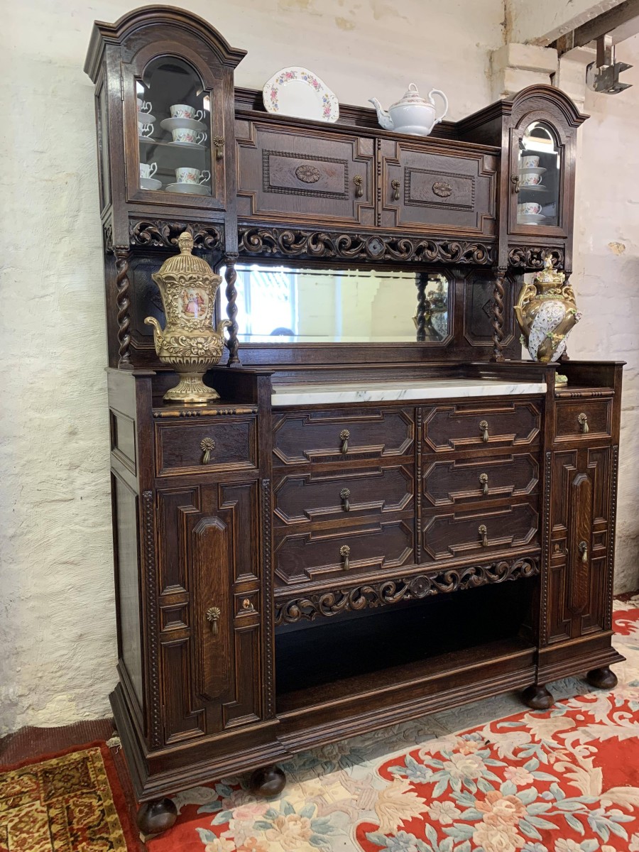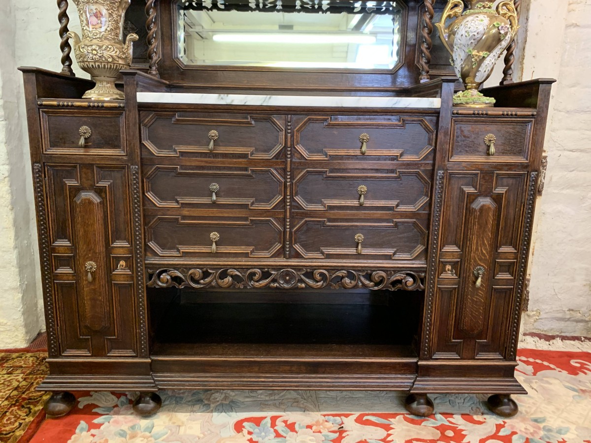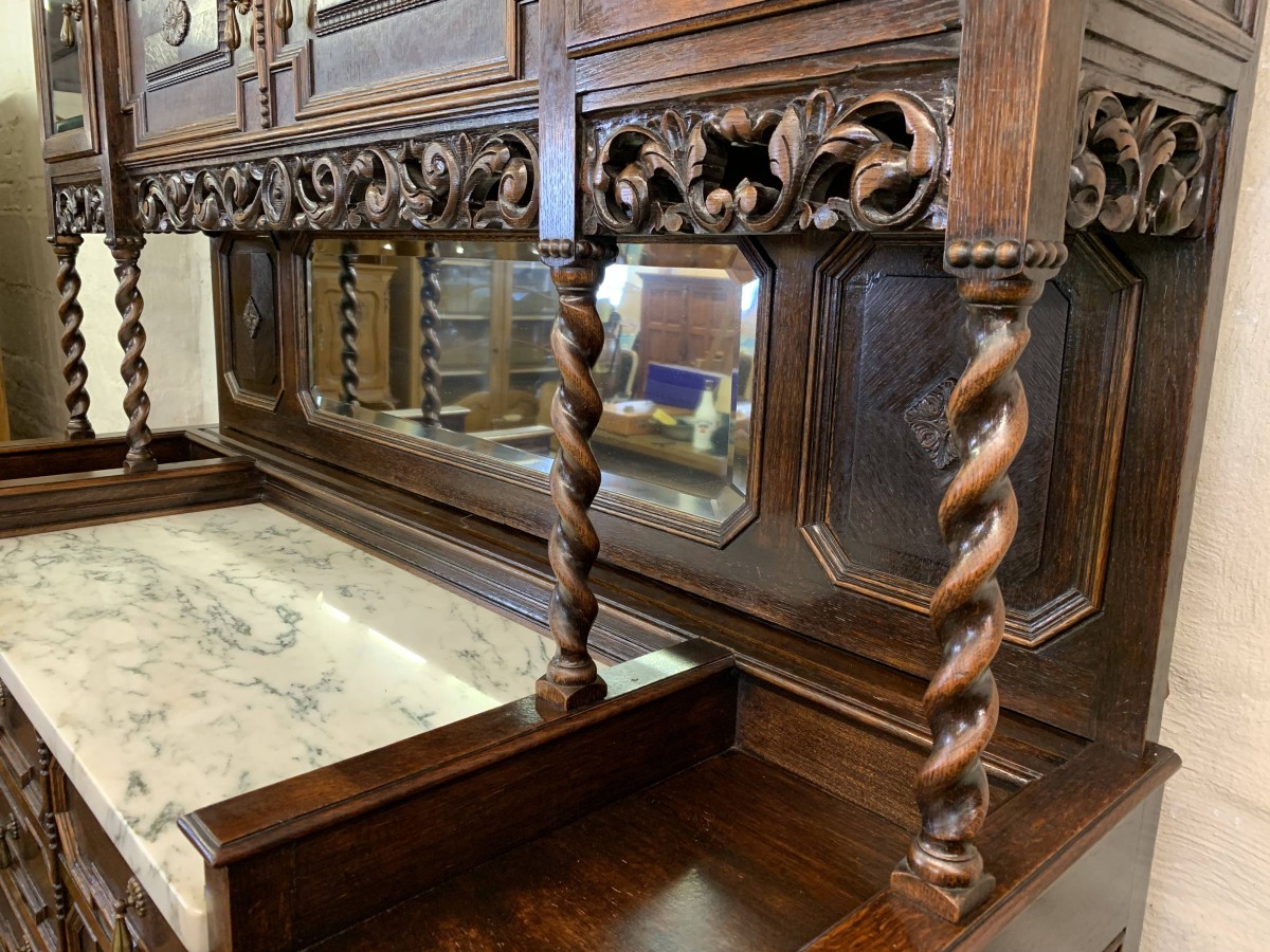 An unusual antique oak barley twist dresser which is in super condition. The top section has a pair of carved recessed panelled doors, each door having a brass teardrop handle. The doors open to reveal storage space. To the sides are glazed dome top sections, each having a brass tear drop handle, bevel edged glazing and open to reveal a removable shelf top. Below each cupboard are a pair of barley twist supports with carving to the front and sides. There is a central bevelled mirror. The base section has a carrara marble insert which sits above a pair of cupboard doors with carvings below and an open section to the base. To the sides you have a drawer which sits above carved recessed panelled lockable cupboard door, the doors open to reveal a removable shelf. Recessed panelled sides this stunning antique item of oak furniture stands on six turned bulbous feet.