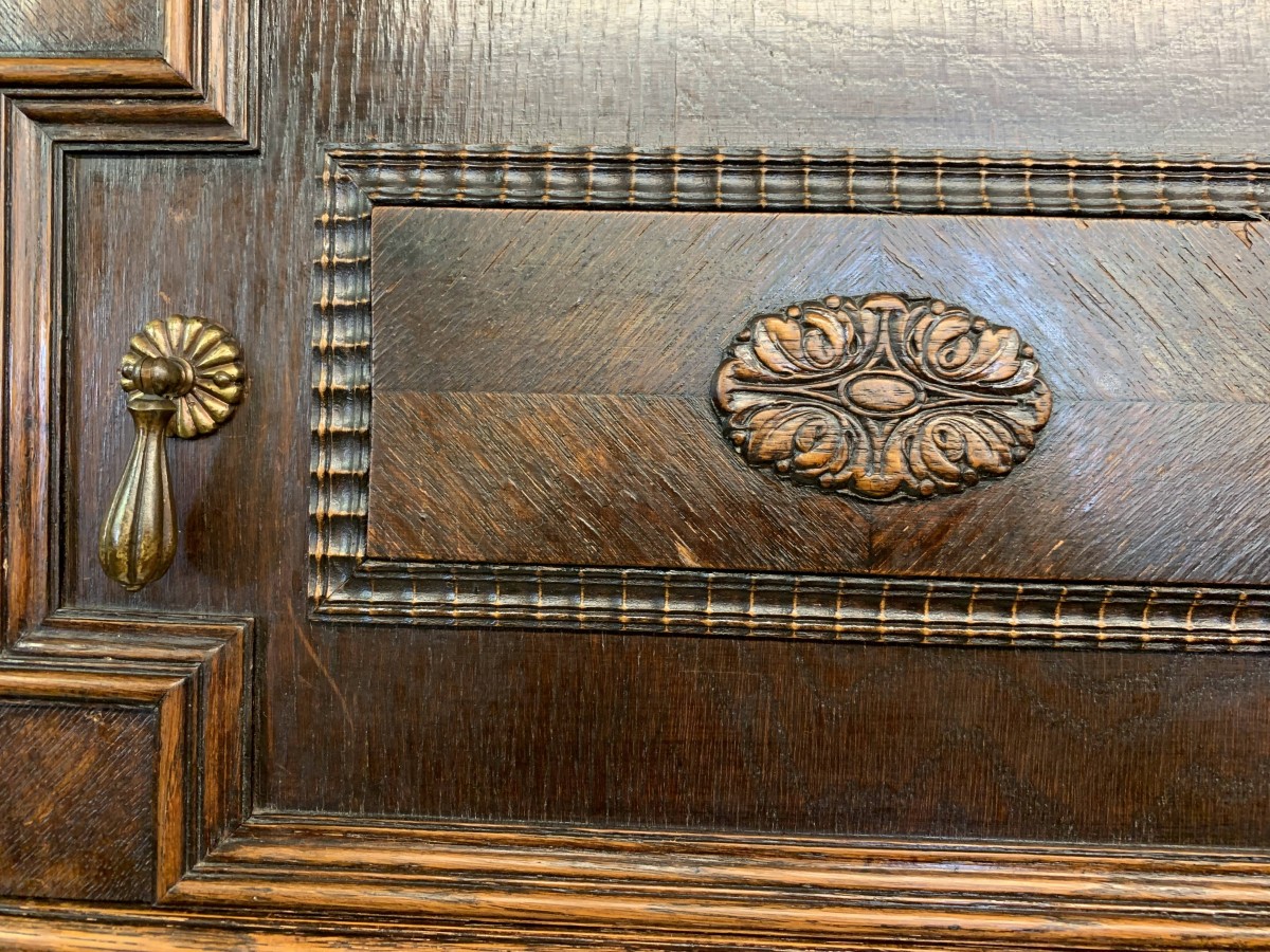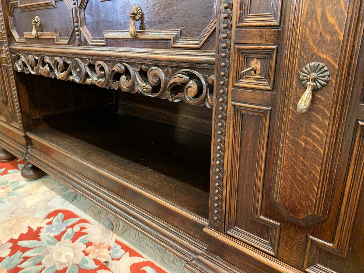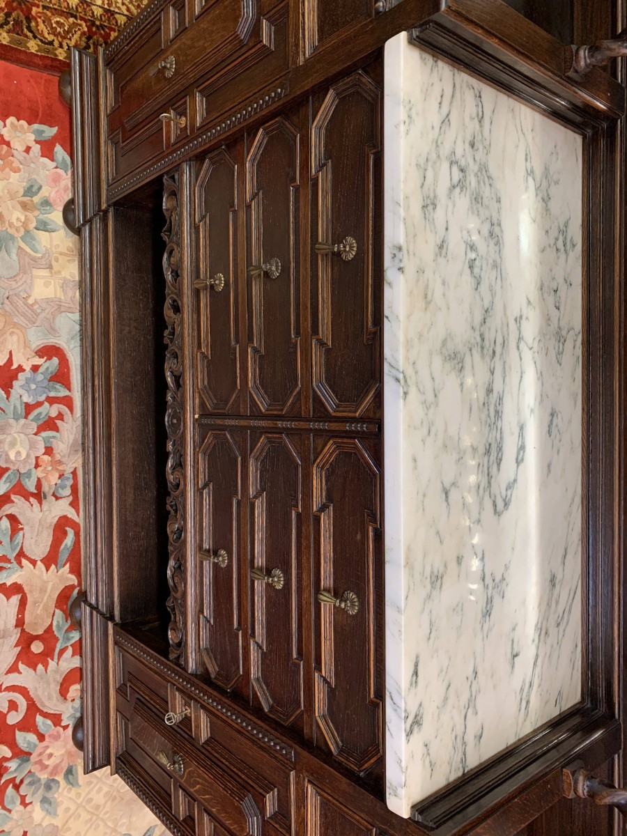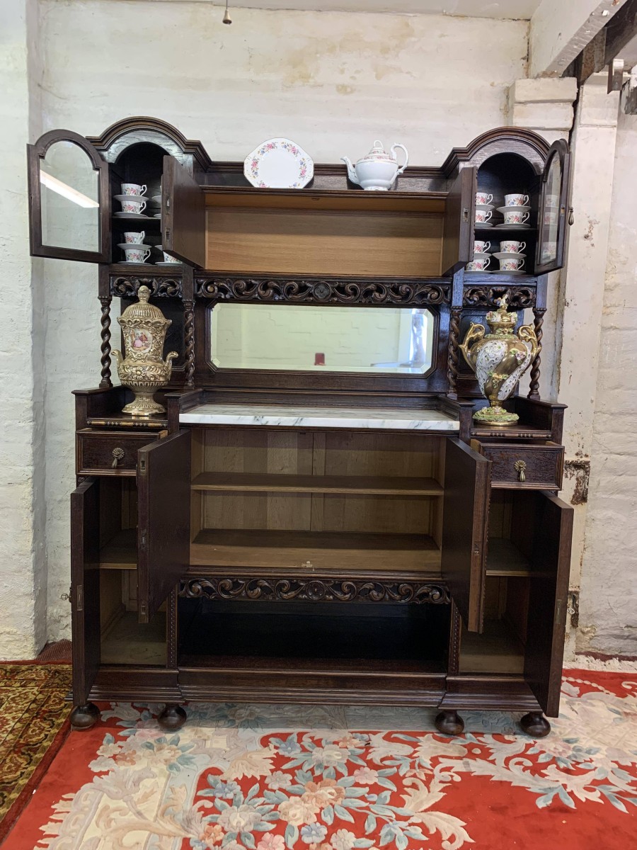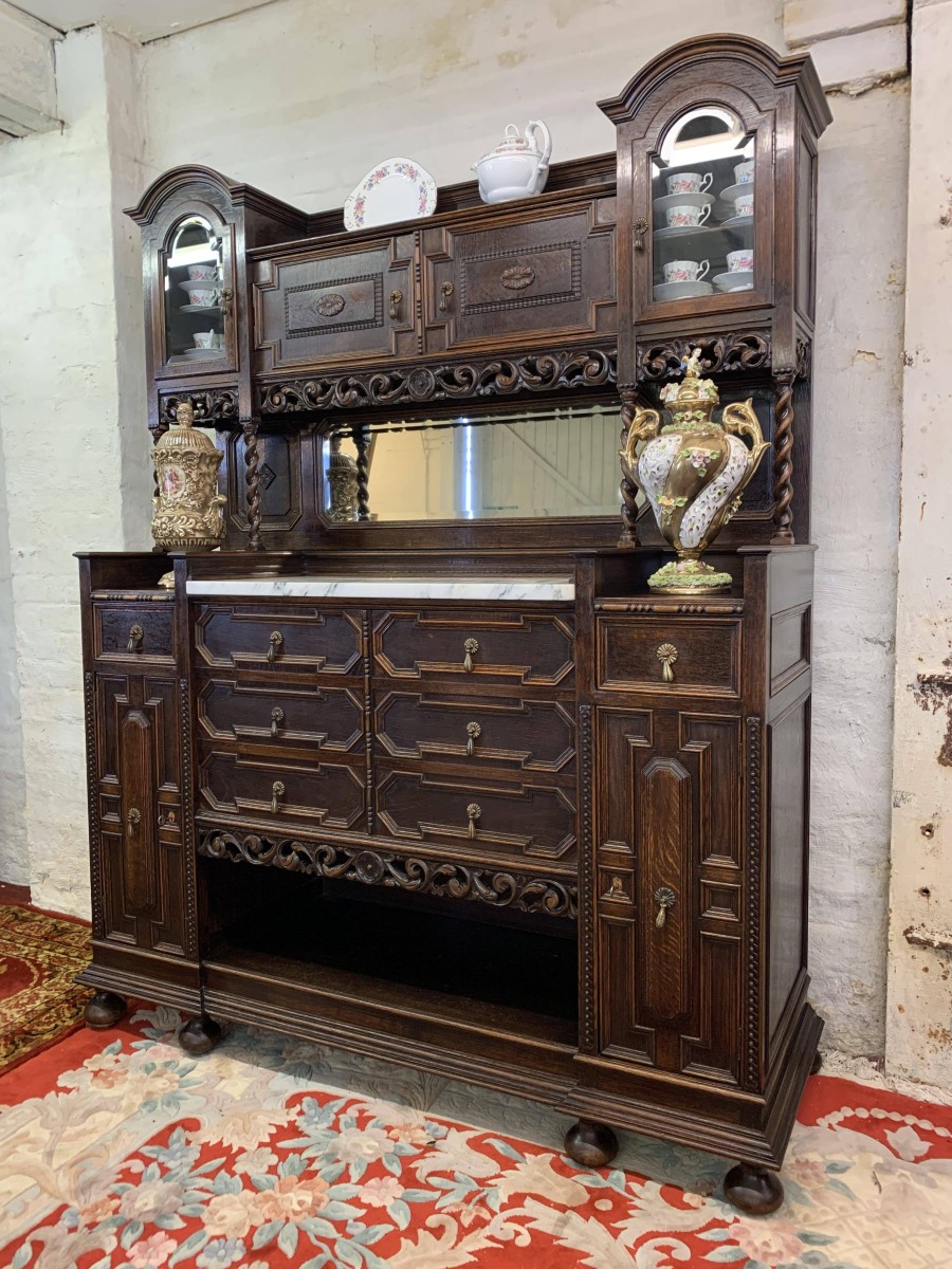An unusual antique oak barley twist dresser which is in super condition. The top section has a pair of carved recessed panelled doors, each door having a brass teardrop handle. The doors open to reveal storage space. To the sides are glazed dome top sections, each having a brass tear drop handle, bevel edged glazing and open to reveal a removable shelf top. Below each cupboard are a pair of barley twist supports with carving to the front and sides. There is a central bevelled mirror. The base section has a carrara marble insert which sits above a pair of cupboard doors with carvings below and an open section to the base. To the sides you have a drawer which sits above carved recessed panelled lockable cupboard door, the doors open to reveal a removable shelf. Recessed panelled sides this stunning antique item of oak furniture stands on six turned bulbous feet.