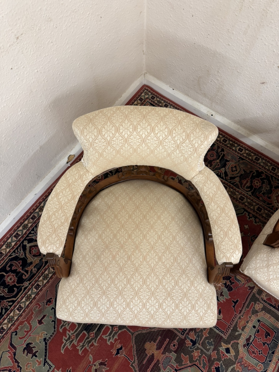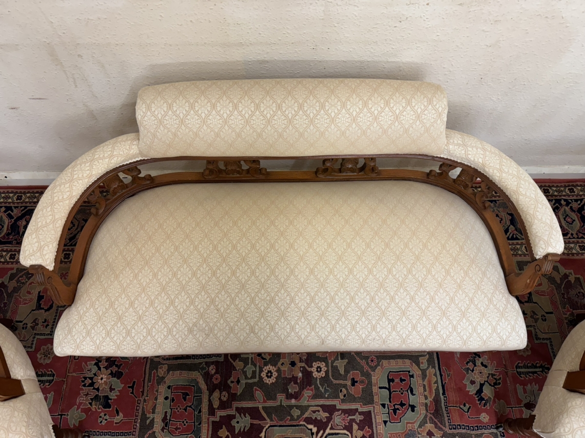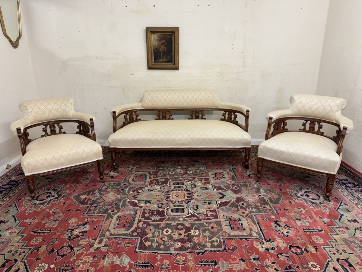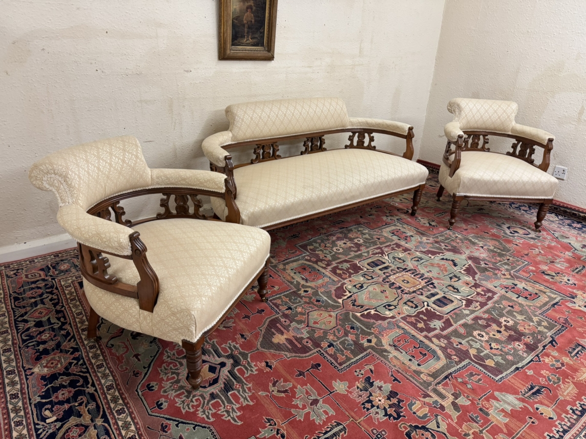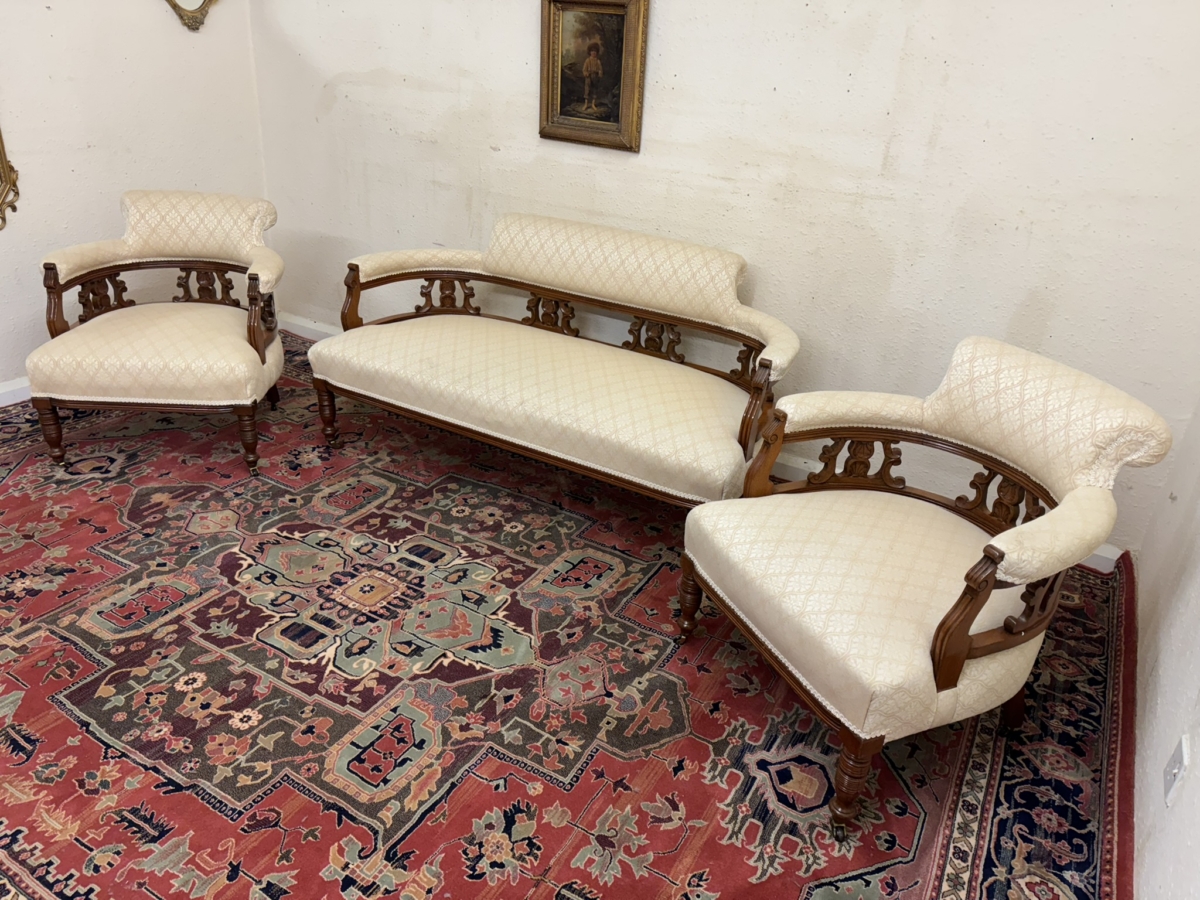 This fabulous set dates circa 1890. The settee and chairs each have a superb carved walnut frame with turned legs on original casters. The upholstery is in excellent condition. Both the settee and chairs are in strong sturdy condition.
