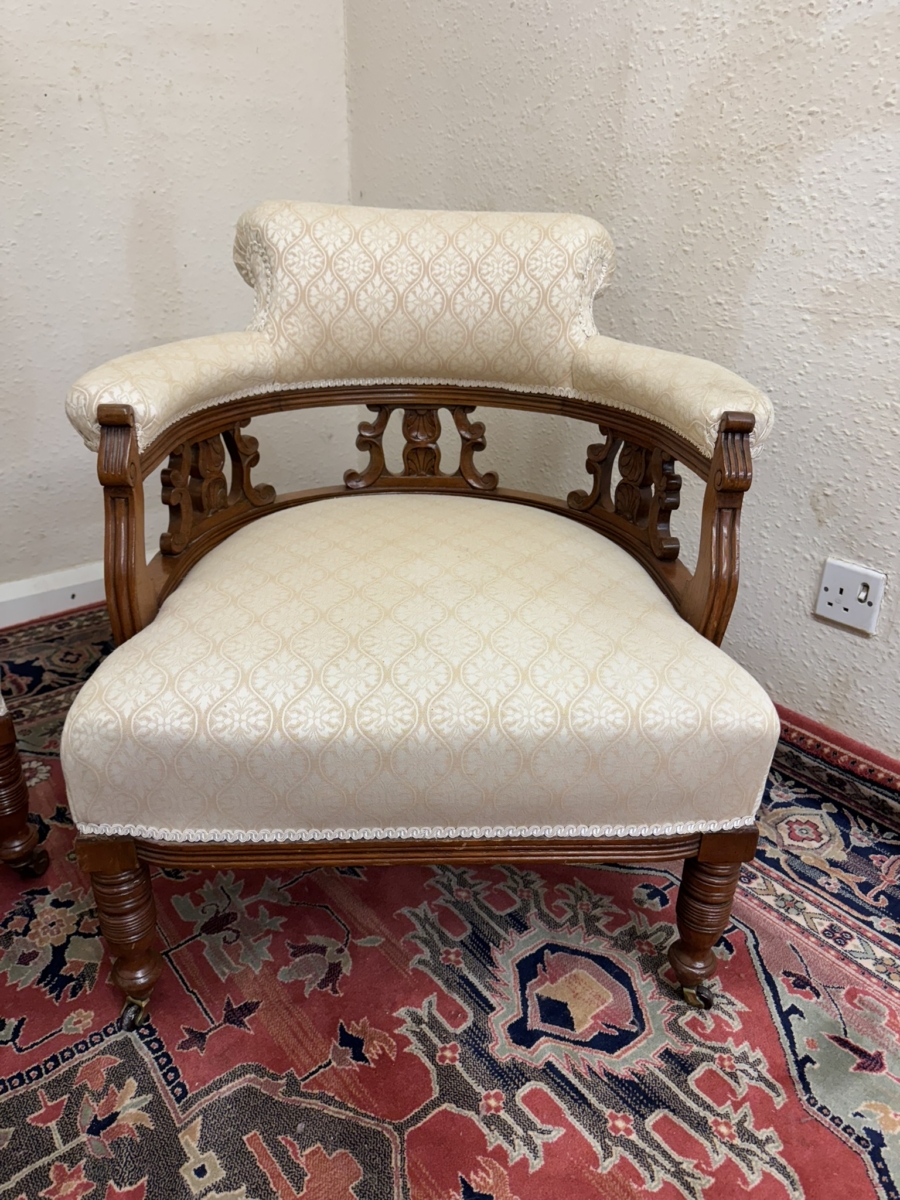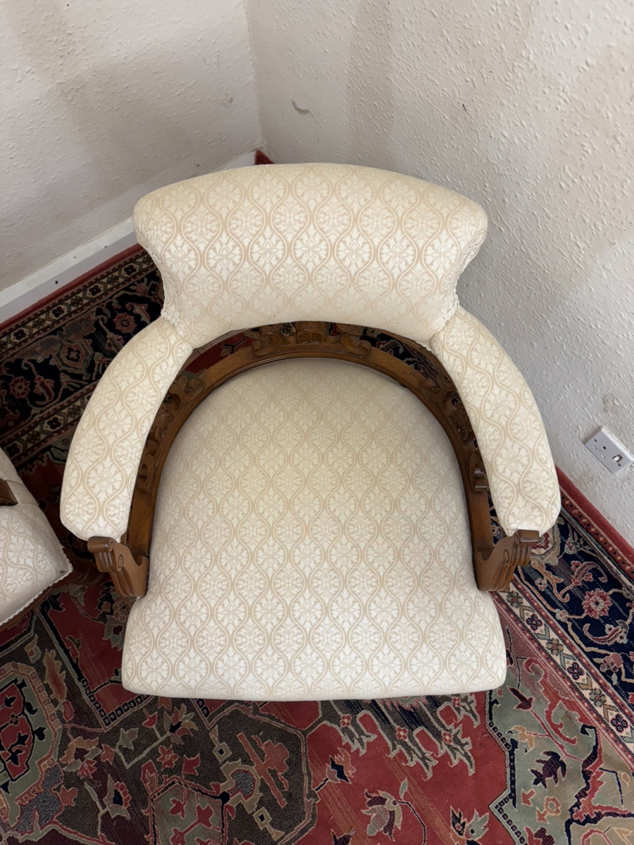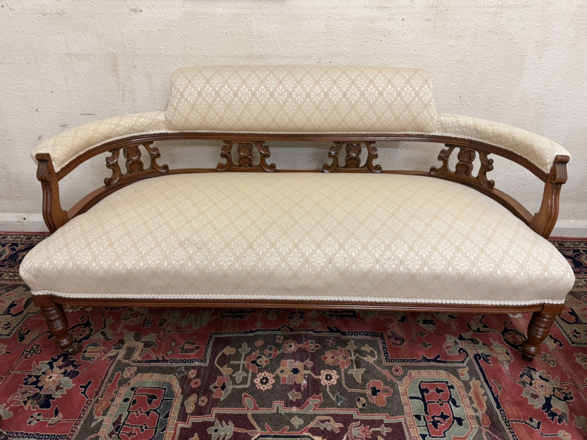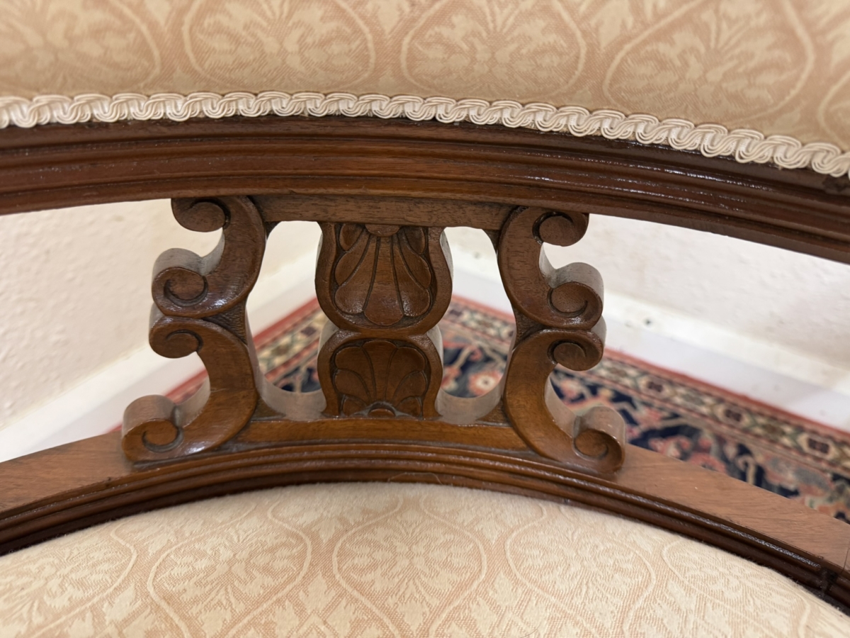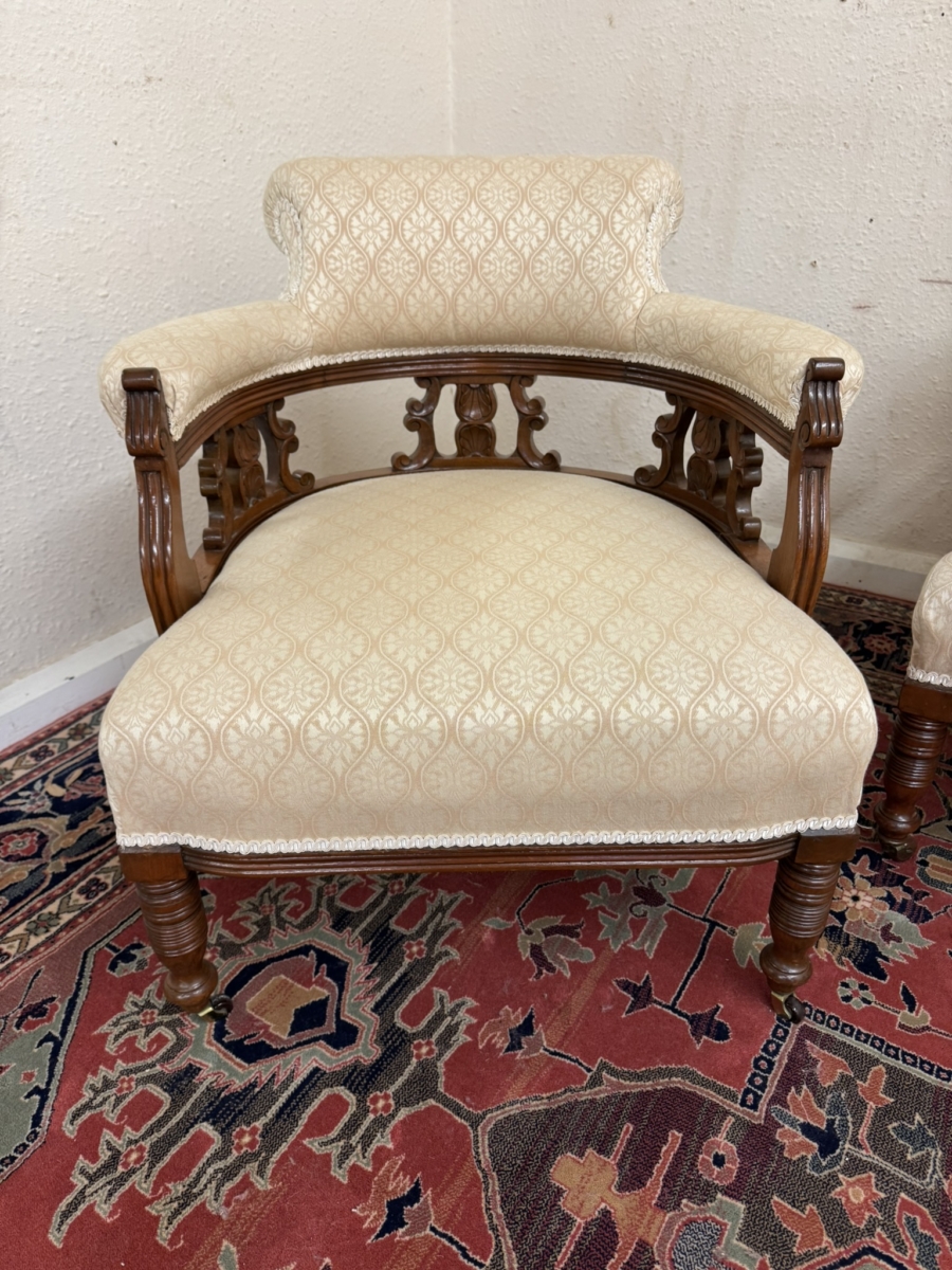 This fabulous set dates circa 1890. The settee and chairs each have a superb carved walnut frame with turned legs on original casters. The upholstery is in excellent condition. Both the settee and chairs are in strong sturdy condition.