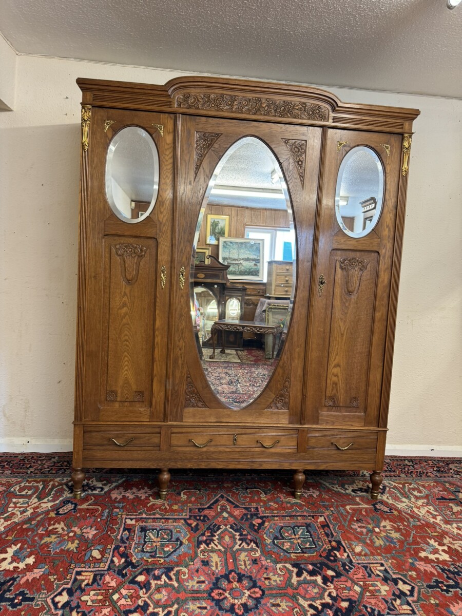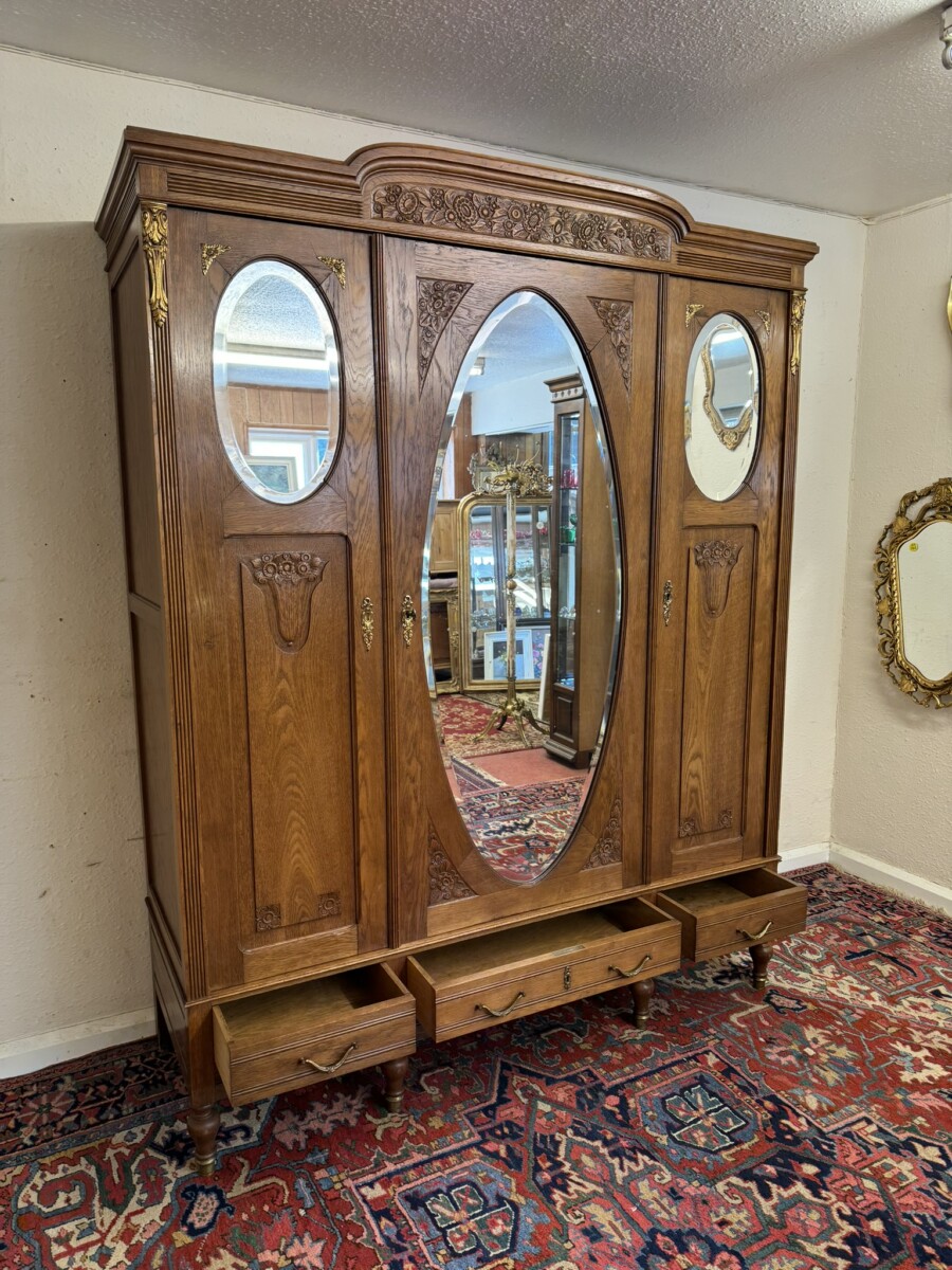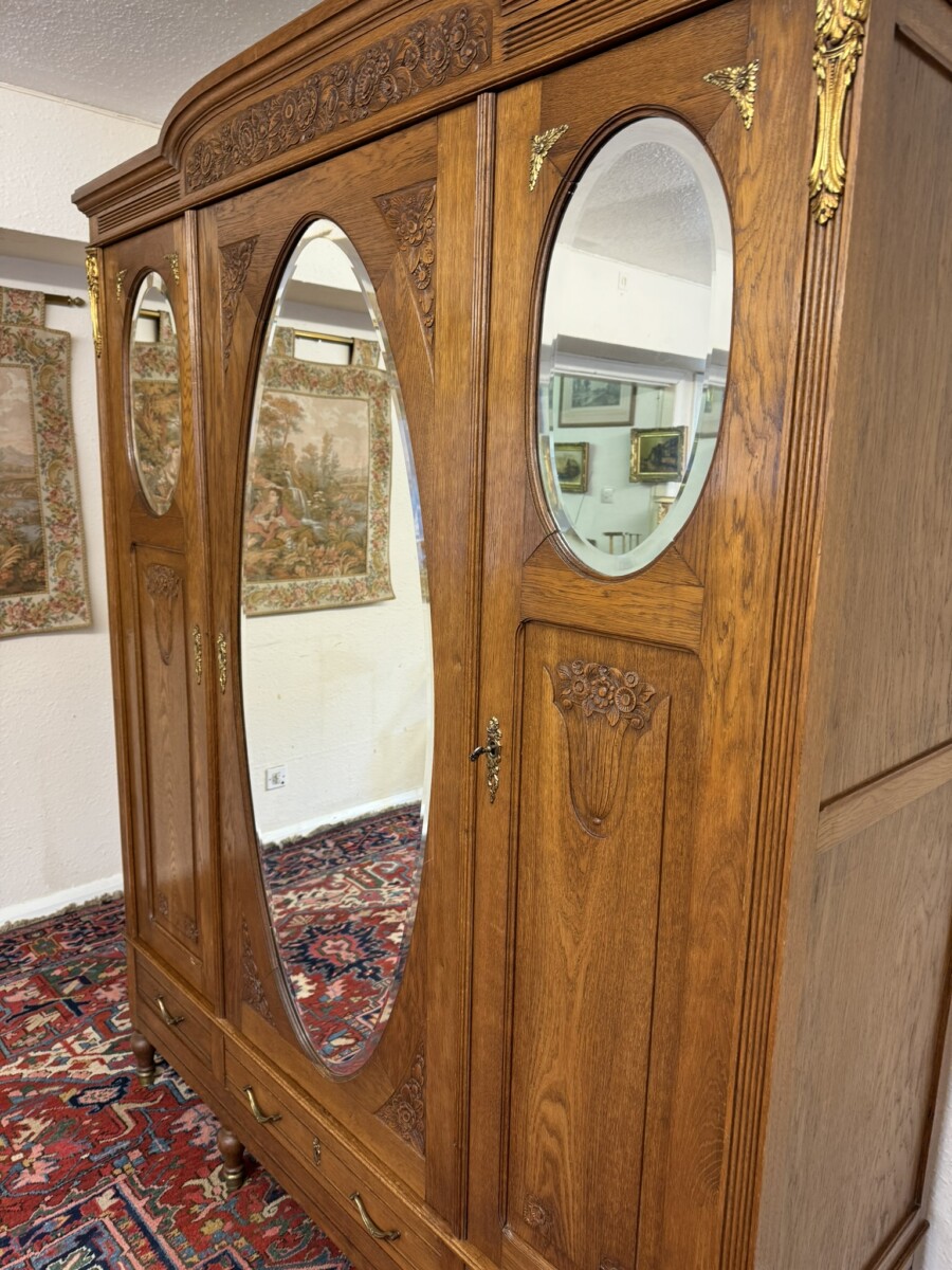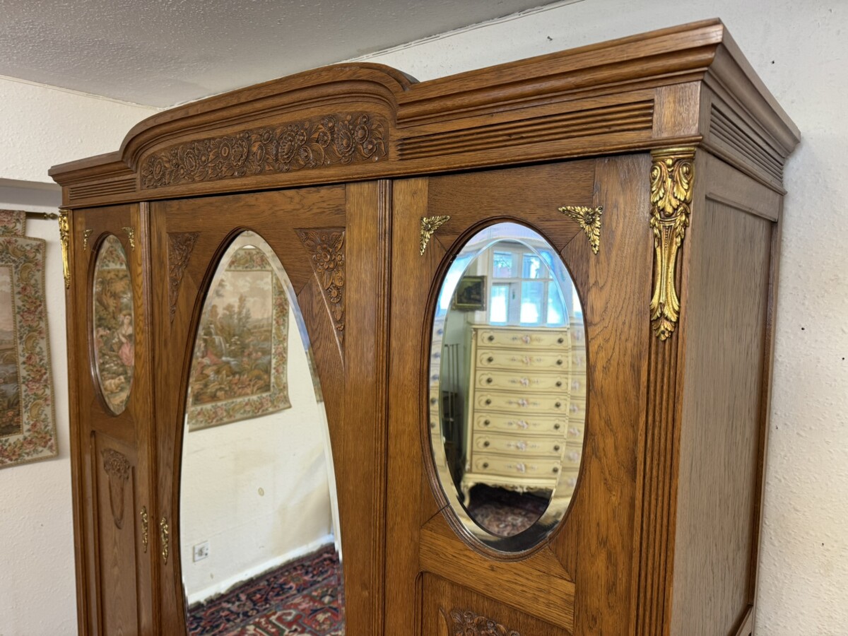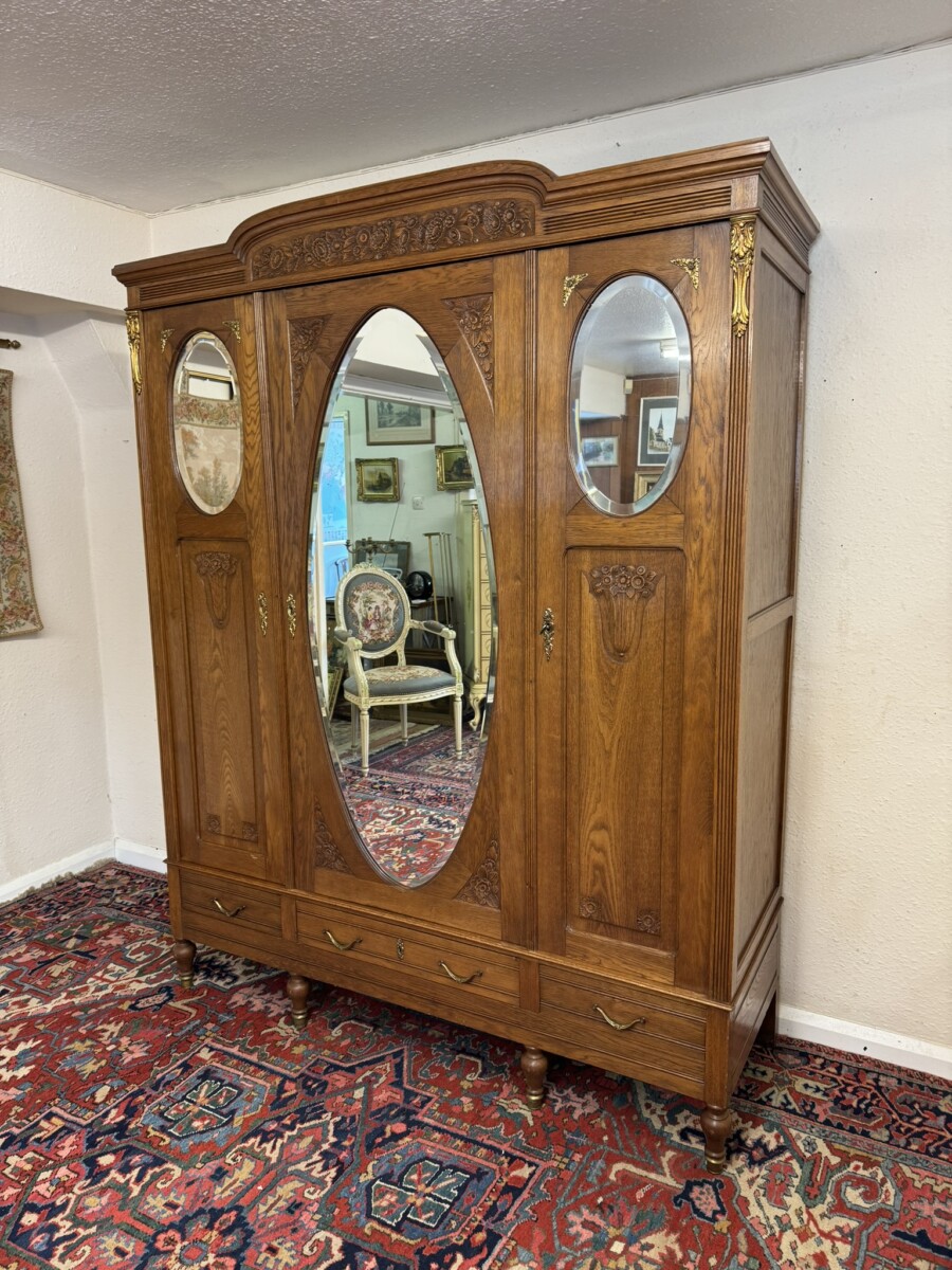 This fabulous armoire dates circa 1920. The shaped oversailing top has central decorative carvings, below is a central lockable door with carvings and full length oval bevel edged dressing mirror. The central mirror is flanked by a pair of lockable doors, each door having an oval bevel edged mirrored shaped carved panel with gilt brass decoration. The doors open to reveal a hanging rails. Three drawers below, recessed panelled sides and standing on four turned legs with brass capped feet.