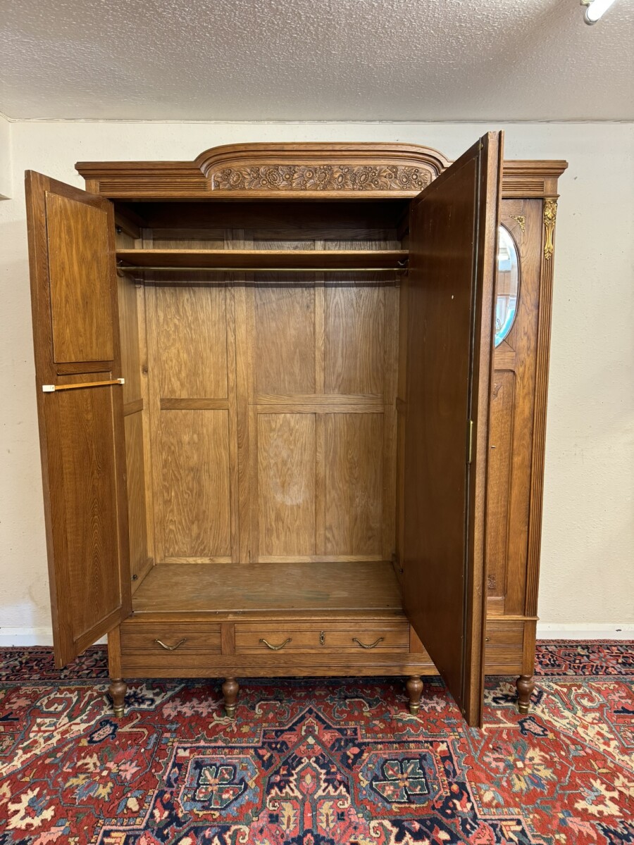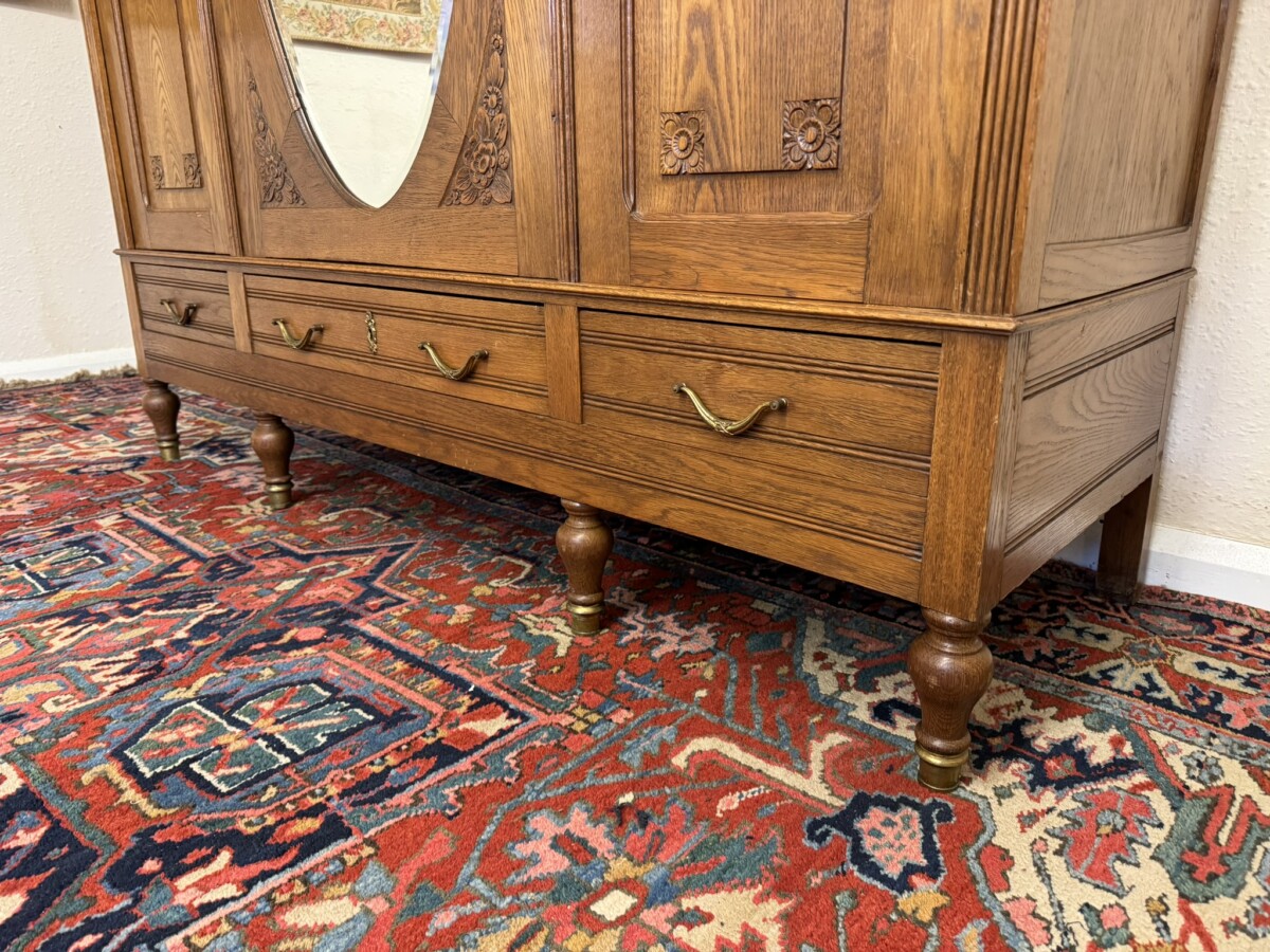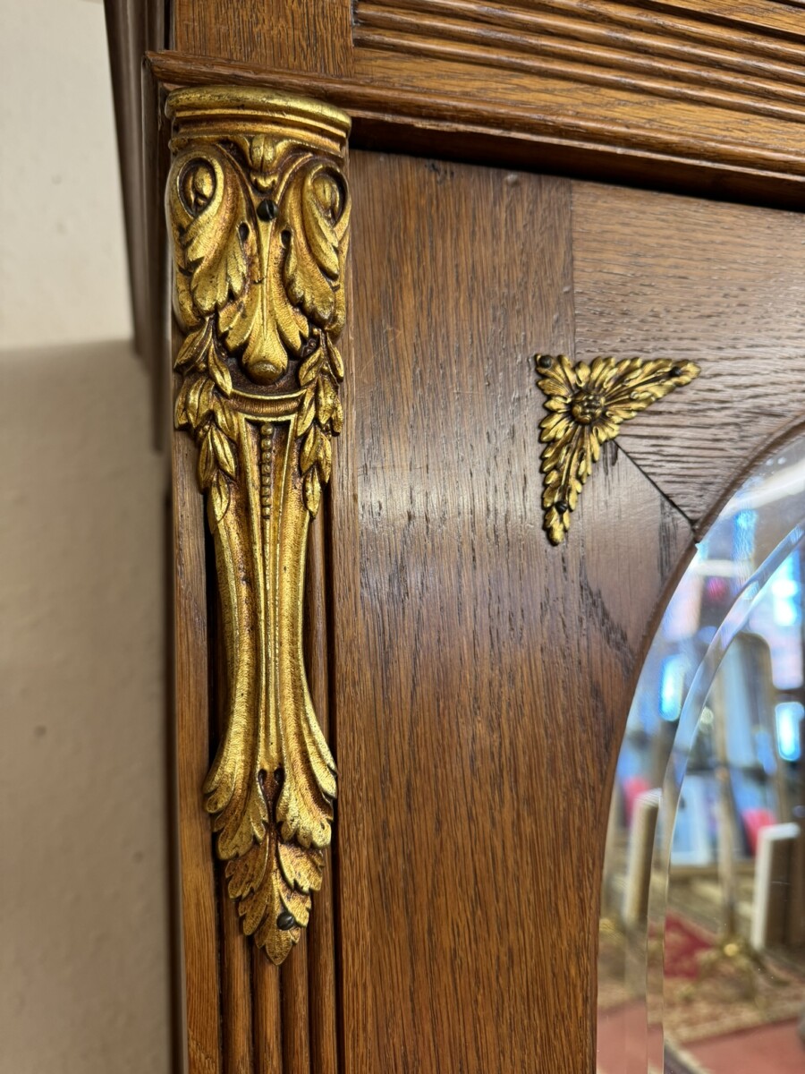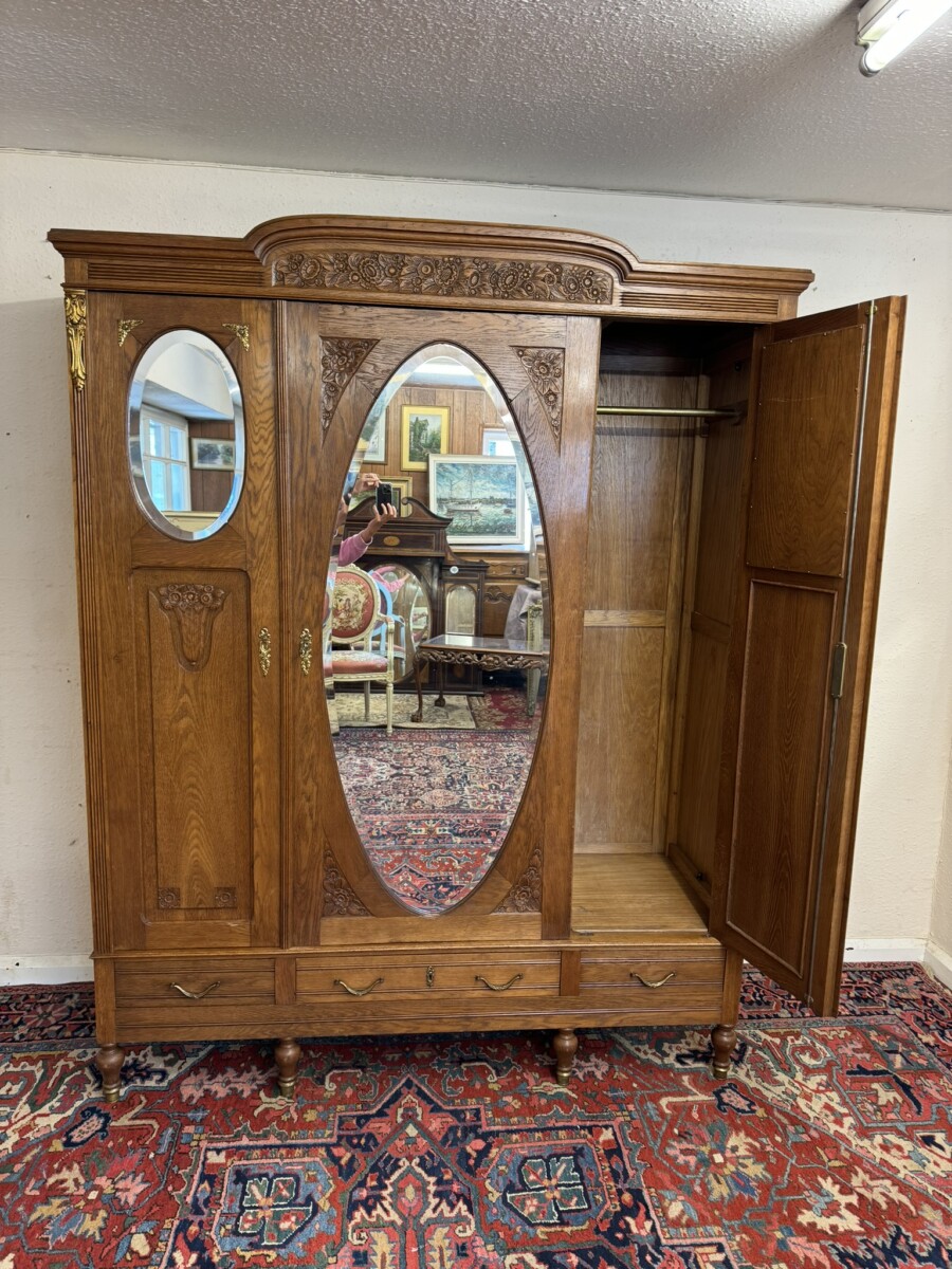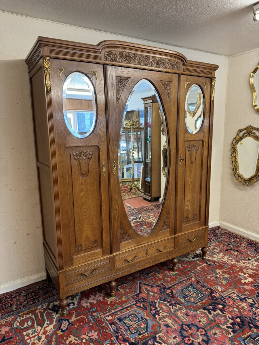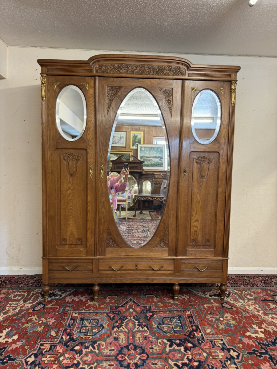 This fabulous armoire dates circa 1920. The shaped oversailing top has central decorative carvings, below is a central lockable door with carvings and full length oval bevel edged dressing mirror. The central mirror is flanked by a pair of lockable doors, each door having an oval bevel edged mirrored shaped carved panel with gilt brass decoration. The doors open to reveal a hanging rails. Three drawers below, recessed panelled sides and standing on four turned legs with brass capped feet.