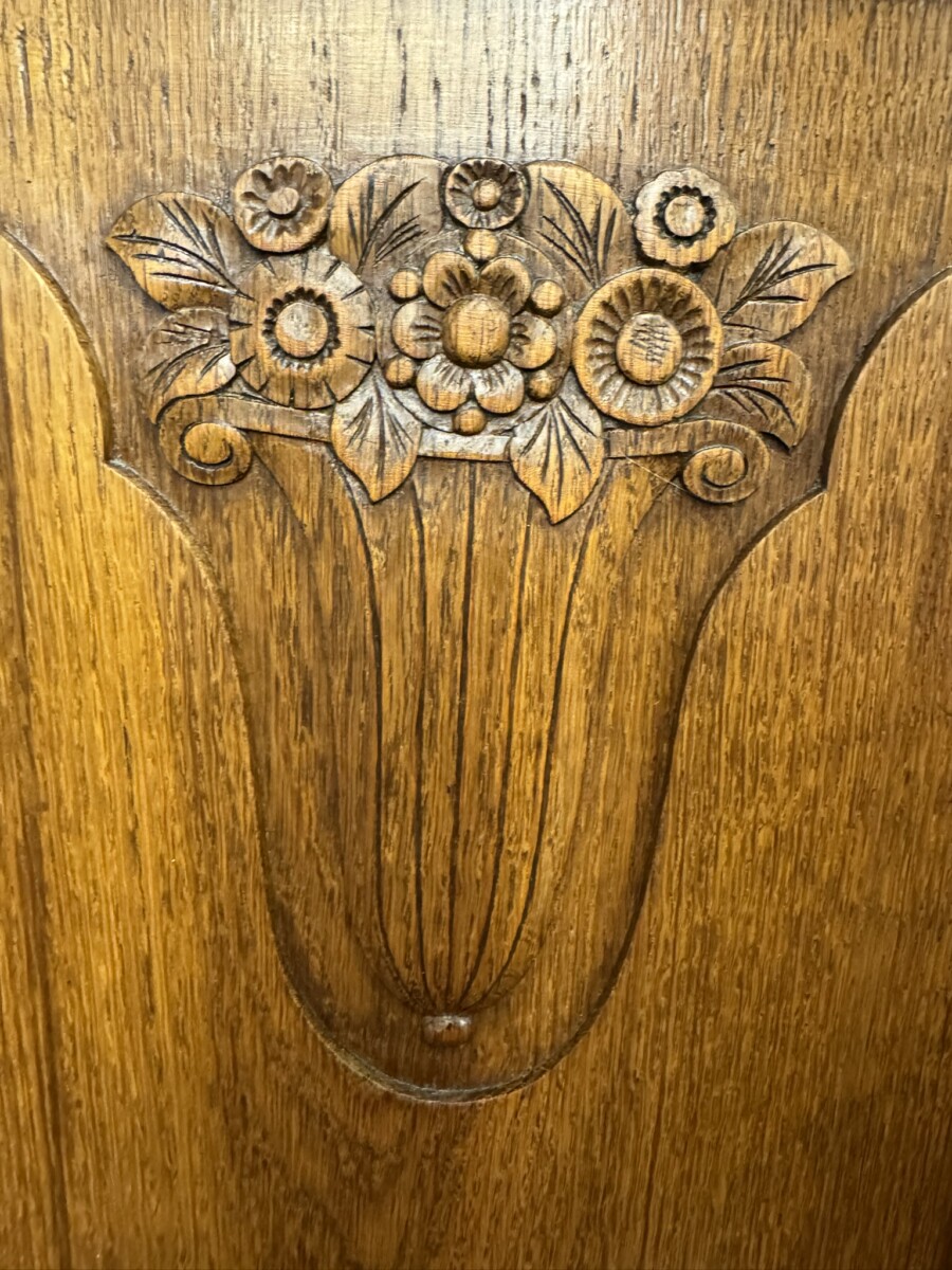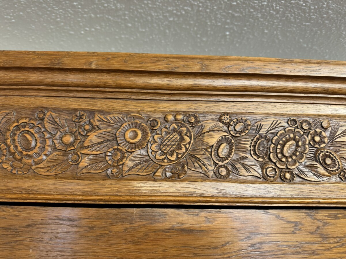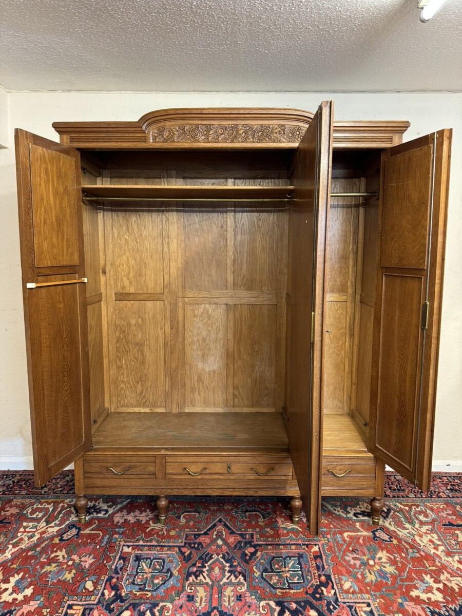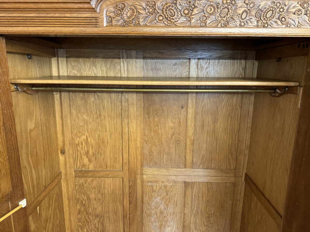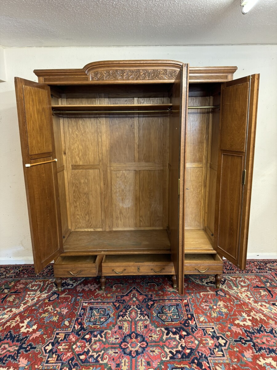 This fabulous armoire dates circa 1920. The shaped oversailing top has central decorative carvings, below is a central lockable door with carvings and full length oval bevel edged dressing mirror. The central mirror is flanked by a pair of lockable doors, each door having an oval bevel edged mirrored shaped carved panel with gilt brass decoration. The doors open to reveal a hanging rails. Three drawers below, recessed panelled sides and standing on four turned legs with brass capped feet.