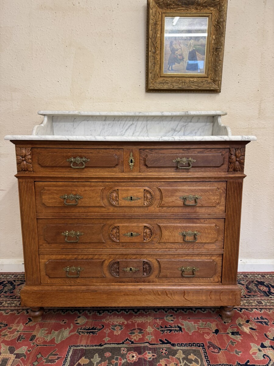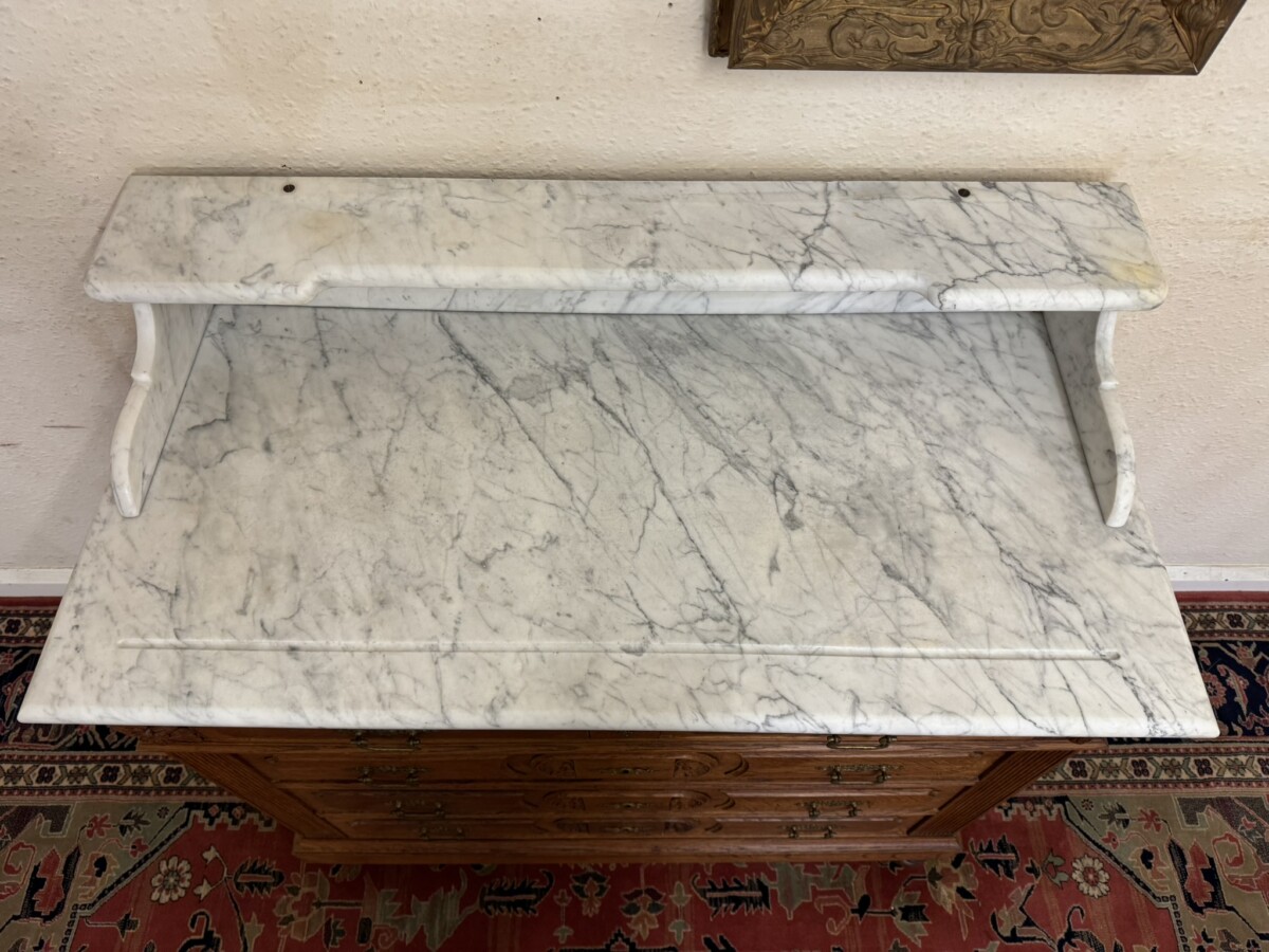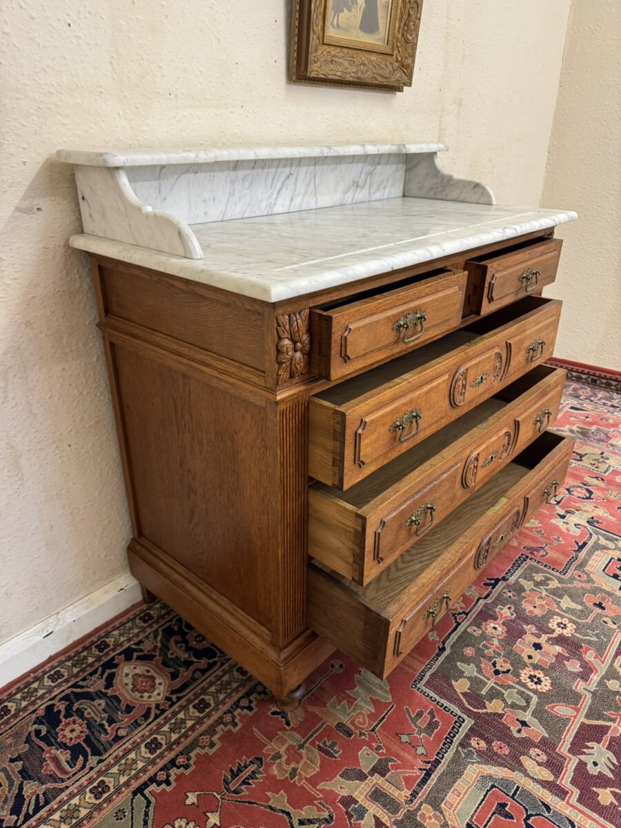 This fine commode dates circa 1890 and is in excellent condition. The carrera white marble top has a shaped back shelf, below are a pair of short drawers, each drawer having a brass handles. Three long drawers each with central carving and a pair of brass handles. Carved reeded decoration, recessed panelled sides and standing on two turned feet to the front.