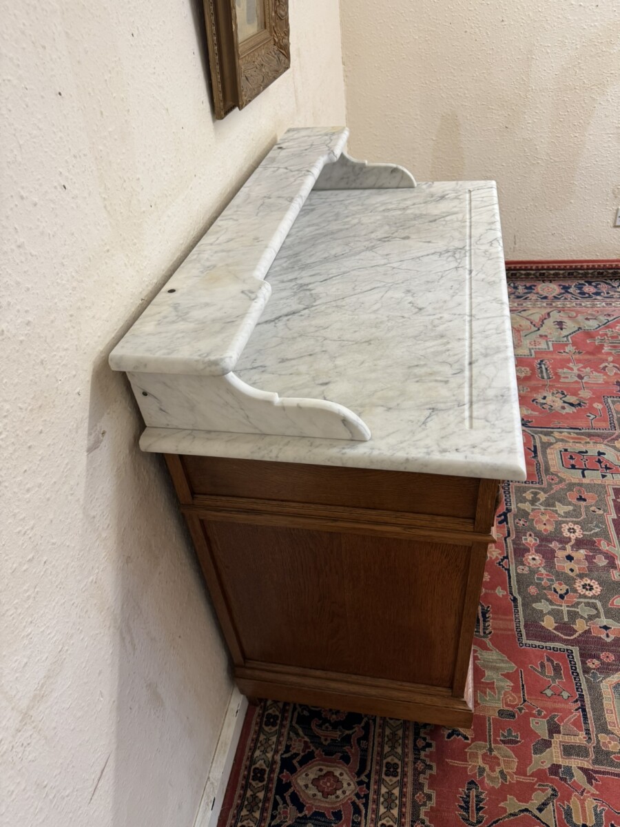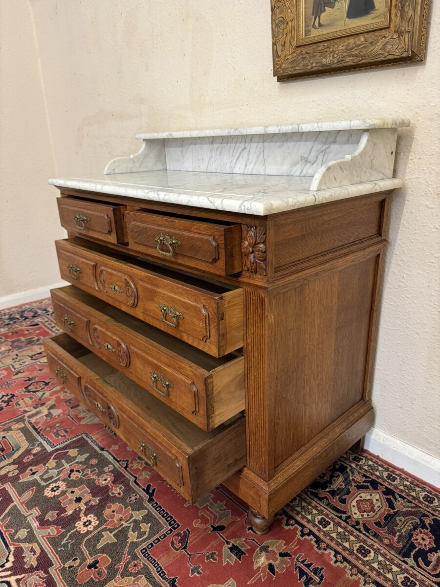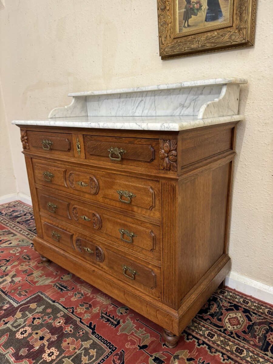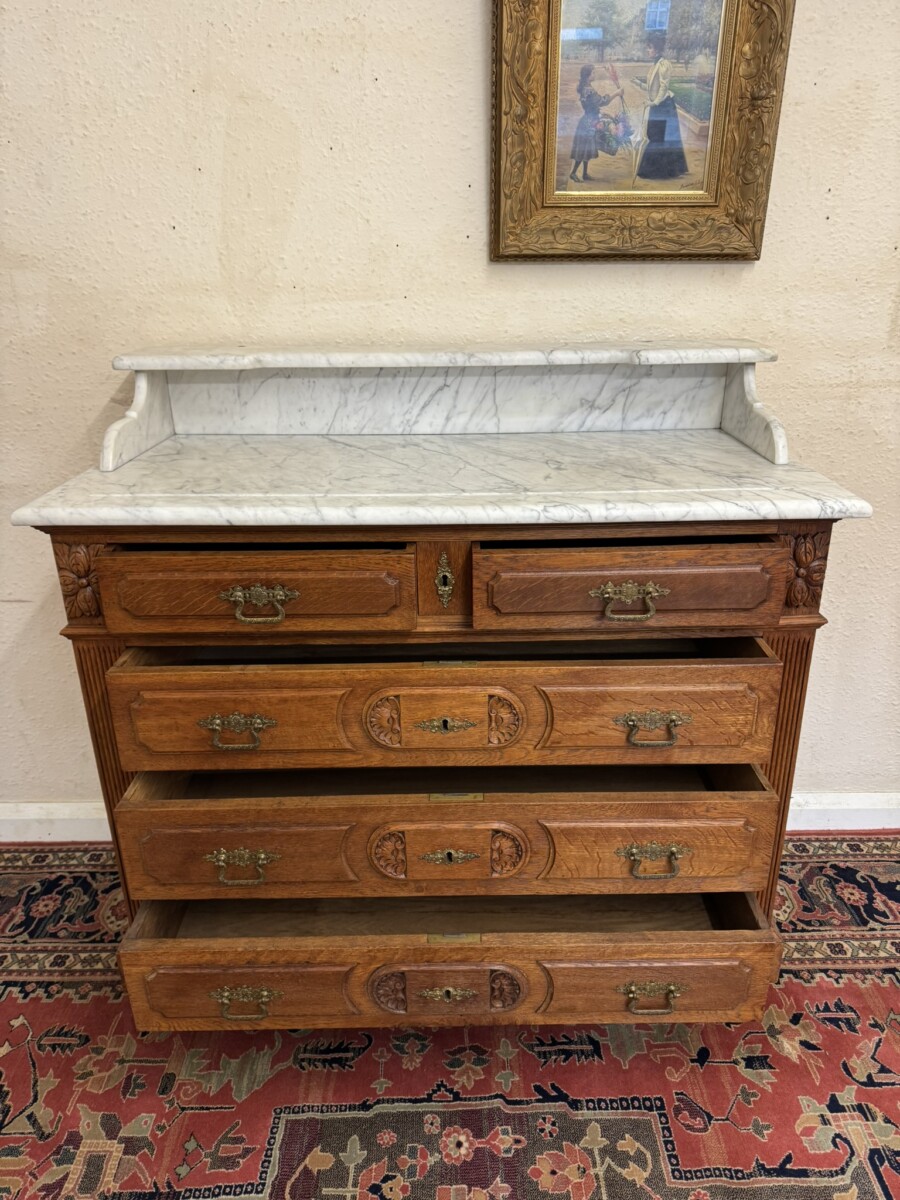 This fine commode dates circa 1890 and is in excellent condition. The carrera white marble top has a shaped back shelf, below are a pair of short drawers, each drawer having a brass handles. Three long drawers each with central carving and a pair of brass handles. Carved reeded decoration, recessed panelled sides and standing on two turned feet to the front.