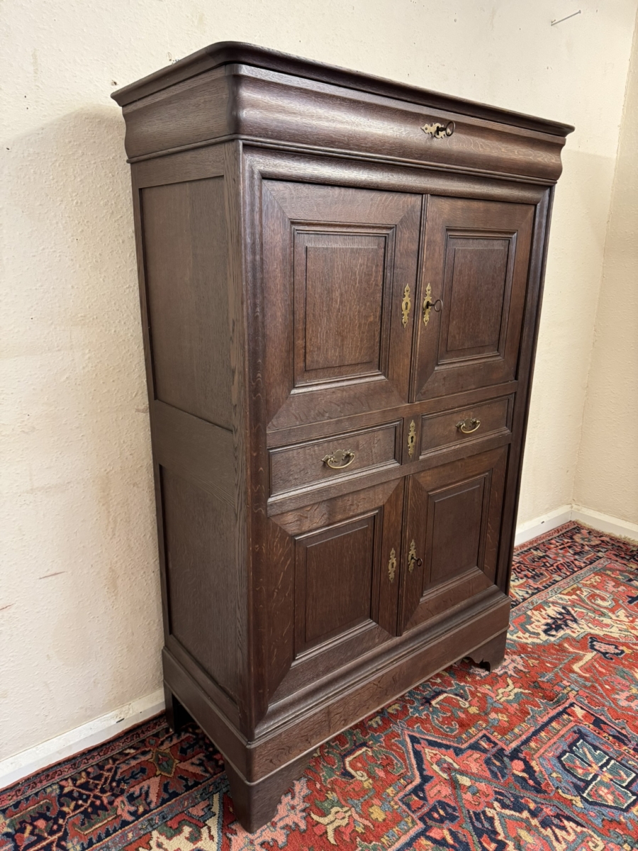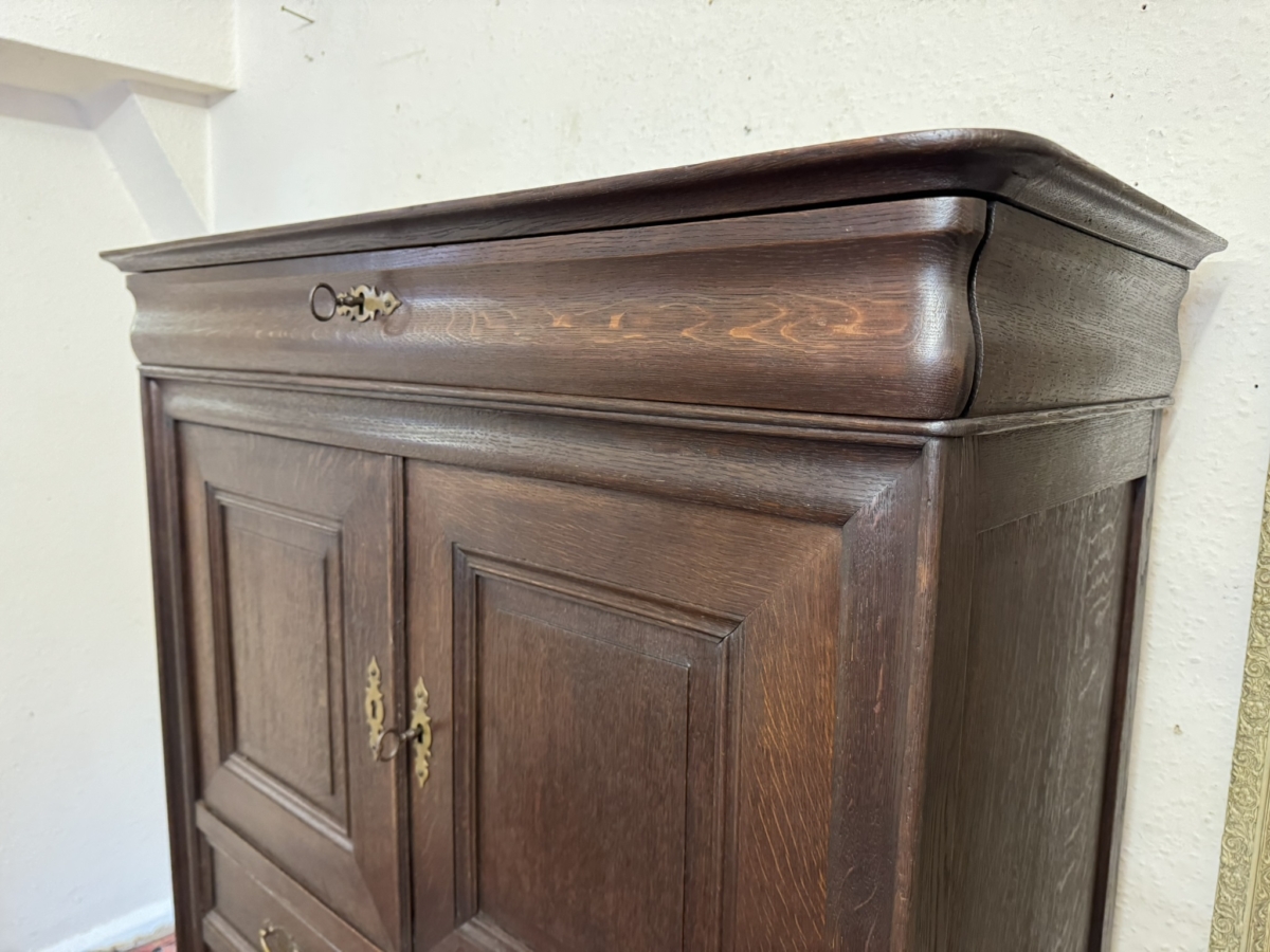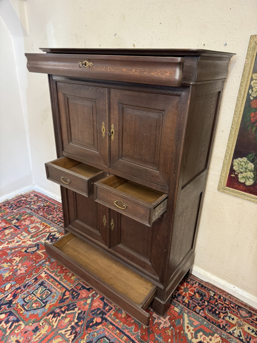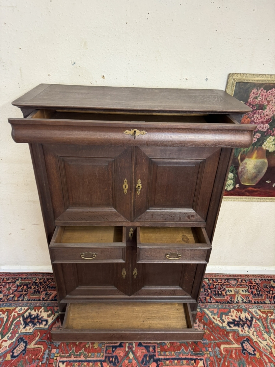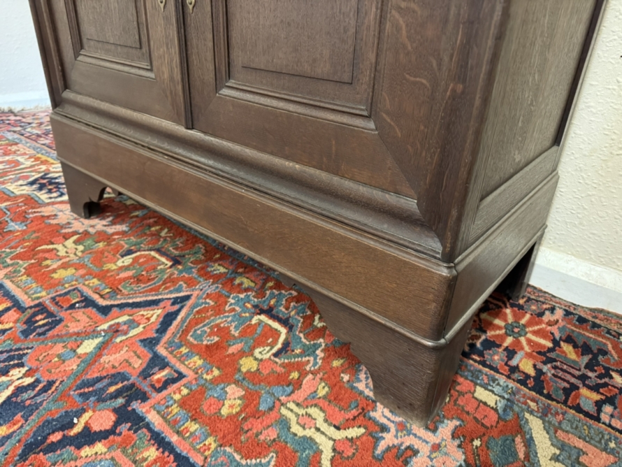 The cabinet dates circa 1900. The oversailing top has rounded corners to the front, below is a lockable drawer, which sits above a pair of lockable recessed panelled doors, the doors open to reveal a wooden shelf. Two short drawers below sitting above a pair of lockable recessed panelled cupboard doors, these doors open and also reveal a shelf. Recessed panelled sides and standing on bracket feet.
