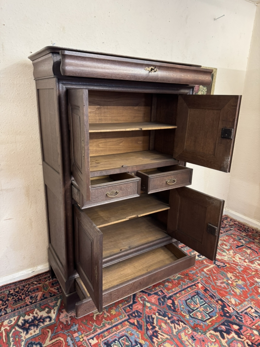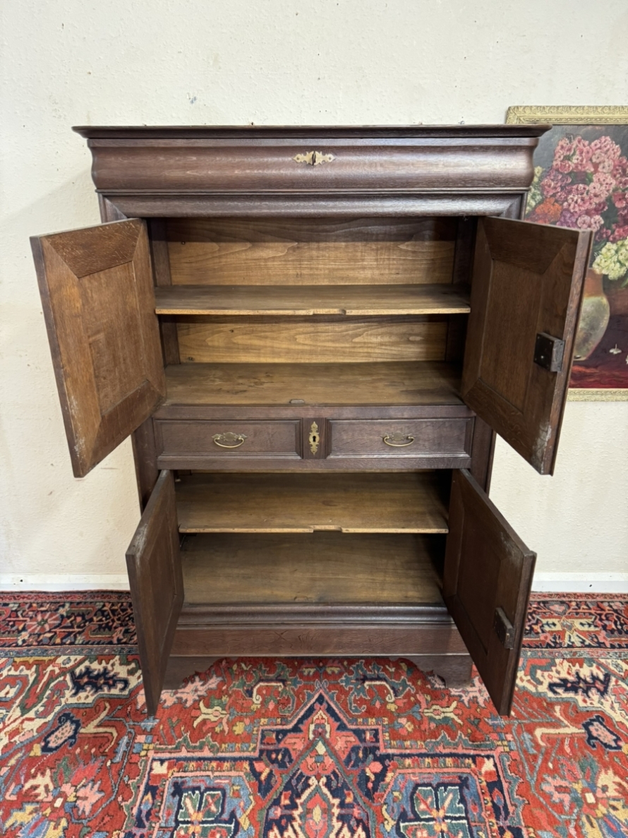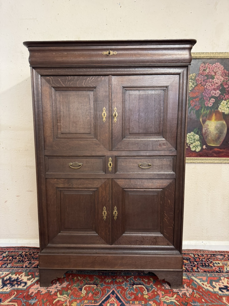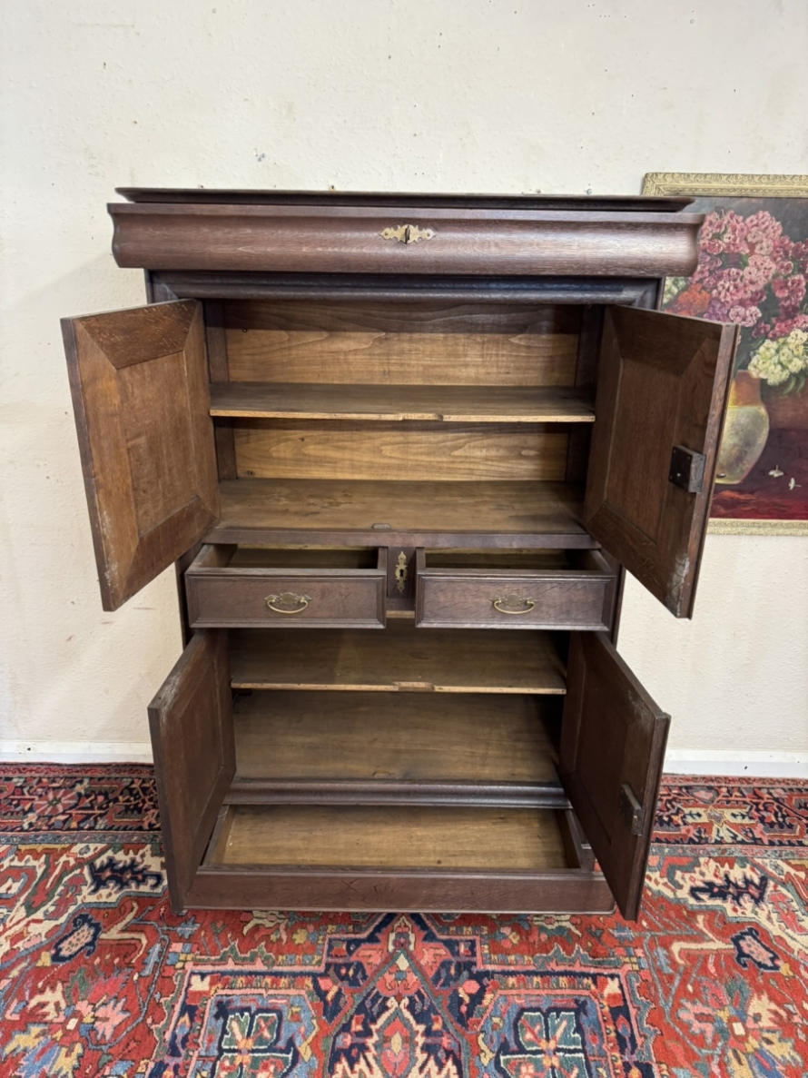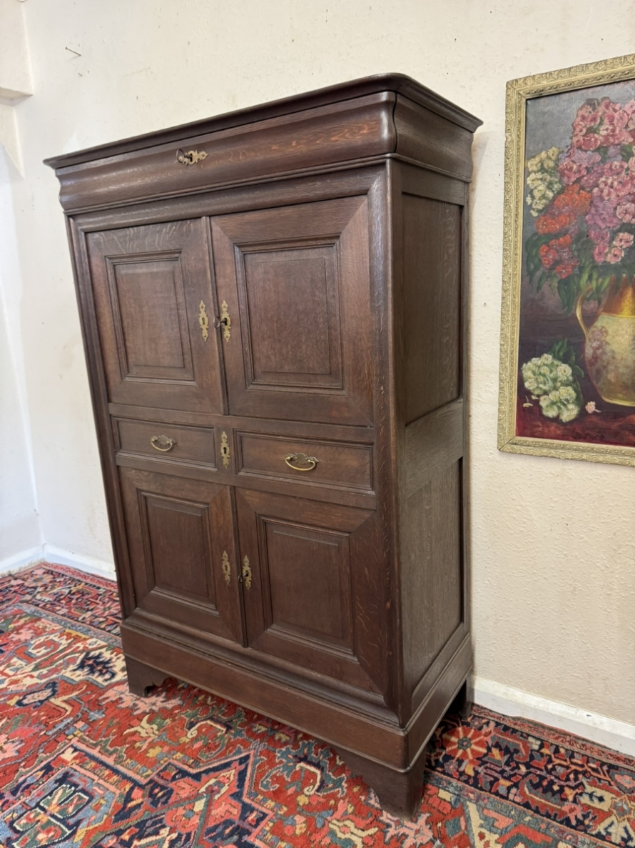 The cabinet dates circa 1900. The oversailing top has rounded corners to the front, below is a lockable drawer, which sits above a pair of lockable recessed panelled doors, the doors open to reveal a wooden shelf. Two short drawers below sitting above a pair of lockable recessed panelled cupboard doors, these doors open and also reveal a shelf. Recessed panelled sides and standing on bracket feet.