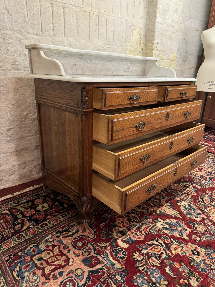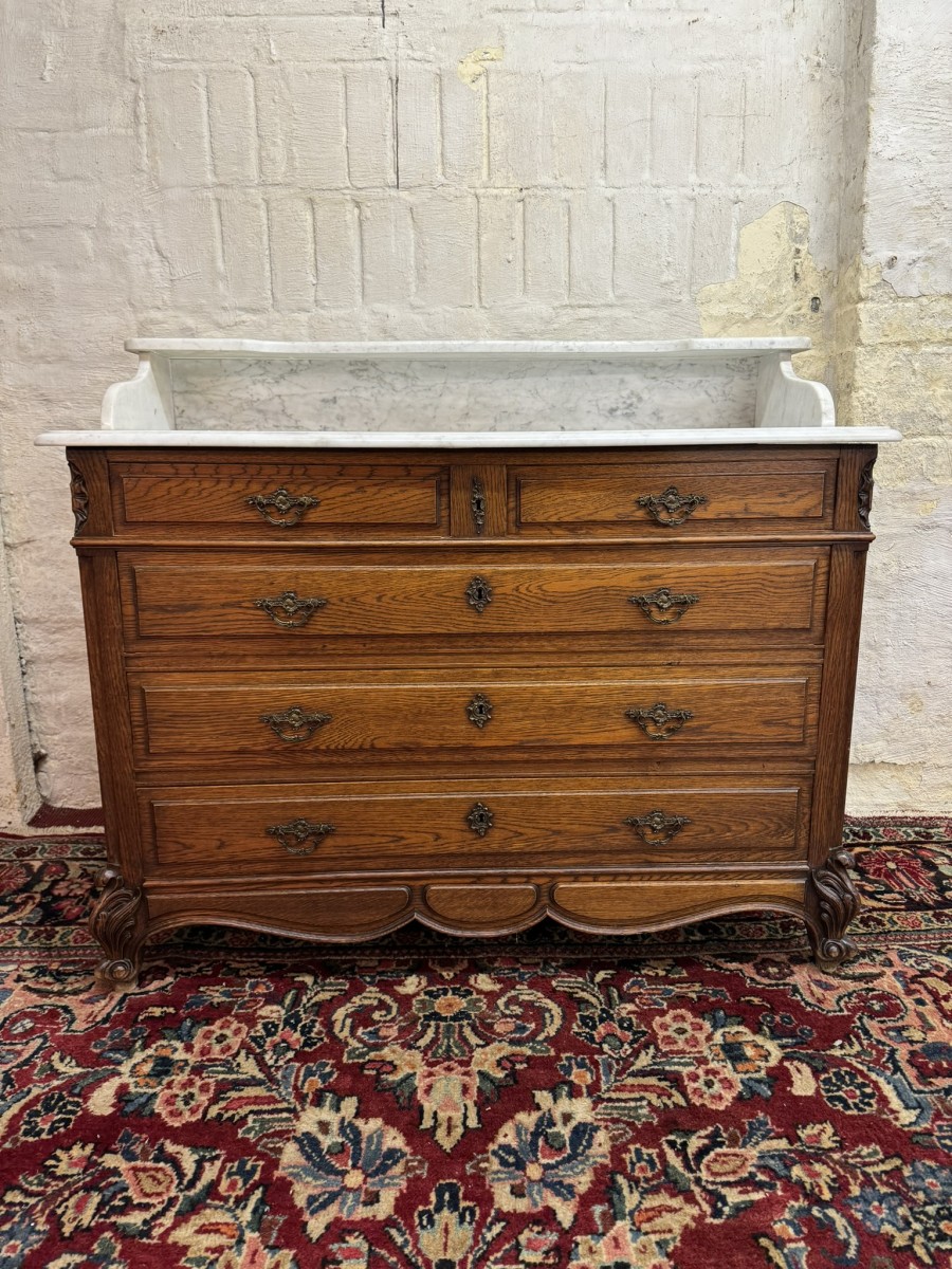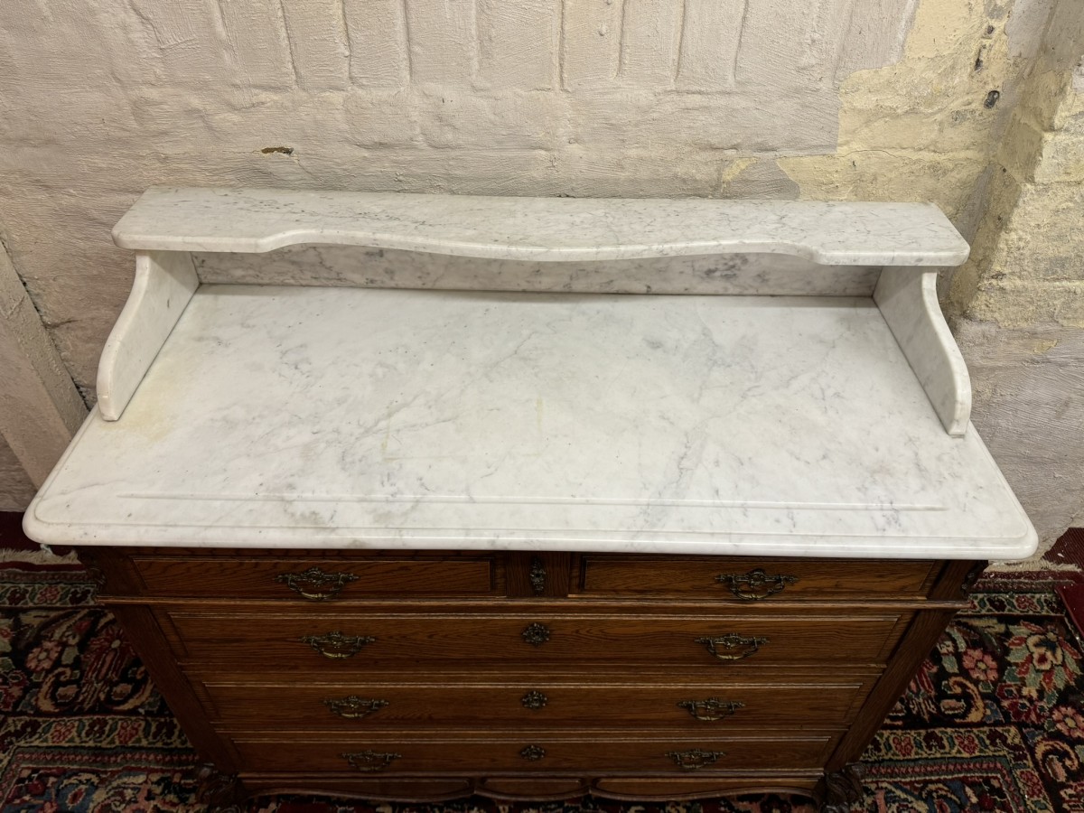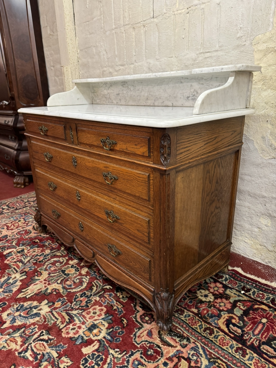 This fabulous French oak commode dates circa 1900. The carrera white marble top has a shaped shelf, below are a pair of short drawers and three long drawers. The short drawers having an ornate brass handle and the long drawers having a pair of ornate brass handles. Recessed panelled sides, shaped skirt this outstanding quality French oak commode stands on two carved cabriole legs to the front.