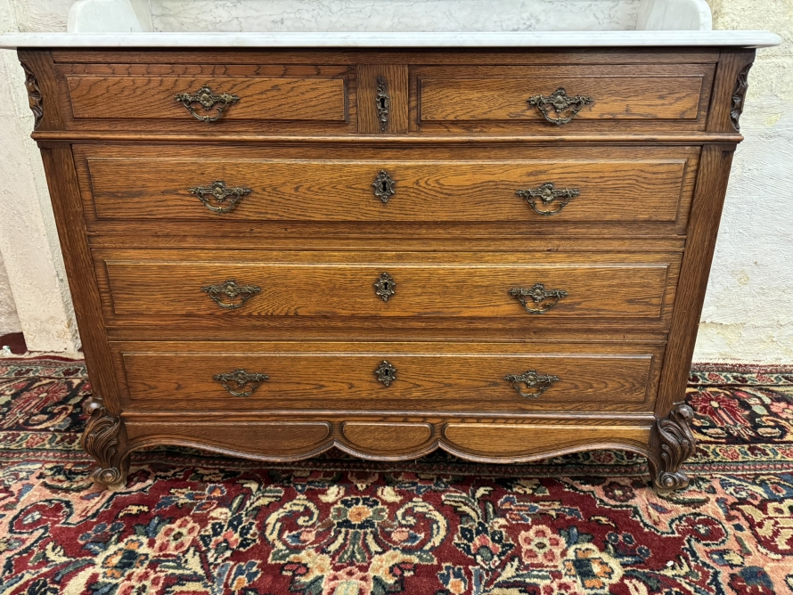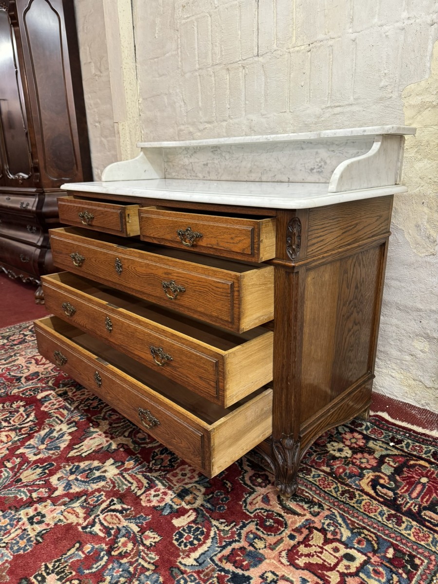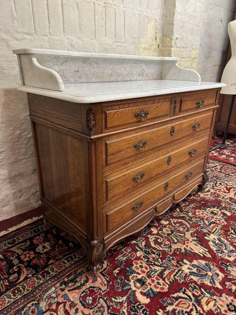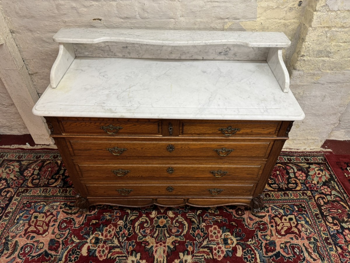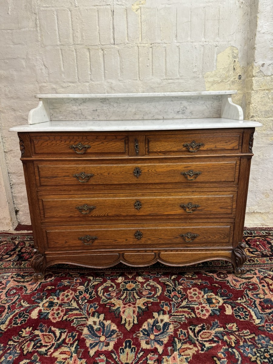 This fabulous French oak commode dates circa 1900. The carrera white marble top has a shaped shelf, below are a pair of short drawers and three long drawers. The short drawers having an ornate brass handle and the long drawers having a pair of ornate brass handles. Recessed panelled sides, shaped skirt this outstanding quality French oak commode stands on two carved cabriole legs to the front.