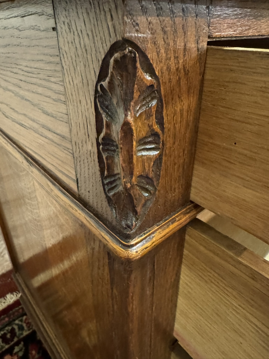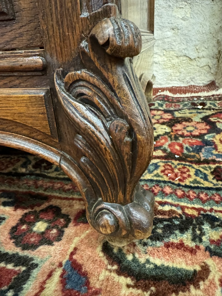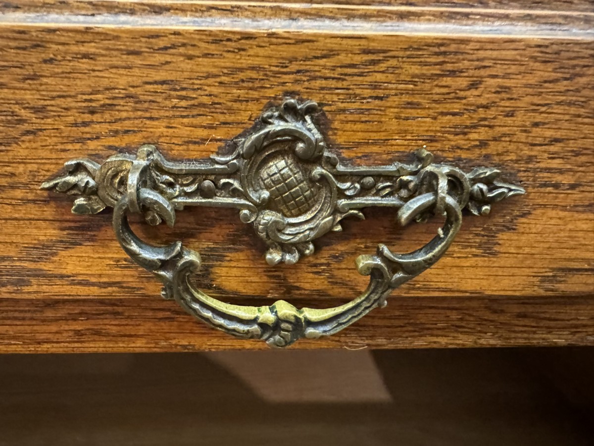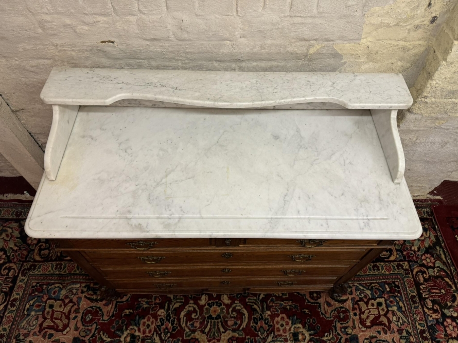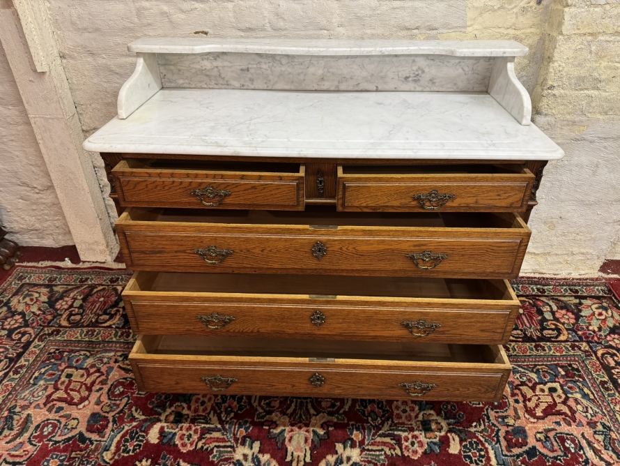 This fabulous French oak commode dates circa 1900. The carrera white marble top has a shaped shelf, below are a pair of short drawers and three long drawers. The short drawers having an ornate brass handle and the long drawers having a pair of ornate brass handles. Recessed panelled sides, shaped skirt this outstanding quality French oak commode stands on two carved cabriole legs to the front.