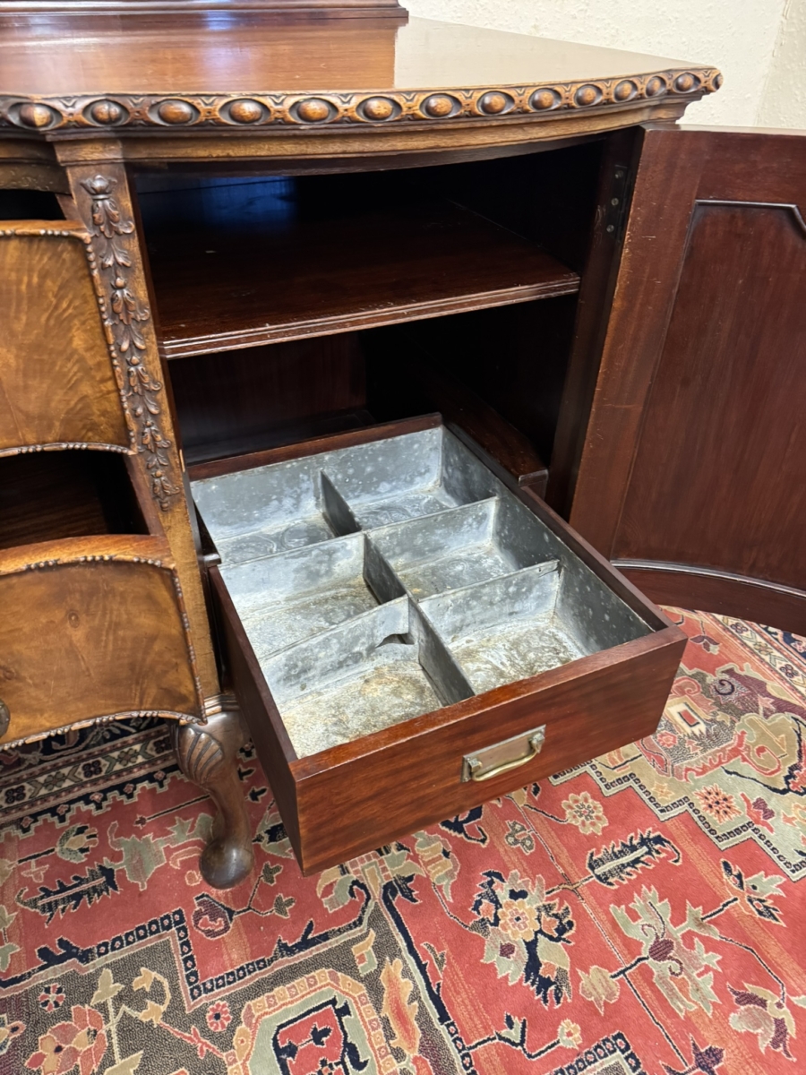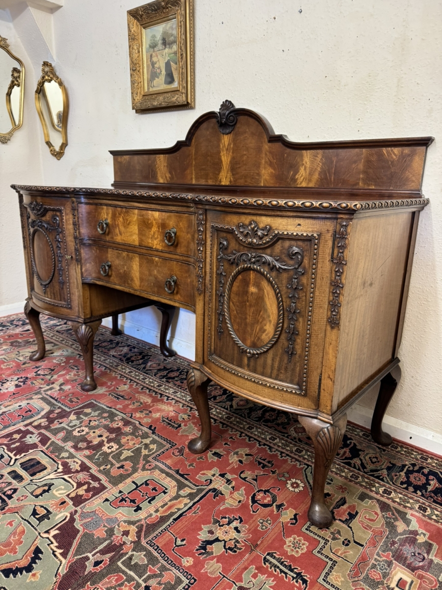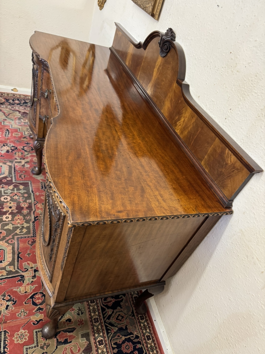This fabulous quality sideboard dates circa 1900 and is made in the highest quality mahogany. The shaped over sailing back rises to a central crest carving. The shaped top having carved decoration to the front and sides, below are a pair of central drawers, each drawer having a pair of brass ring handles. The central drawers are flanked by a super pair of curved carved cupboard doors. The left-hand door opens to reveal a drawer above a wooden shelf. The right-hand door opens to reveal a shelf above a sliding cellarette. Carved decoration through out and standing on eight elegant carved cabriole shaped legs. A striking piece to enhance any interior.