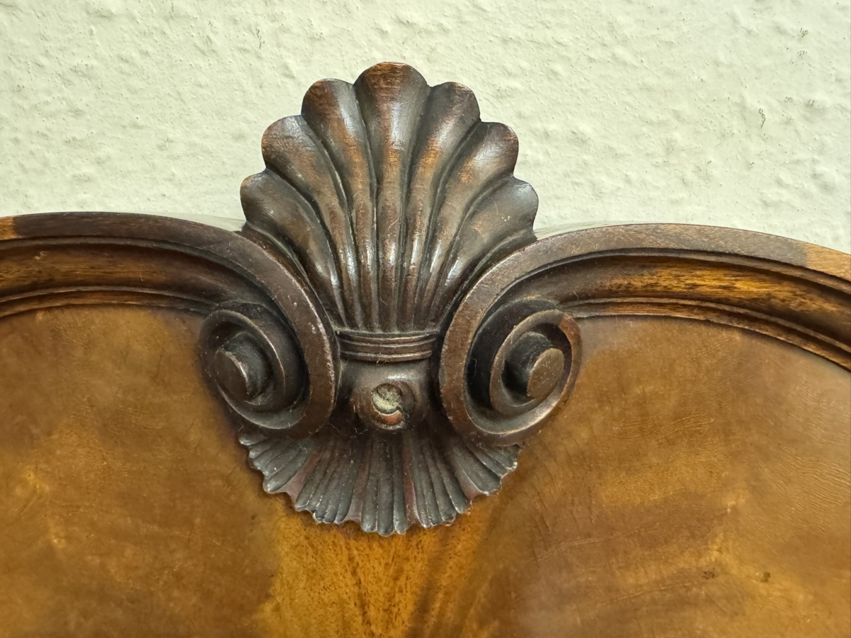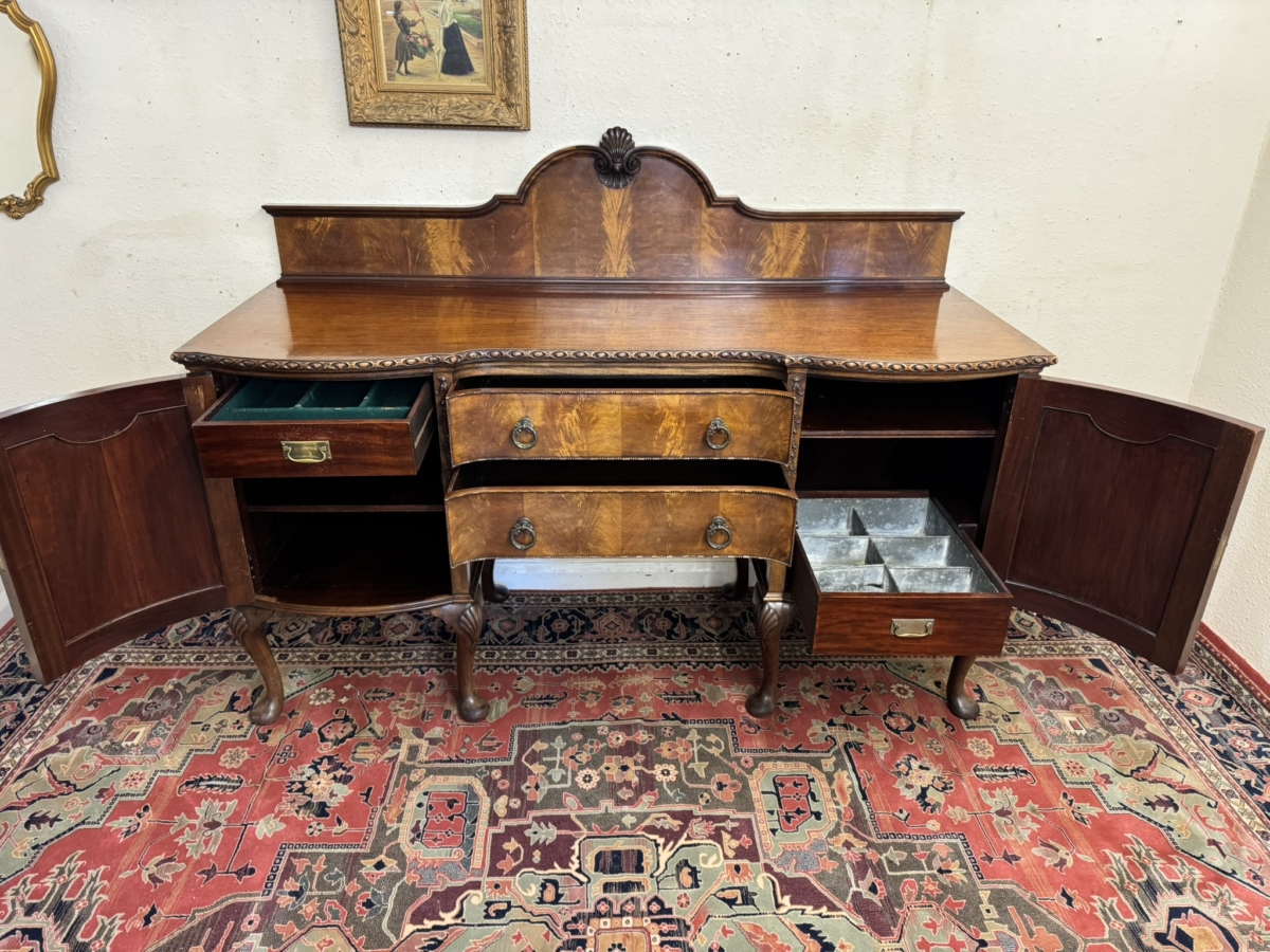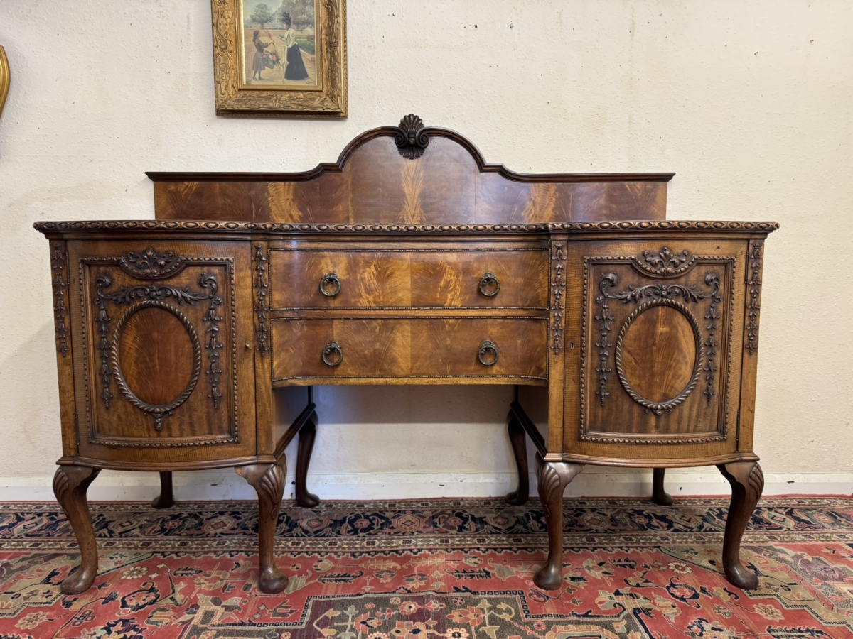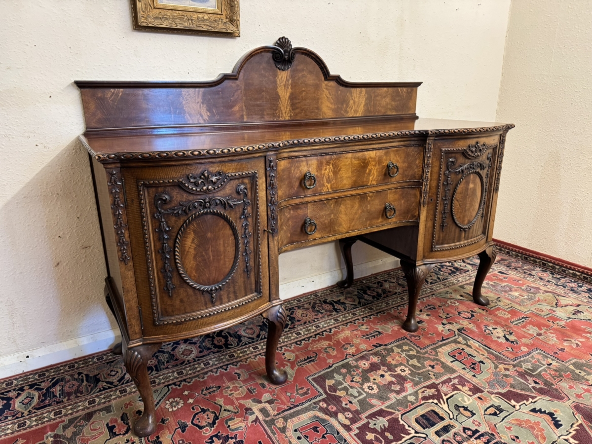 This fabulous quality sideboard dates circa 1900 and is made in the highest quality mahogany. The shaped over sailing back rises to a central crest carving. The shaped top having carved decoration to the front and sides, below are a pair of central drawers, each drawer having a pair of brass ring handles. The central drawers are flanked by a super pair of curved carved cupboard doors. The left-hand door opens to reveal a drawer above a wooden shelf. The right-hand door opens to reveal a shelf above a sliding cellarette. Carved decoration through out and standing on eight elegant carved cabriole shaped legs. A striking piece to enhance any interior.