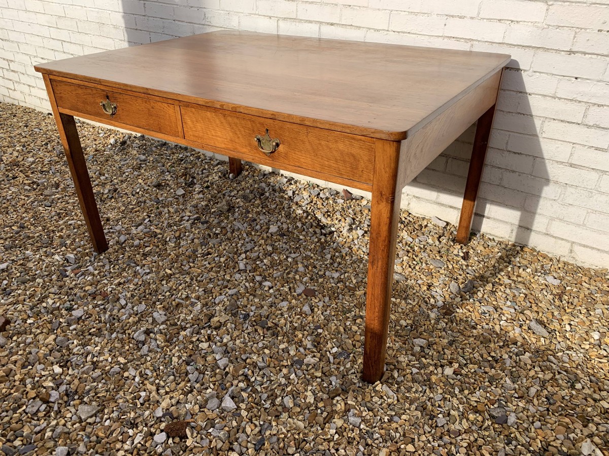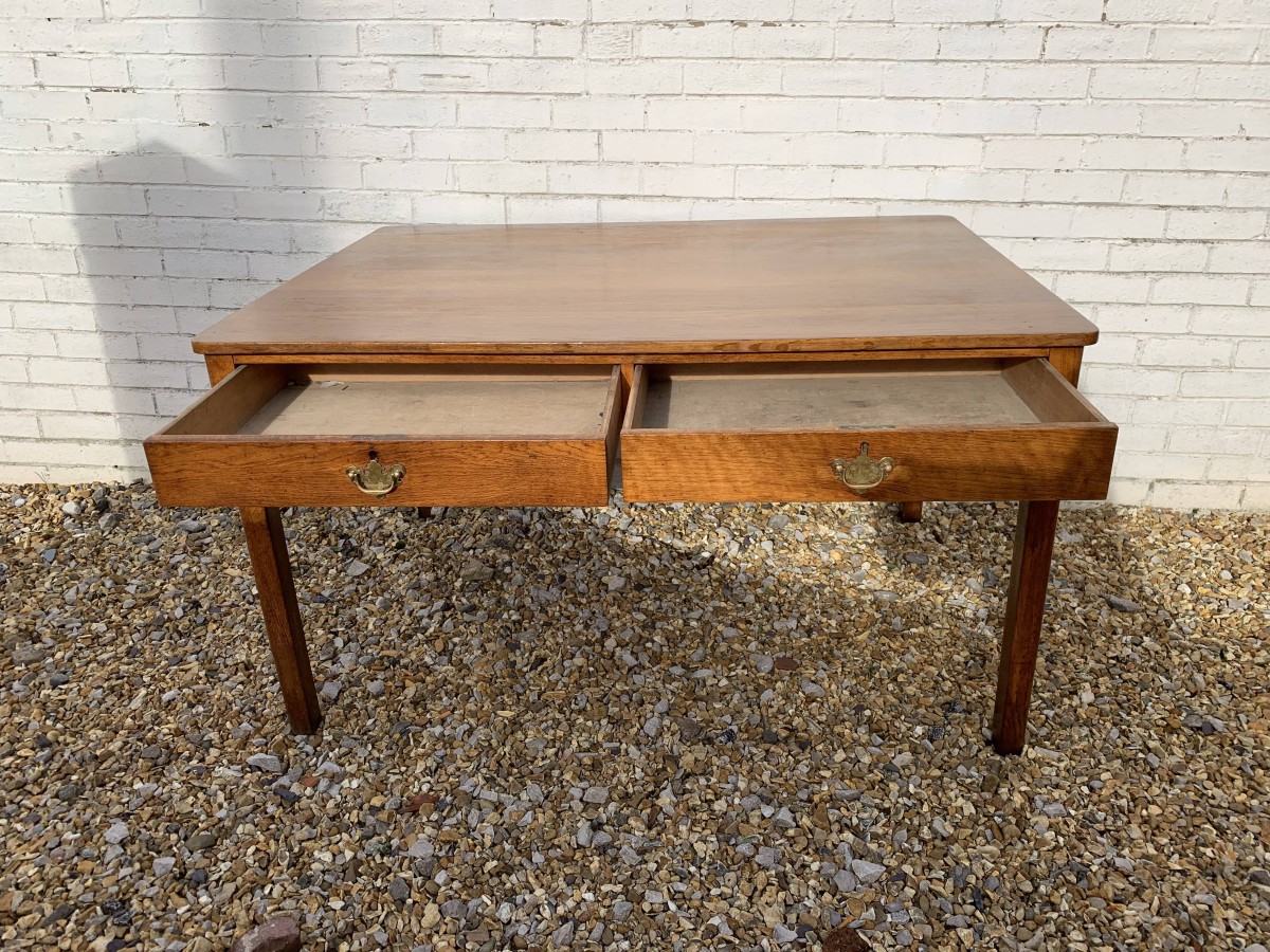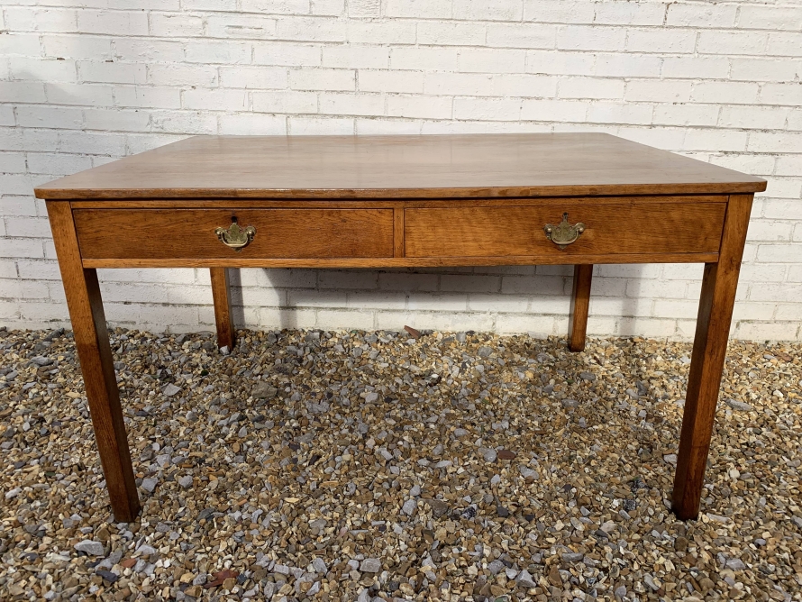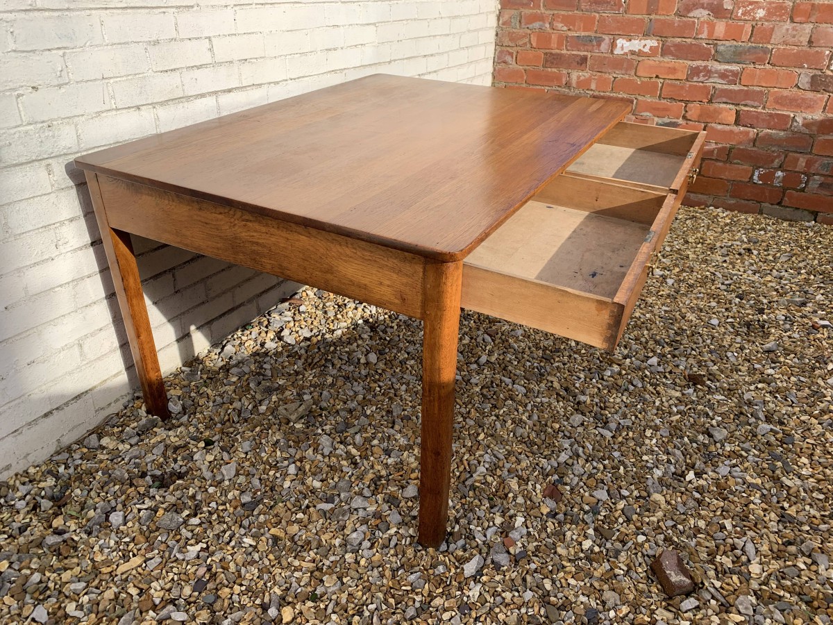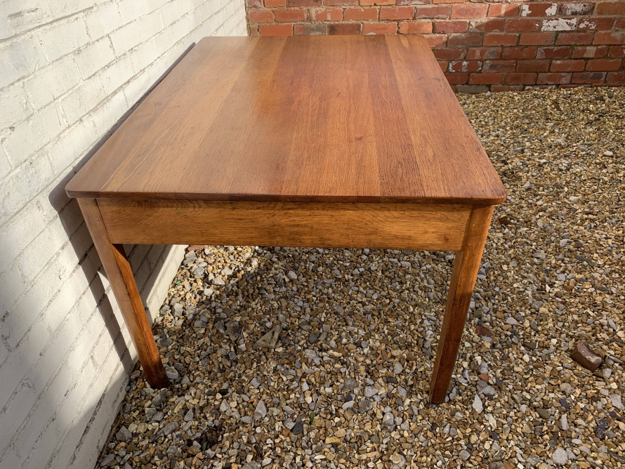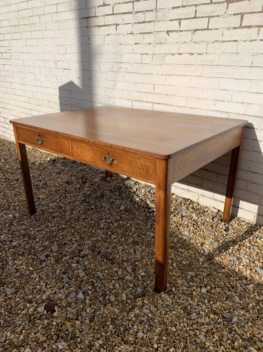 The table dates circa 1920, it was originally a drapers table and would now make a fabulous kitchen table or large desk for any home. Made in glorious oak the table has two drawers to the front, each drawer having a brass drop handle. The table sits on four square legs. Please note the platina of the oak is striking.