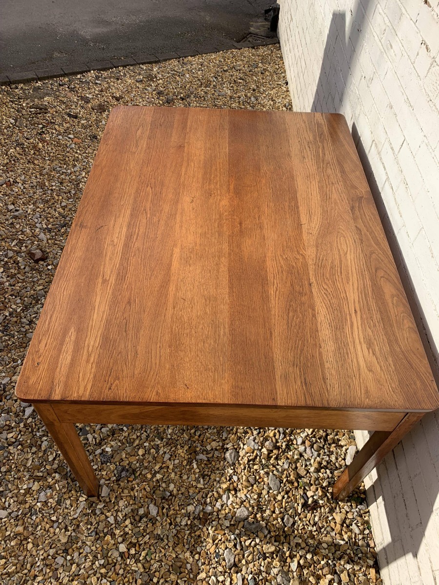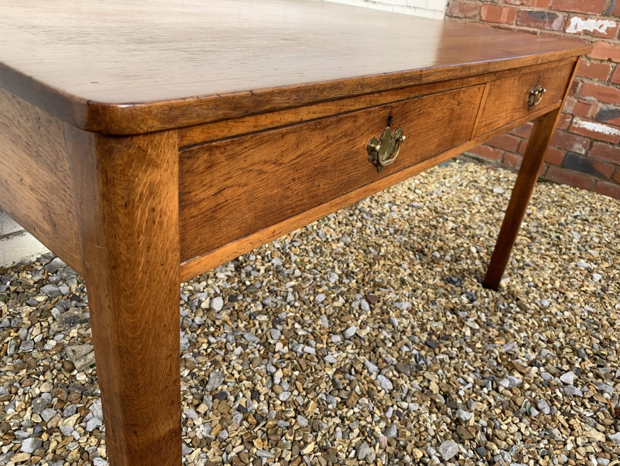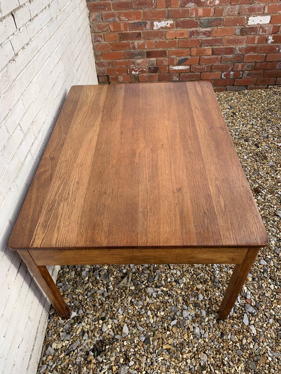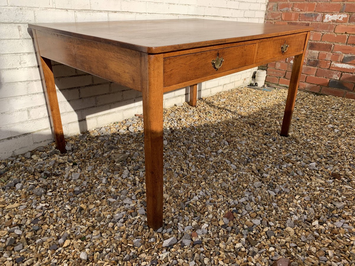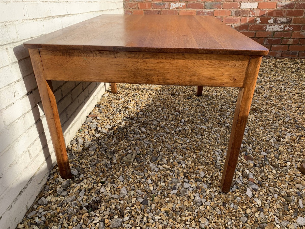 The table dates circa 1920, it was originally a drapers table and would now make a fabulous kitchen table or large desk for any home. Made in glorious oak the table has two drawers to the front, each drawer having a brass drop handle. The table sits on four square legs. Please note the platina of the oak is striking.