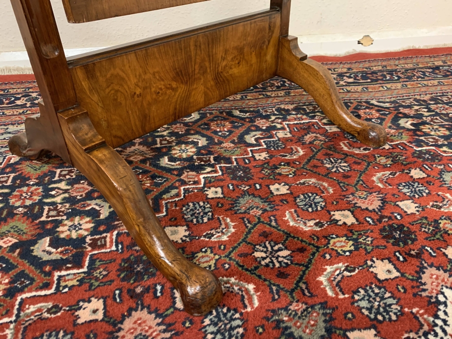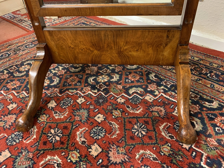 The mirror dates circa 1920. The frame of the mirror and the stand are made in striking walnut. The mirror has a shaped top the frame having turned finials to the top and standing on four shaped legs with pad feet.