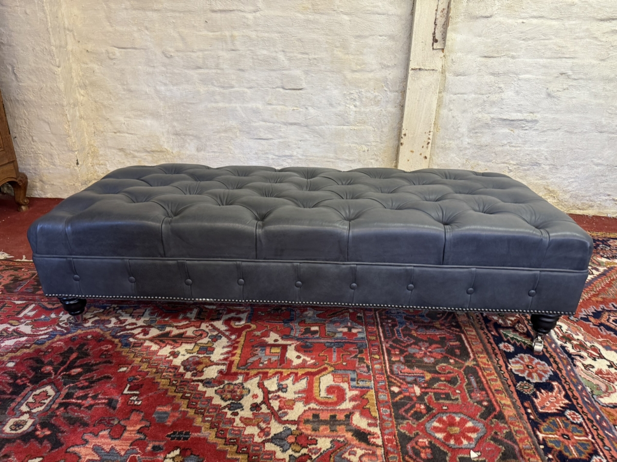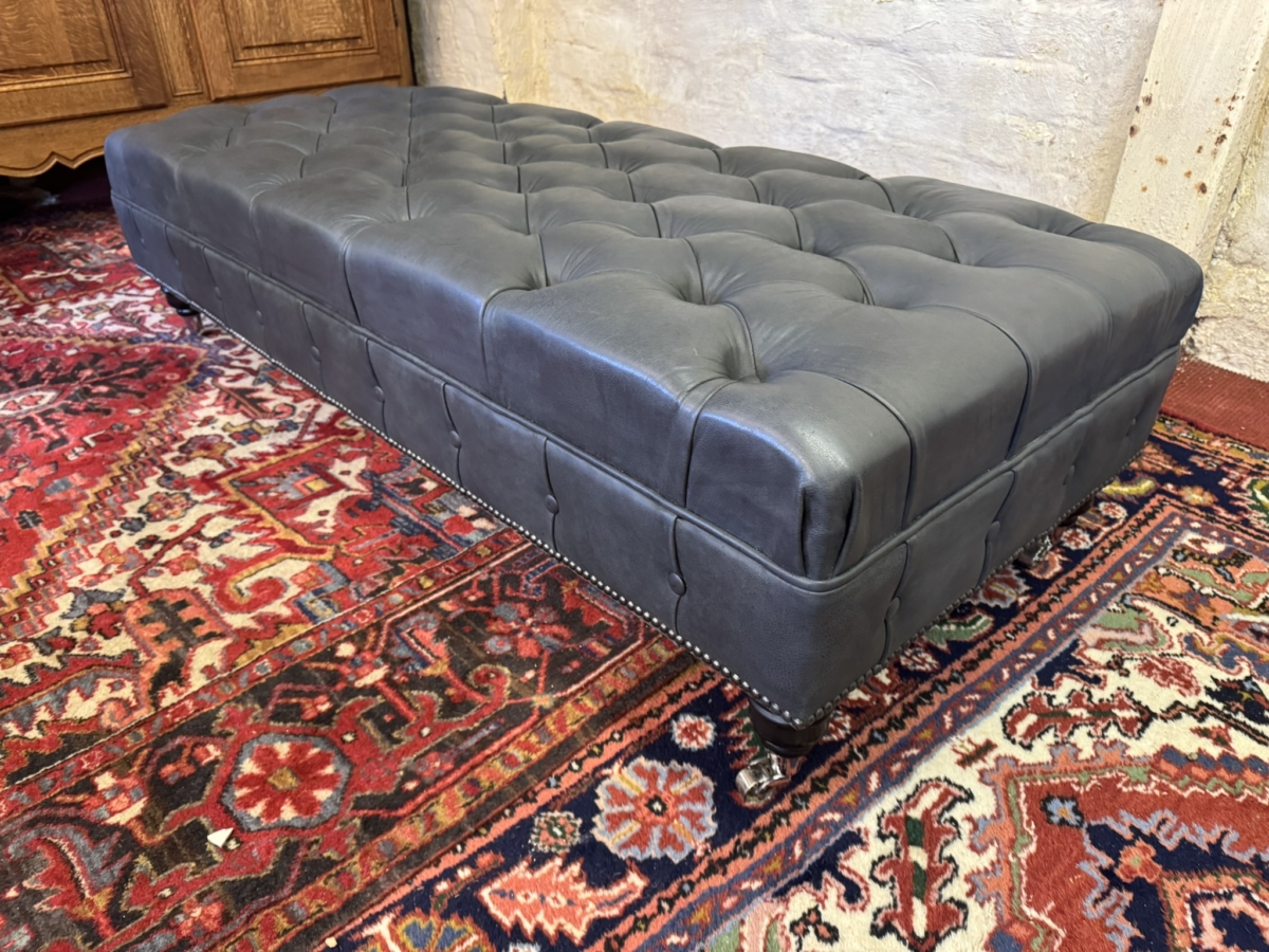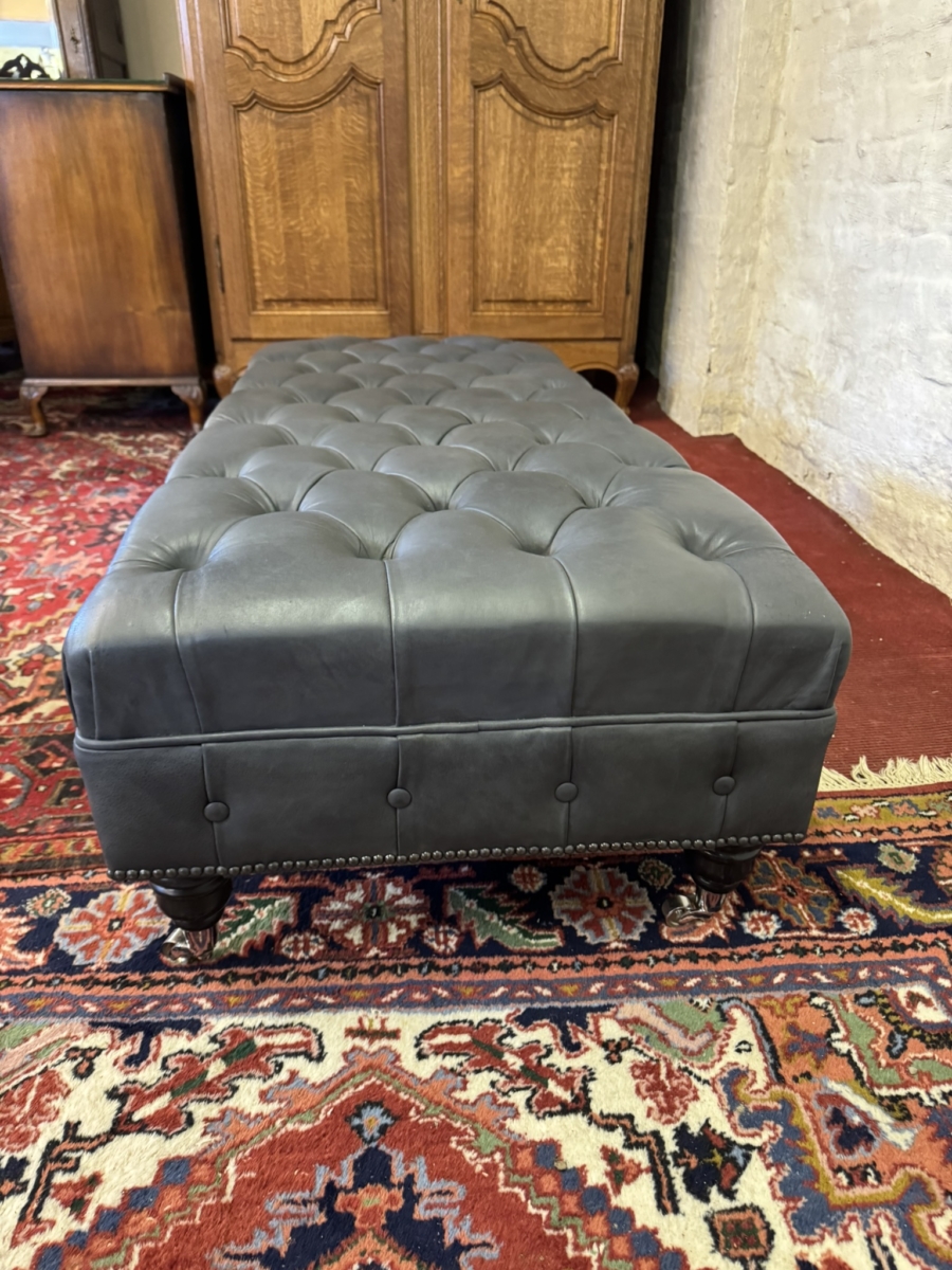 This super sized footstool is upholstered in a fabulous bluey grey leather. Deep buttoned cushioned top, buttoned and studied decoration, standing on four turned legs on casters. Please note we are also listing a matching sofa (as pictured)