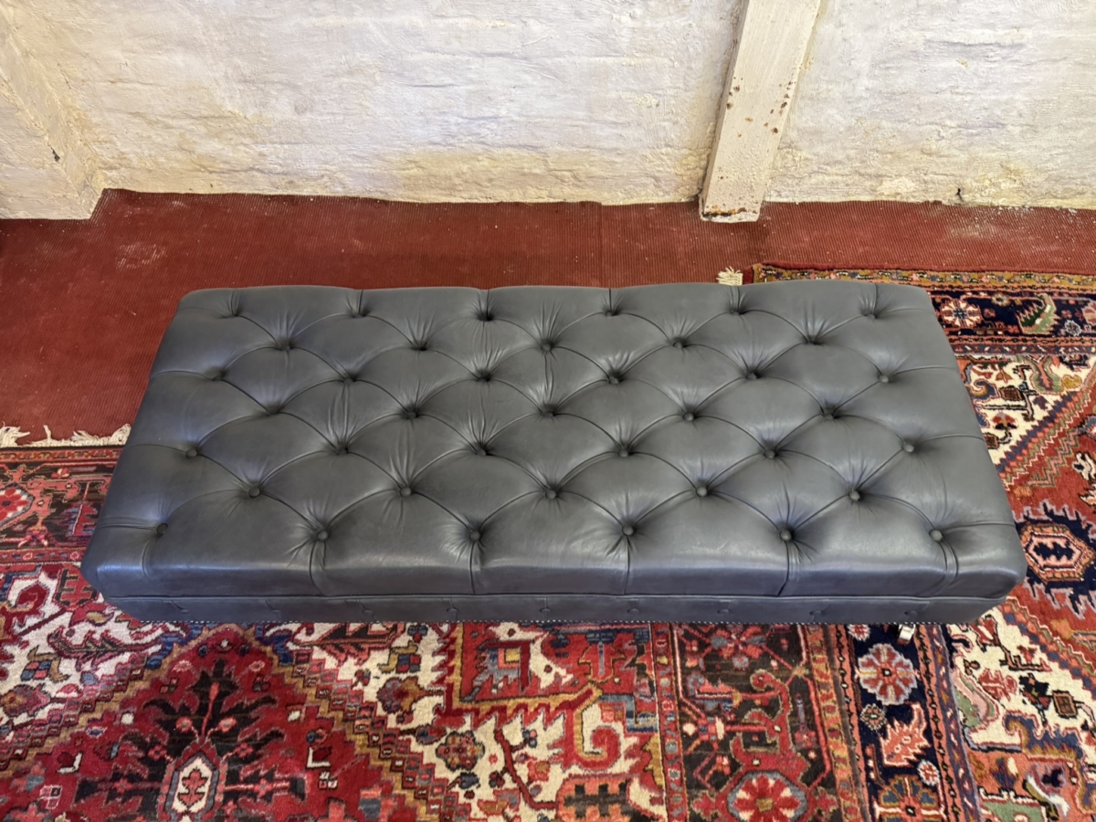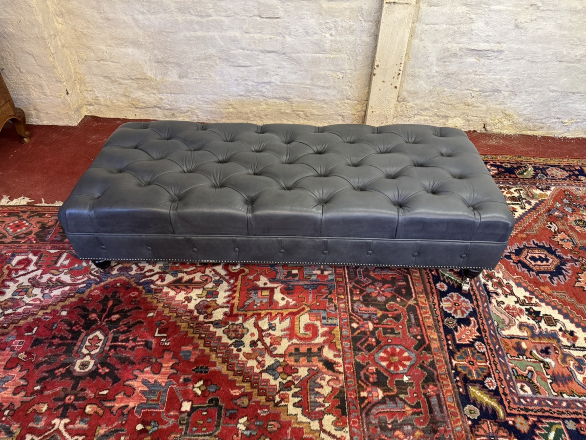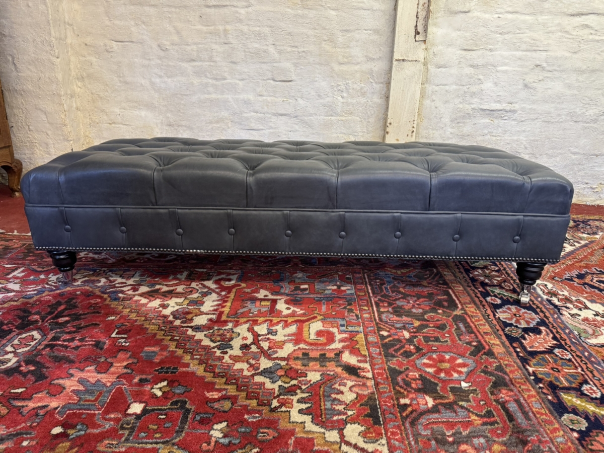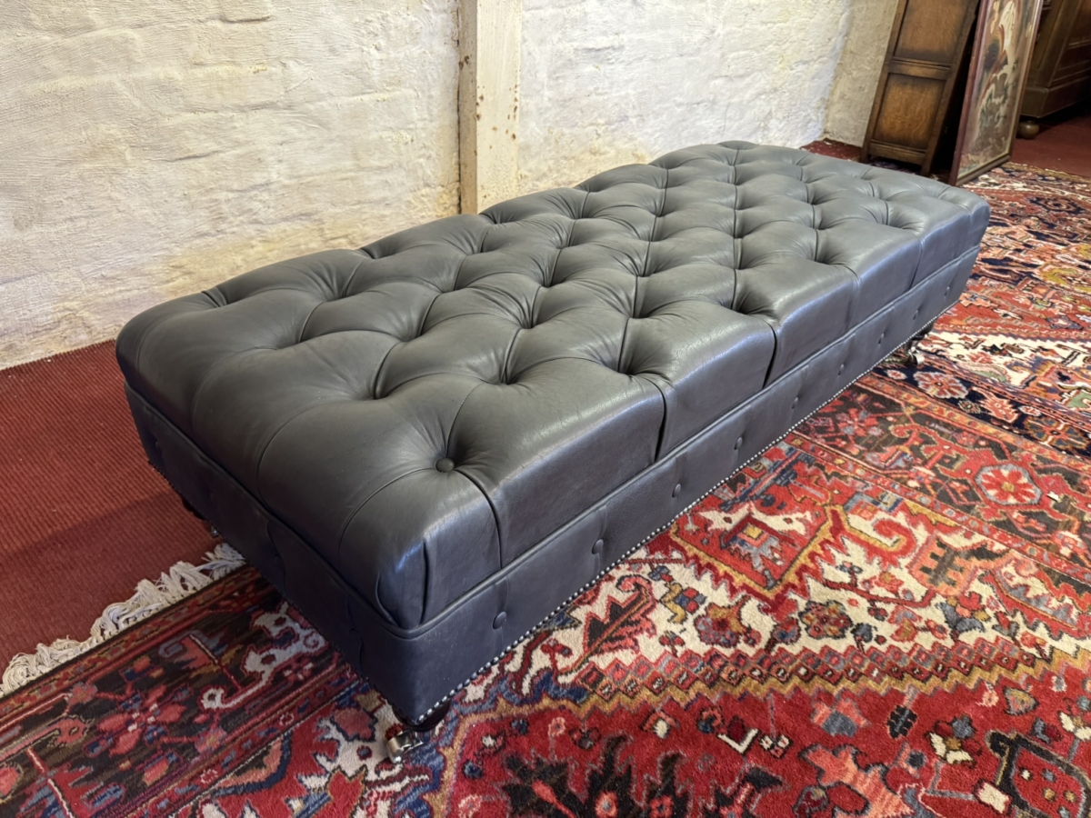 This super sized footstool is upholstered in a fabulous bluey grey leather. Deep buttoned cushioned top, buttoned and studied decoration, standing on four turned legs on casters. Please note we are also listing a matching sofa (as pictured)