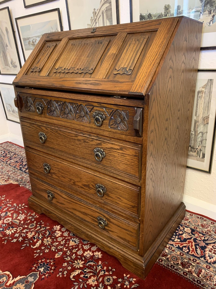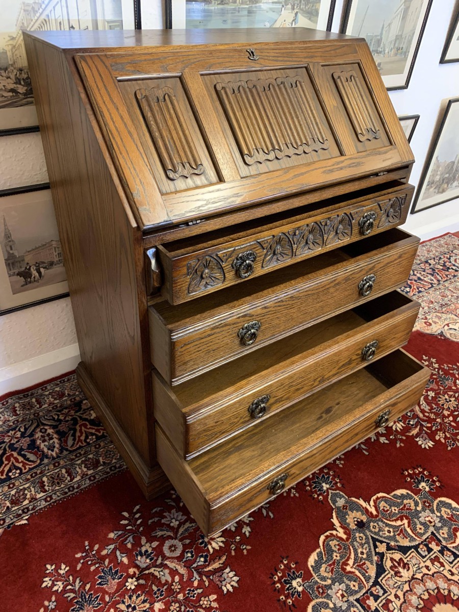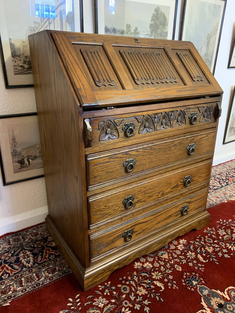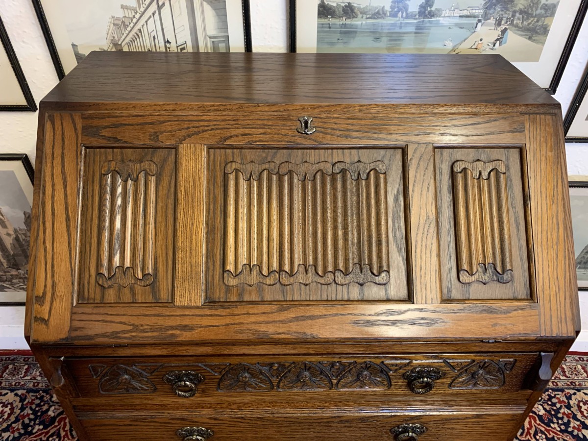 A super quality item produce by the renowned “Old Charm” furniture company. The linen fold carved fall front opens to reveal a green leather with gilt tooling writting surface which sits on retractable rests. The inside has two carved cupboards and stationary pigeon holes. Below are four drawers, the top drawer having ornate carving. The item sits on a plinth base. TOP QUALITY