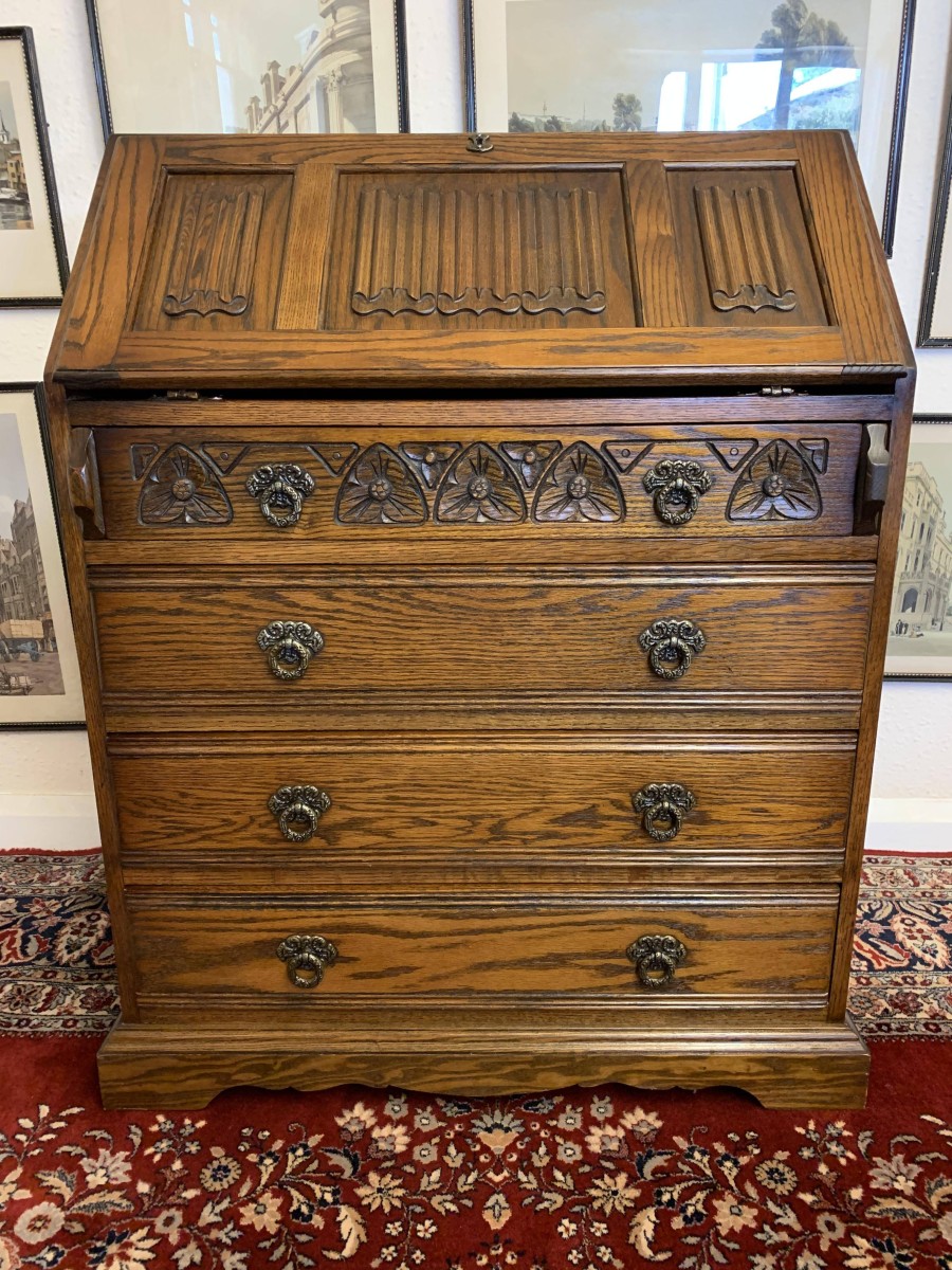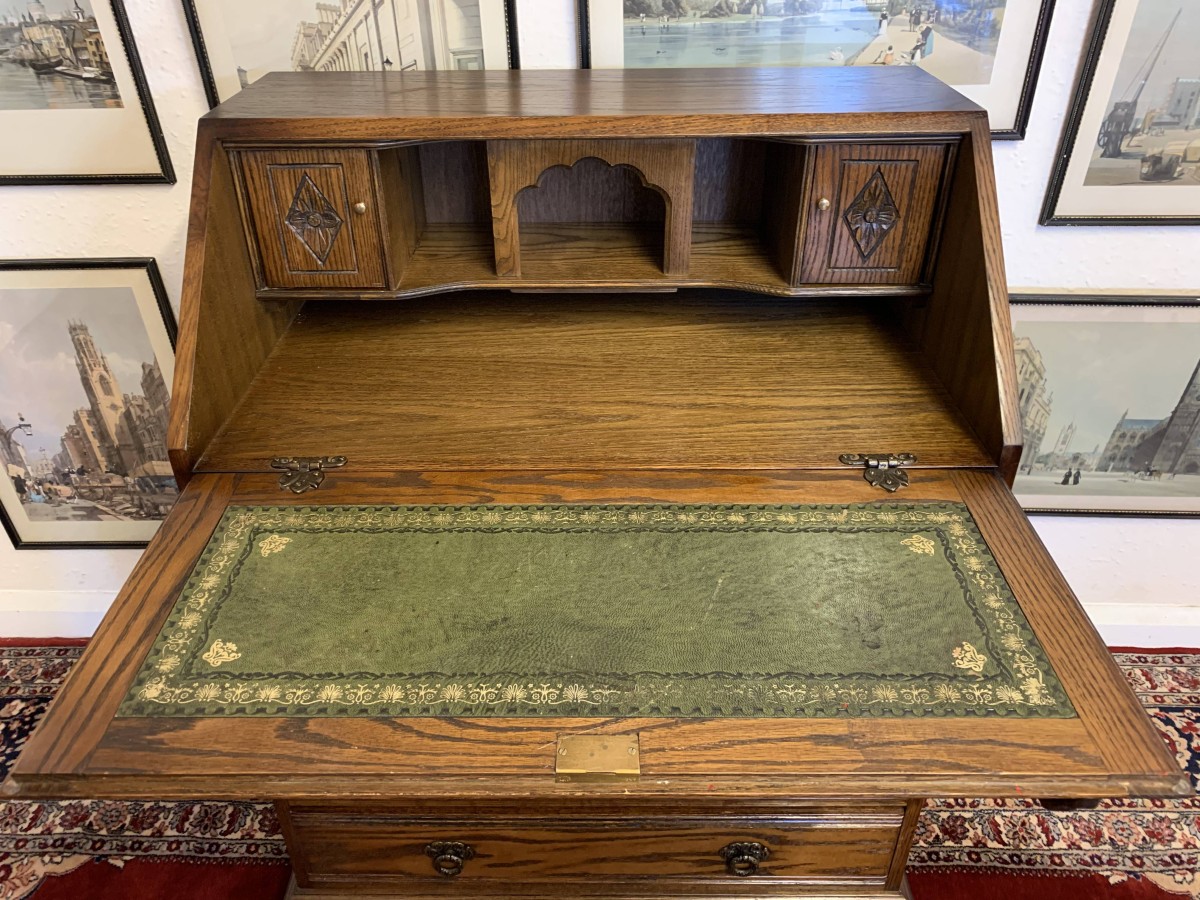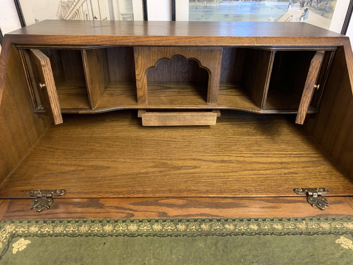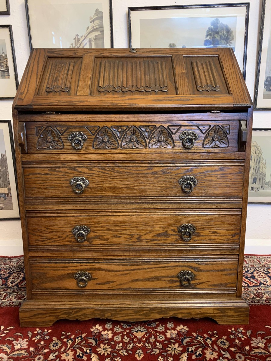 A super quality item produce by the renowned “Old Charm” furniture company. The linen fold carved fall front opens to reveal a green leather with gilt tooling writting surface which sits on retractable rests. The inside has two carved cupboards and stationary pigeon holes. Below are four drawers, the top drawer having ornate carving. The item sits on a plinth base. TOP QUALITY