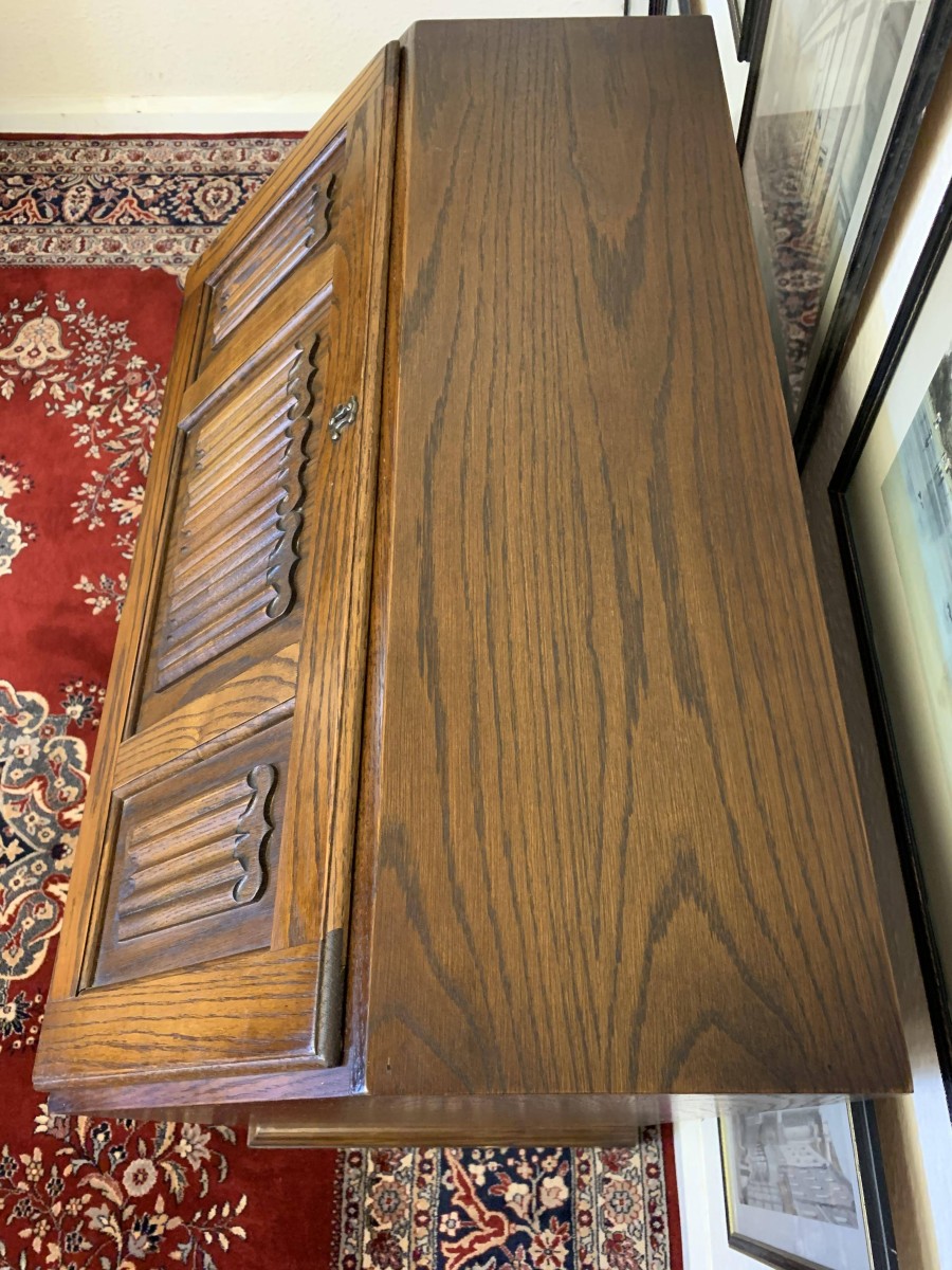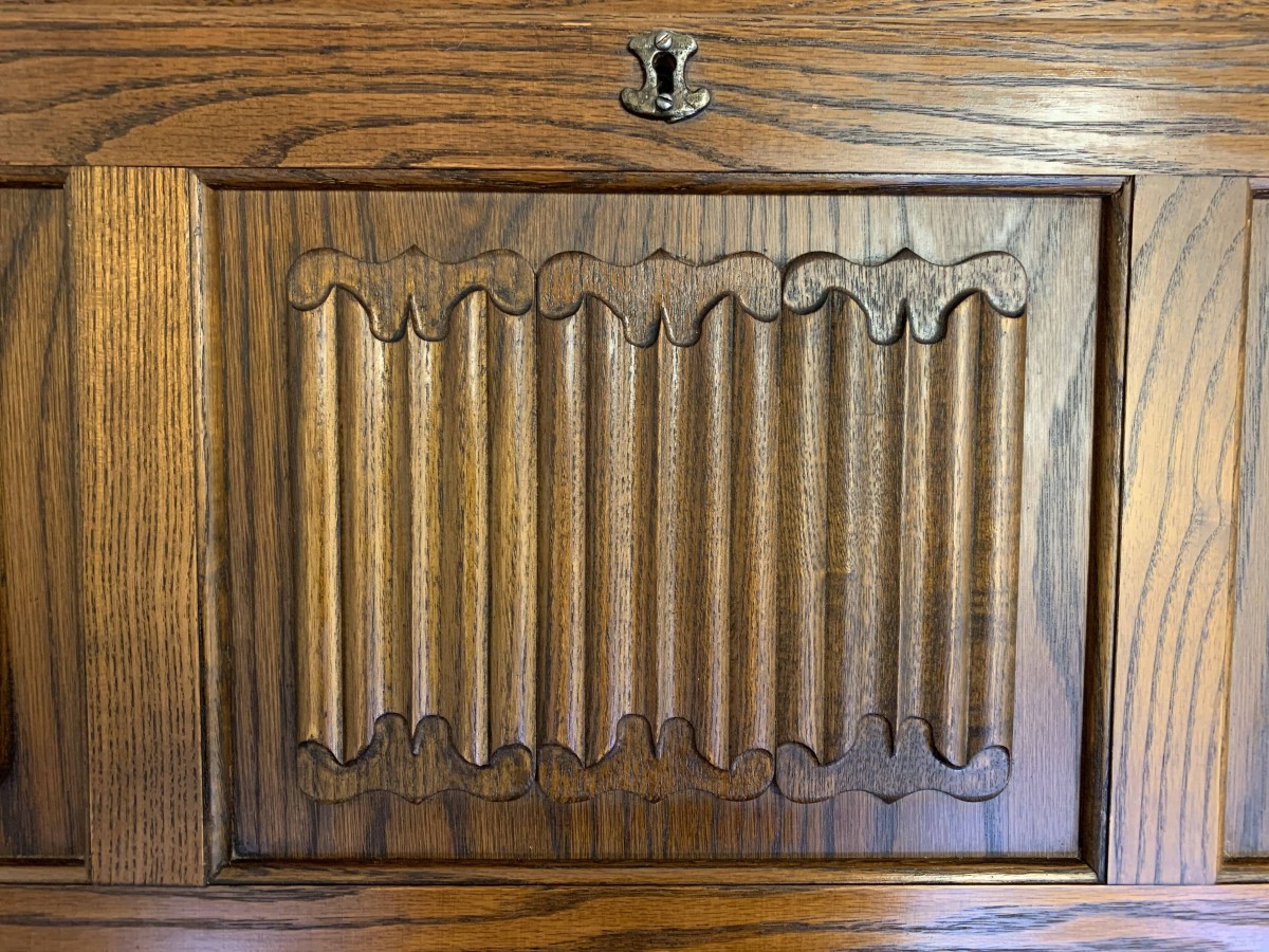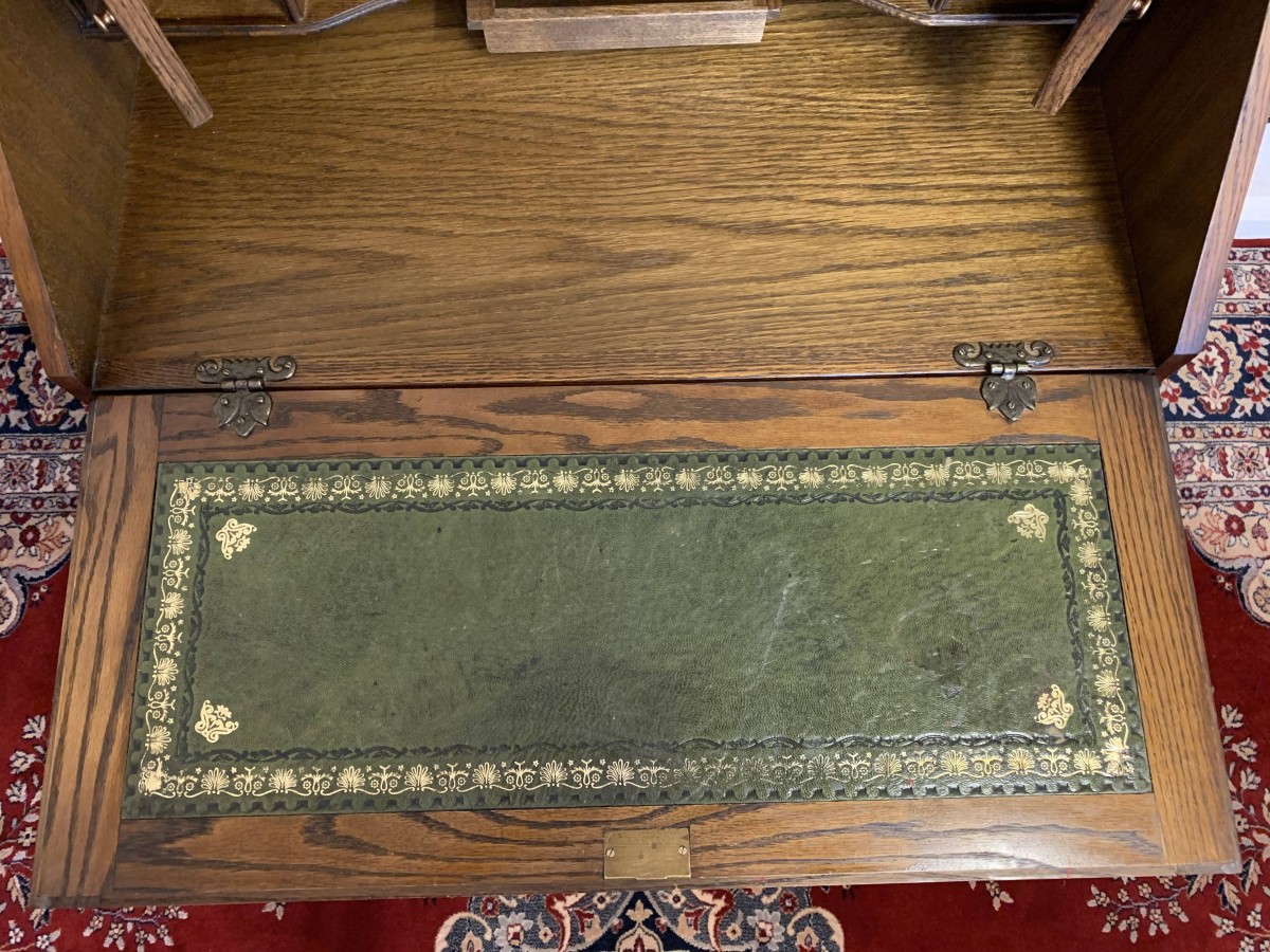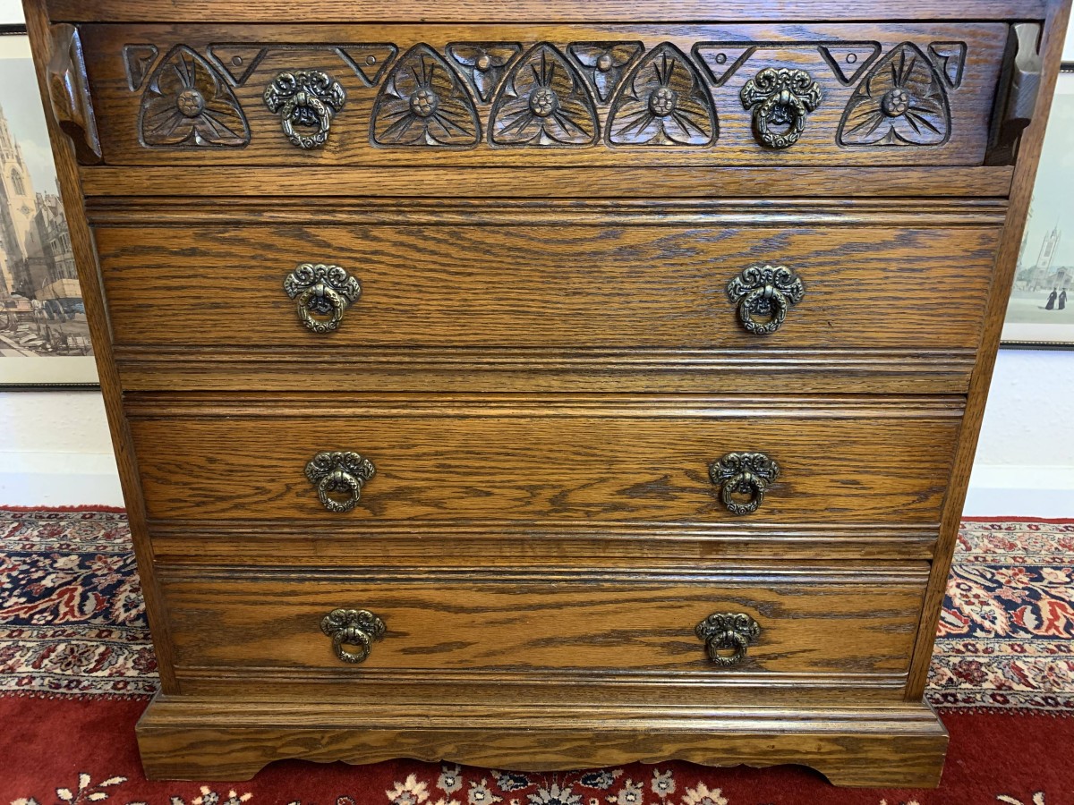 A super quality item produce by the renowned “Old Charm” furniture company. The linen fold carved fall front opens to reveal a green leather with gilt tooling writting surface which sits on retractable rests. The inside has two carved cupboards and stationary pigeon holes. Below are four drawers, the top drawer having ornate carving. The item sits on a plinth base. TOP QUALITY