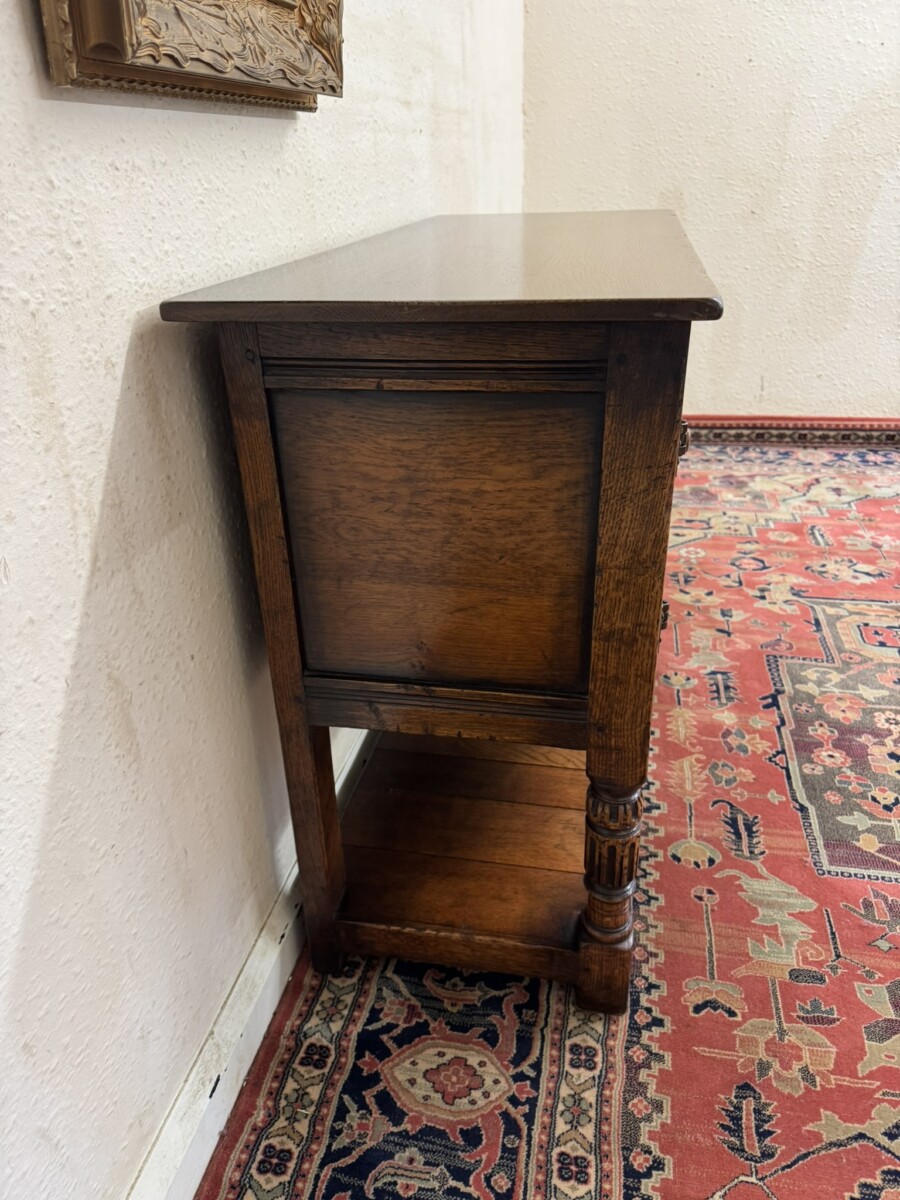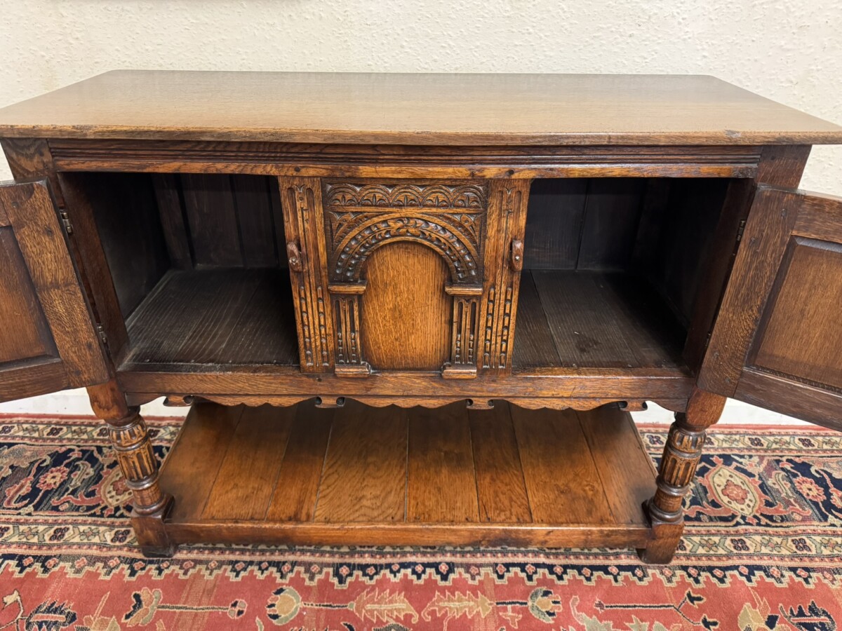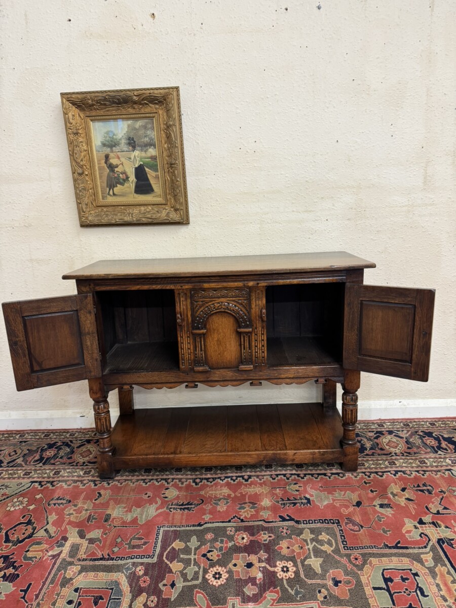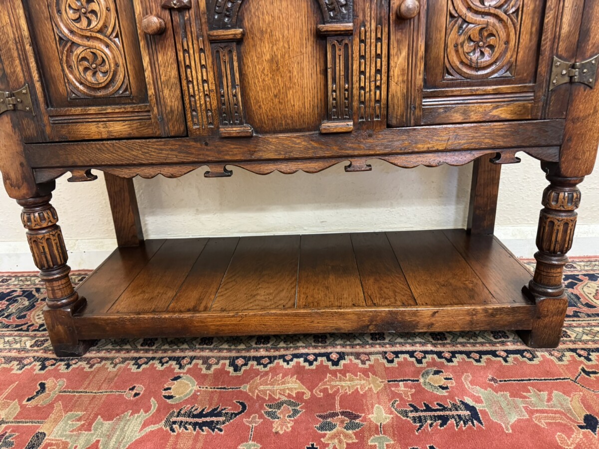 A super cupboard made by the renowned Titchmarsh and Goodwin furniture makers which is in excellent condition. The over sailing top sits above a central carved solid panel, the panel is flanked by a pair of lockable doors, each door having hinges, turned handle and wood locking latch. The doors open to reveal a boarded base and back. Boarded shelf below and standing on two turned carved legs to the front on traditional block feet.