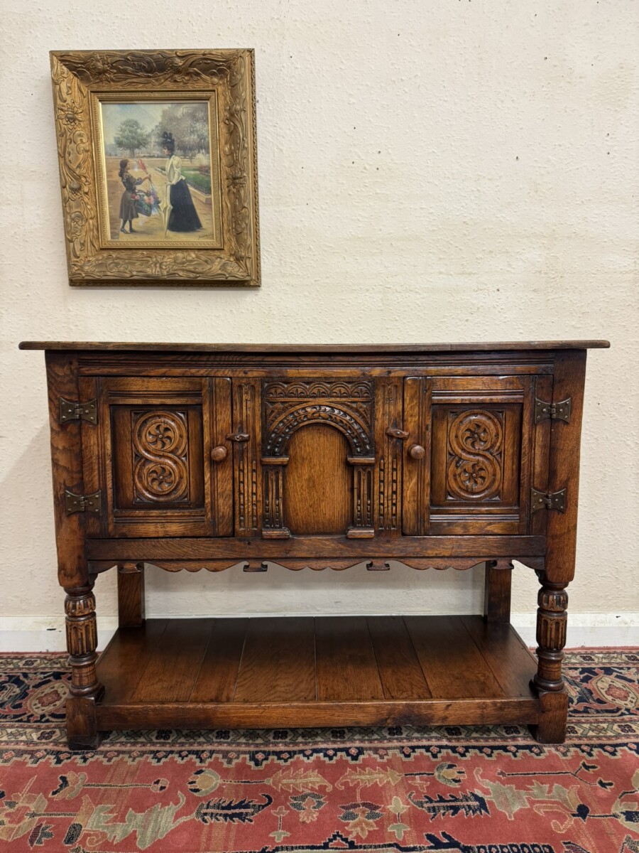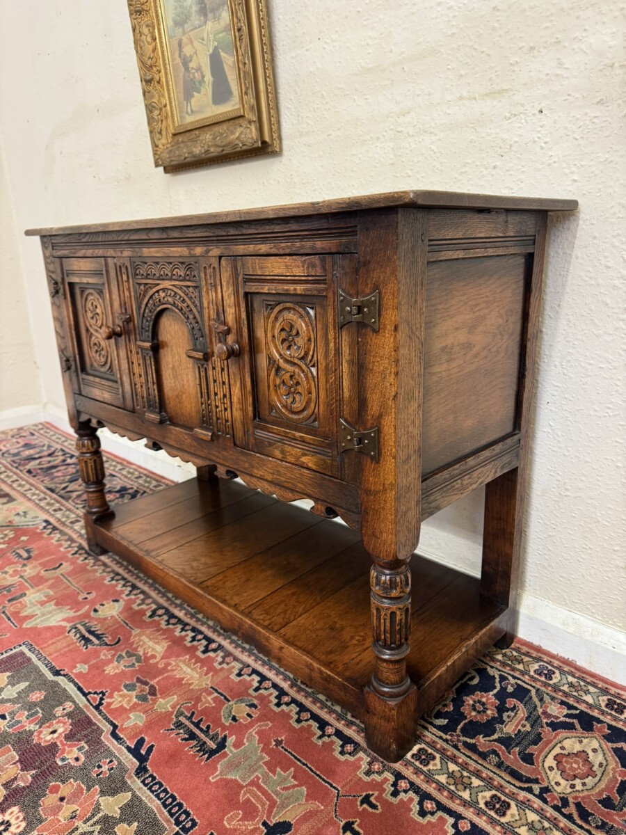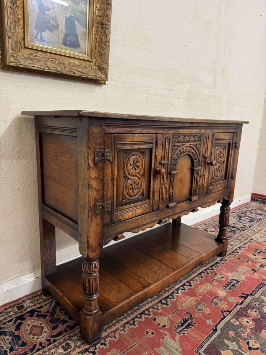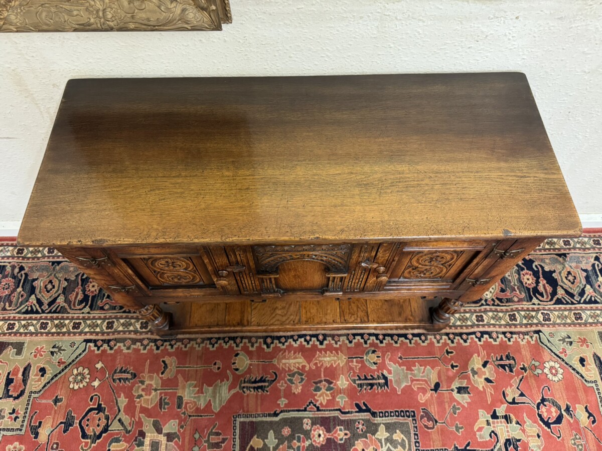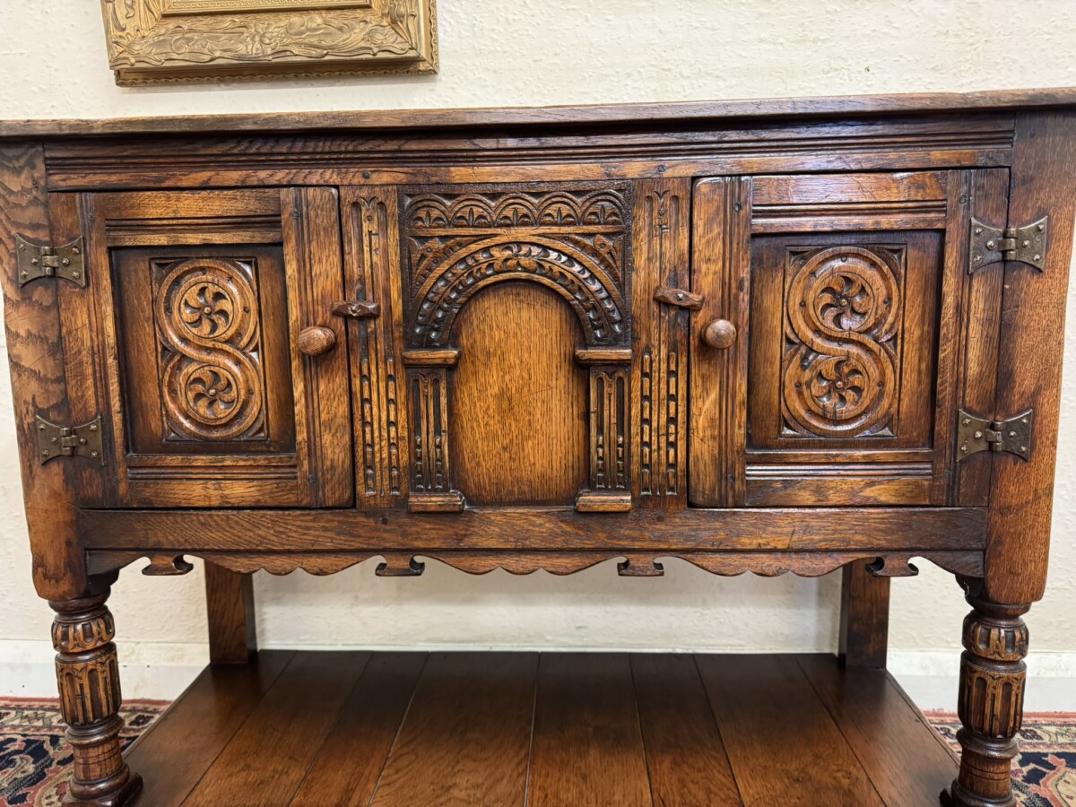 A super cupboard made by the renowned Titchmarsh and Goodwin furniture makers which is in excellent condition. The over sailing top sits above a central carved solid panel, the panel is flanked by a pair of lockable doors, each door having hinges, turned handle and wood locking latch. The doors open to reveal a boarded base and back. Boarded shelf below and standing on two turned carved legs to the front on traditional block feet.