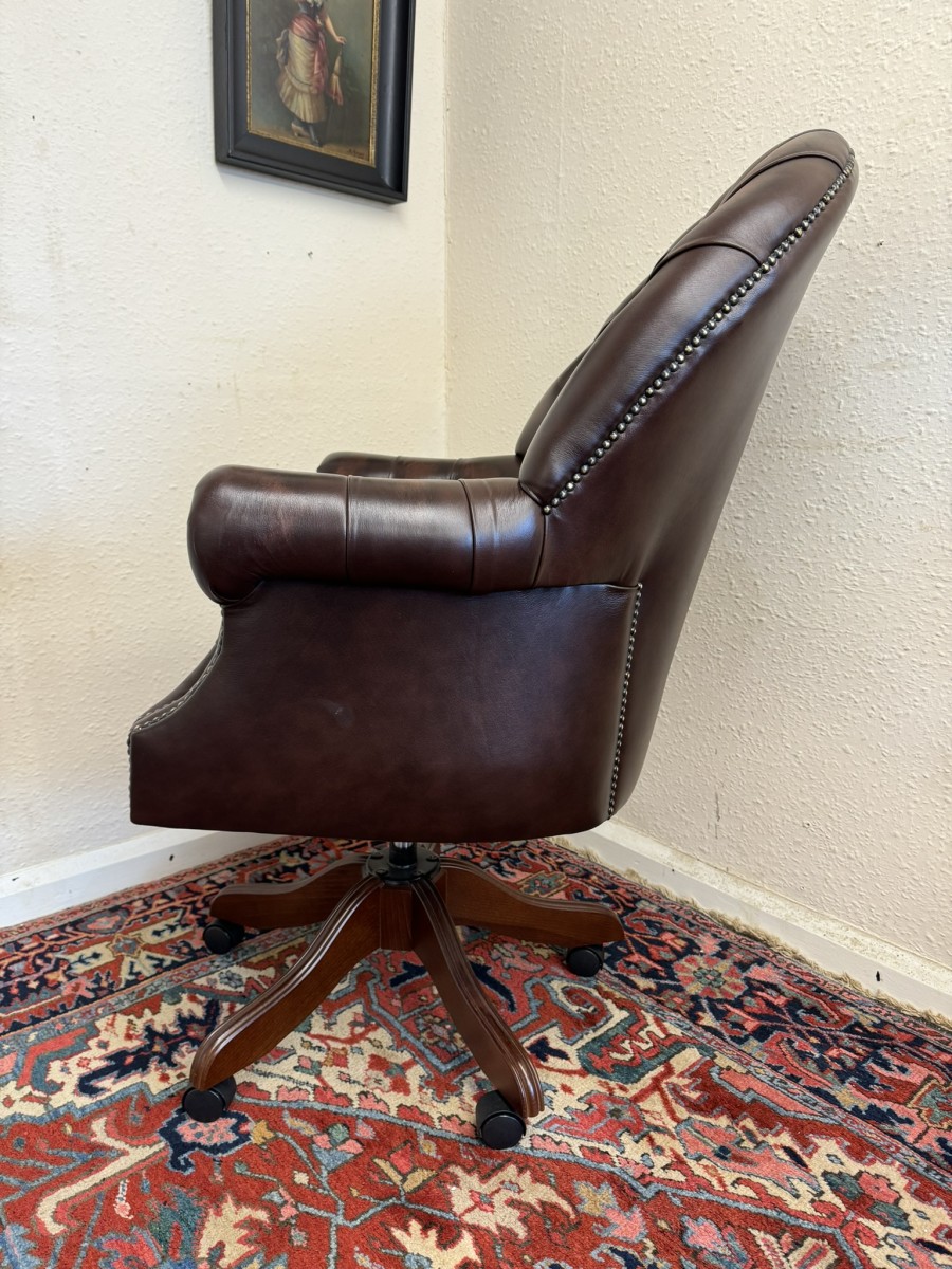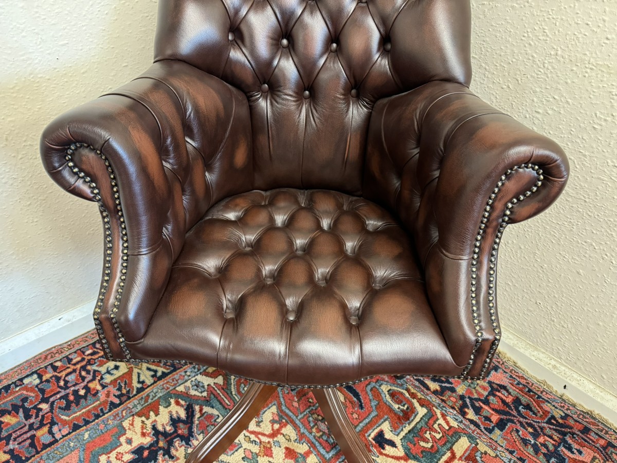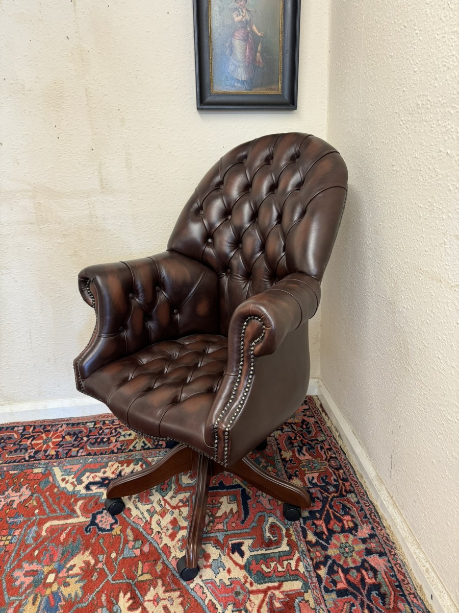 This stunning chair is in excellent condition. Classic Chesterfield directors office chair upholstered in a fabulous antique brown deep buttoned leather with brass studded decoration. Rise and fall mechanism to suit personal height, five out swept legs on large casters enabling easy movement.