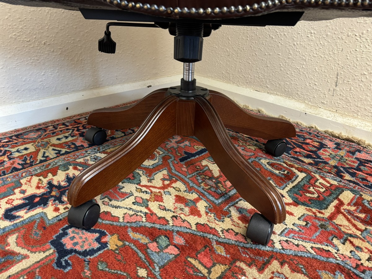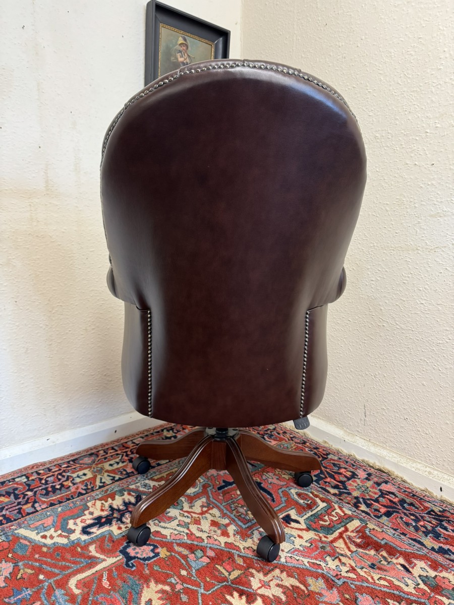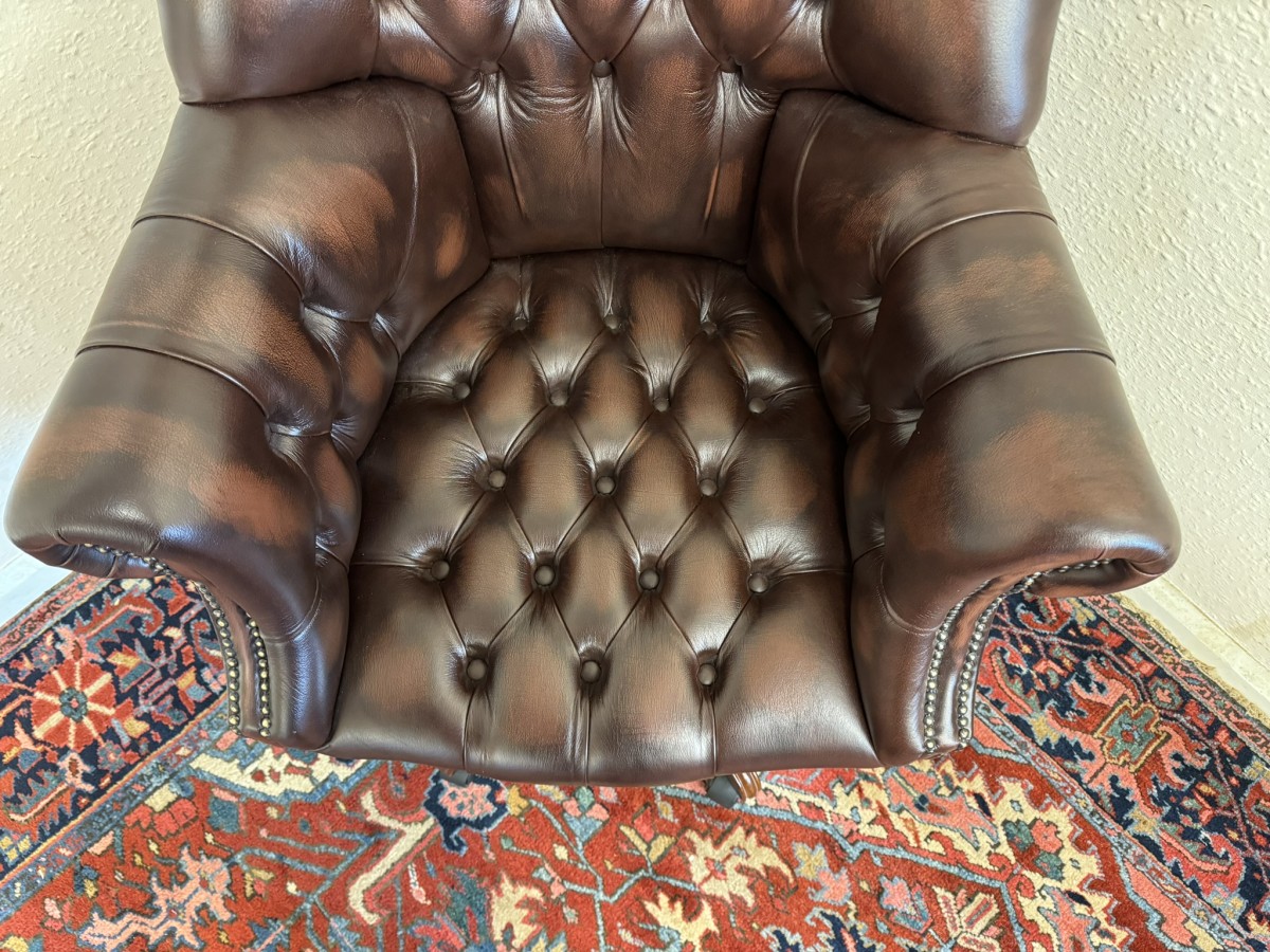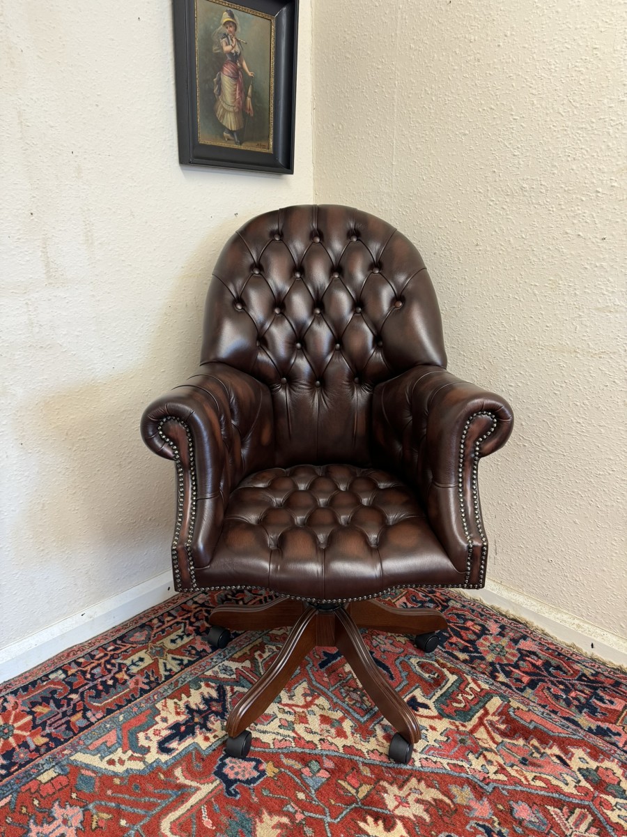 This stunning chair is in excellent condition. Classic Chesterfield directors office chair upholstered in a fabulous antique brown deep buttoned leather with brass studded decoration. Rise and fall mechanism to suit personal height, five out swept legs on large casters enabling easy movement.