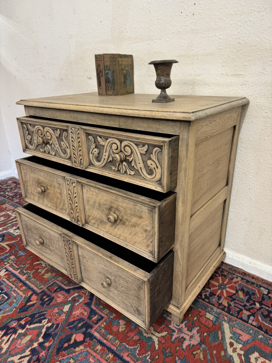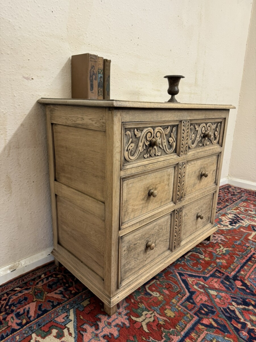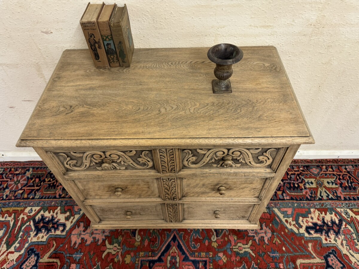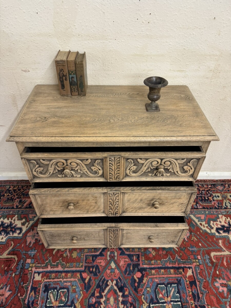 The chest dates circa 1920. The fabulous grained oak top sits above three drawers, the top drawer having elaborate carving. Recessed panelled sides and standing on traditional block feet.