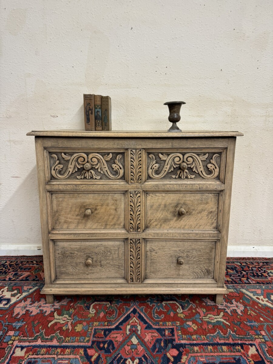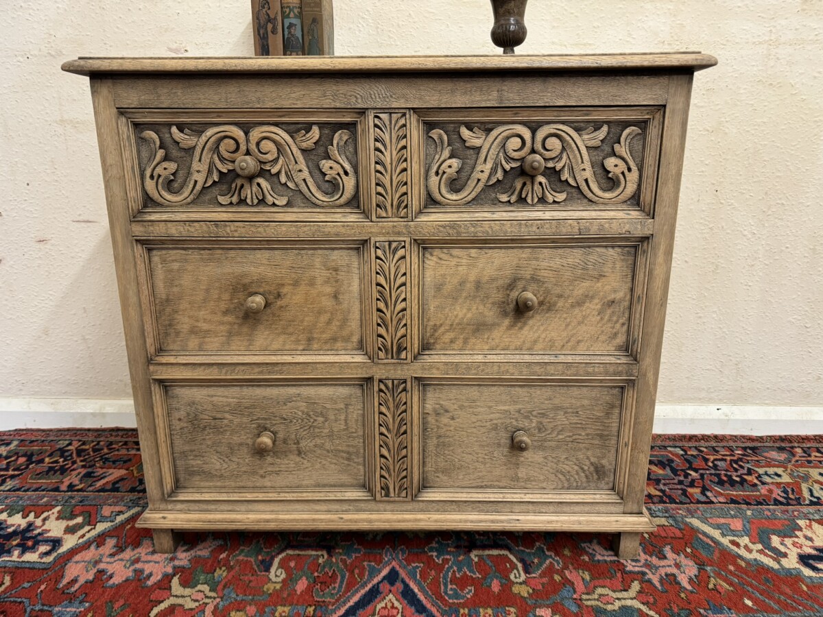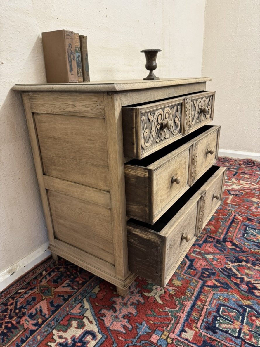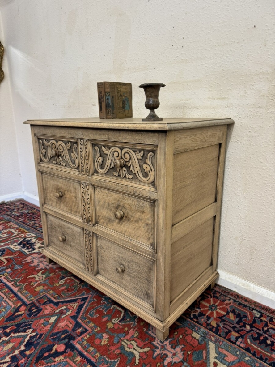 The chest dates circa 1920. The fabulous grained oak top sits above three drawers, the top drawer having elaborate carving. Recessed panelled sides and standing on traditional block feet.