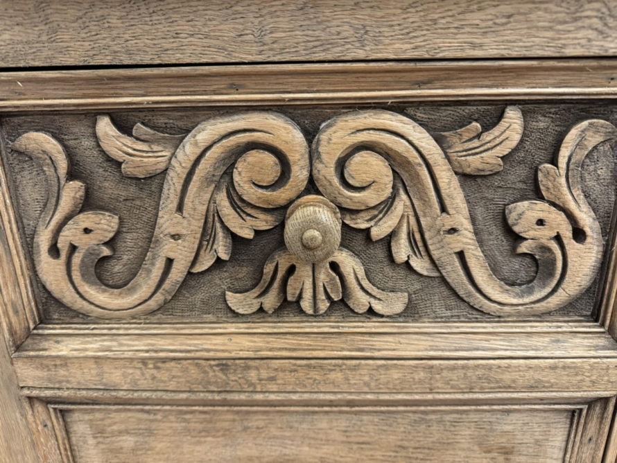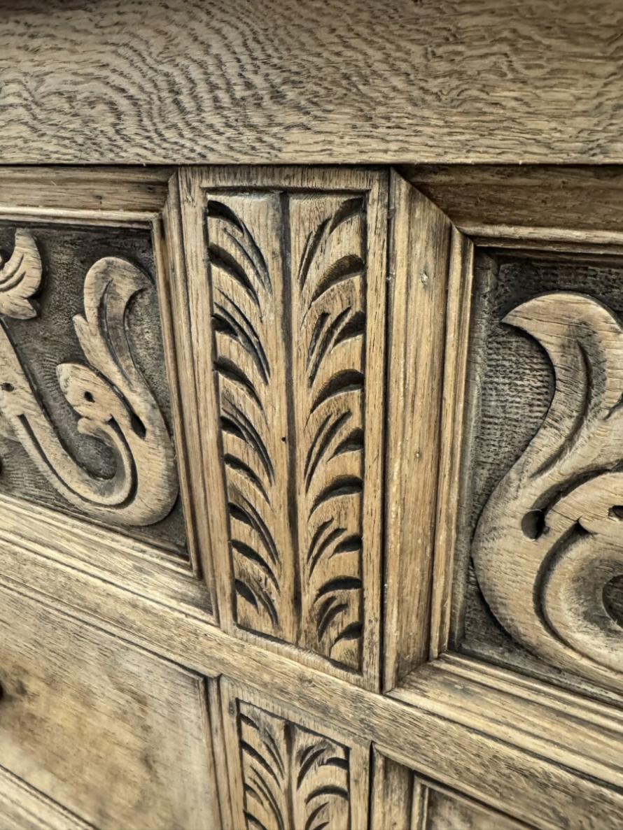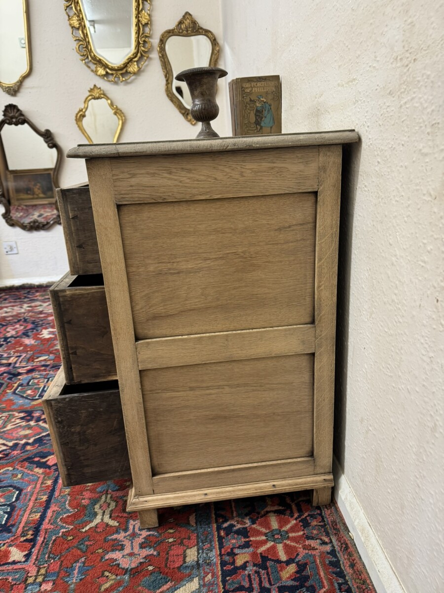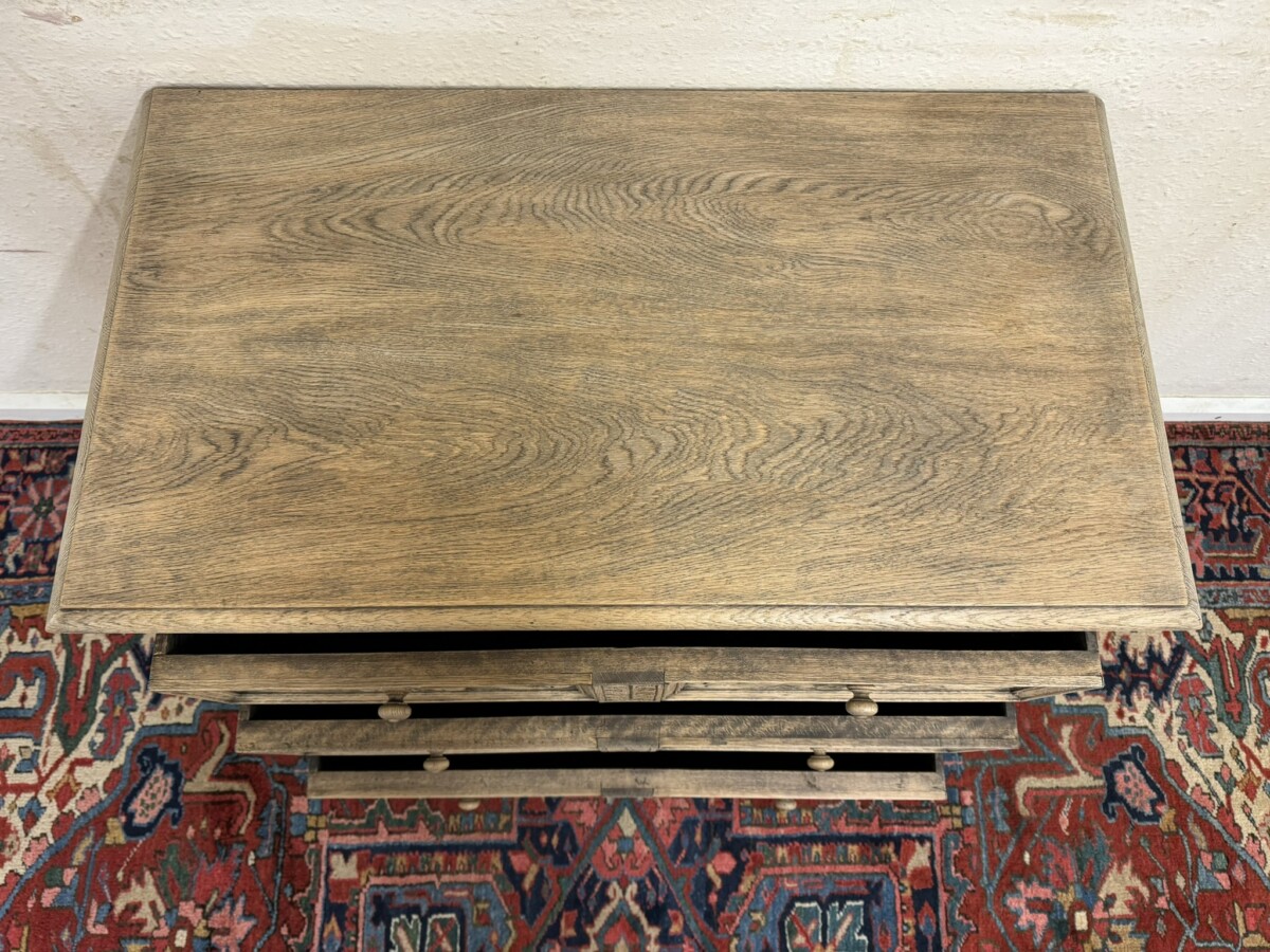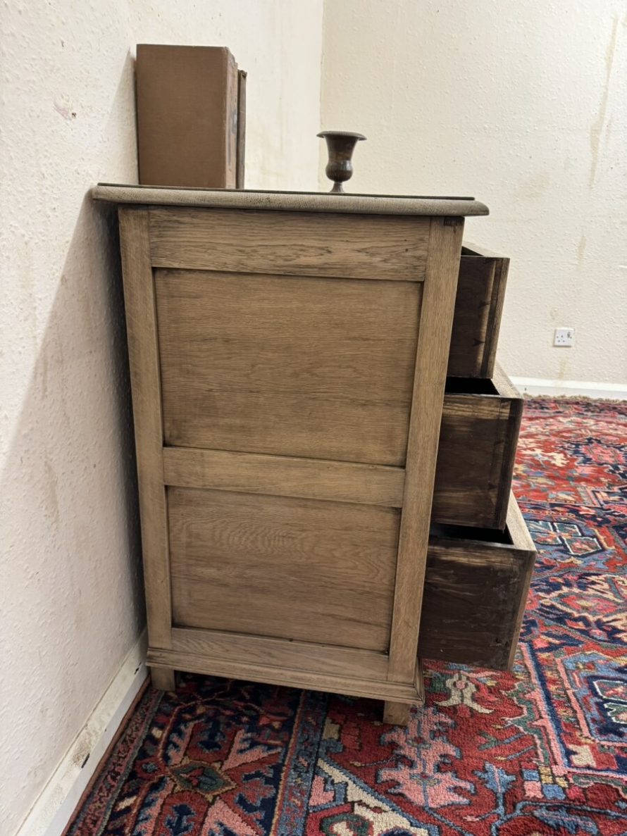 The chest dates circa 1920. The fabulous grained oak top sits above three drawers, the top drawer having elaborate carving. Recessed panelled sides and standing on traditional block feet.